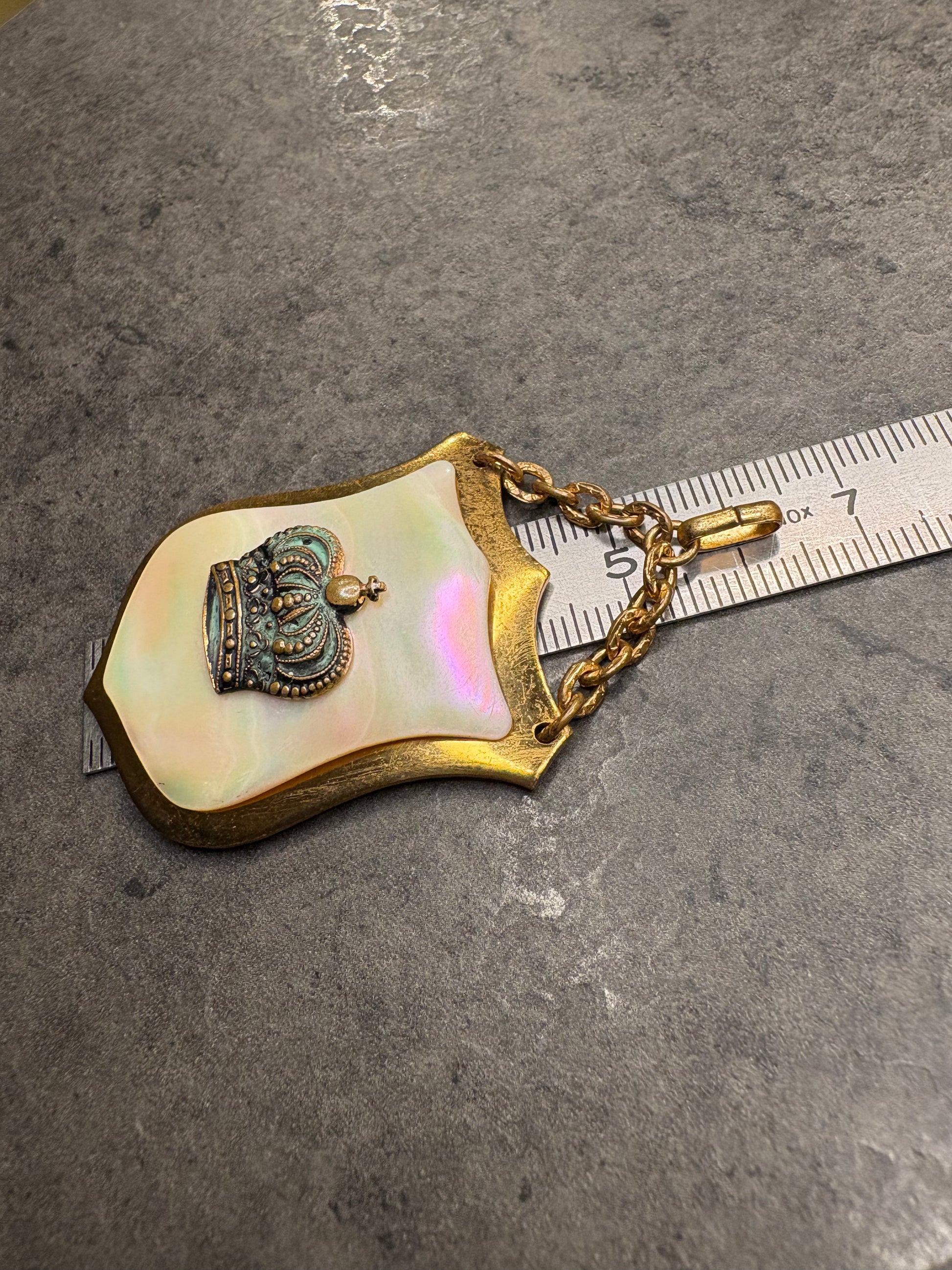 Al centro del pendente spicca un rilievo in ottone brunito raffigurante una corona reale, finemente decorata, simbolo di eleganza e regalità.
