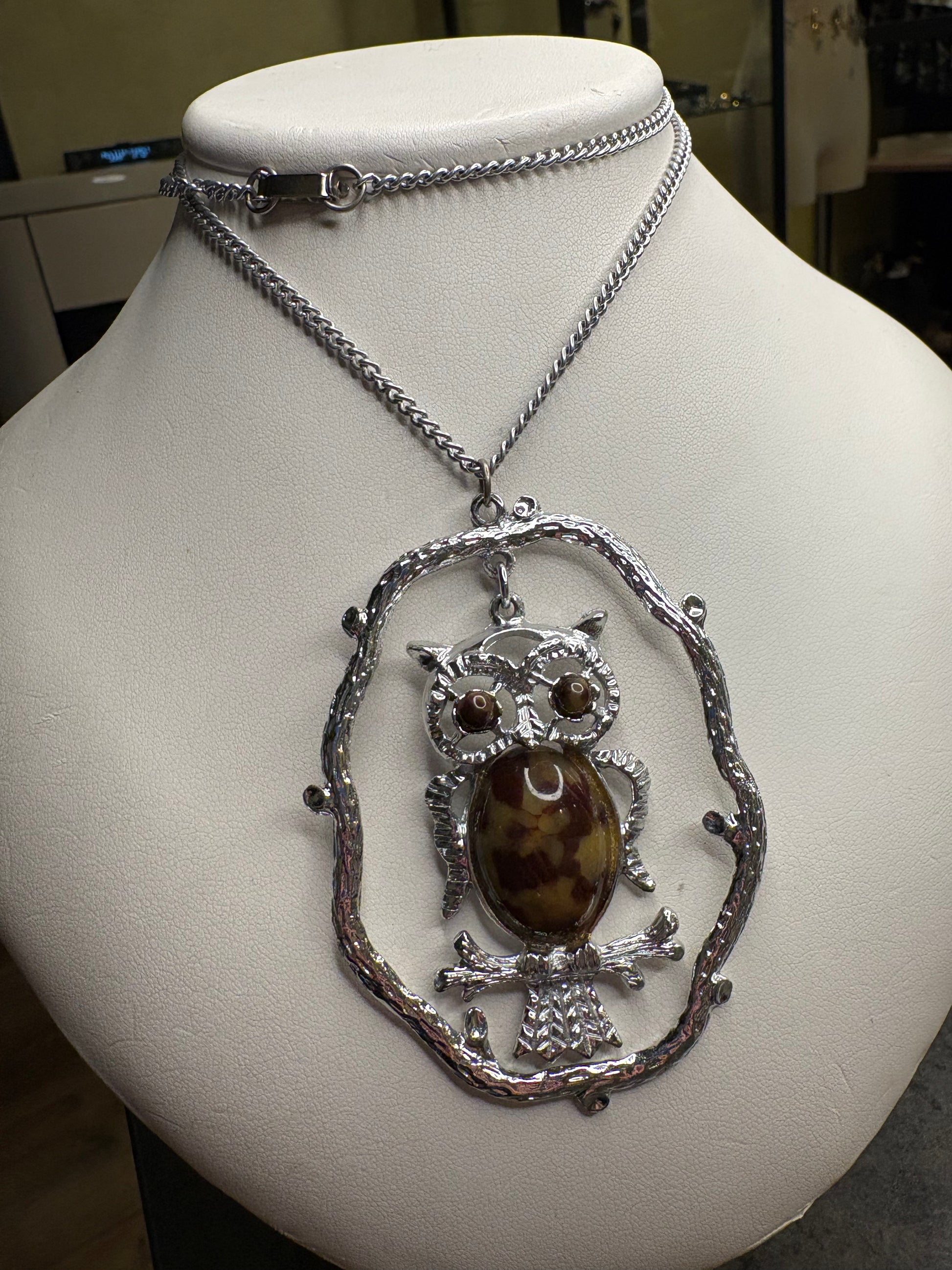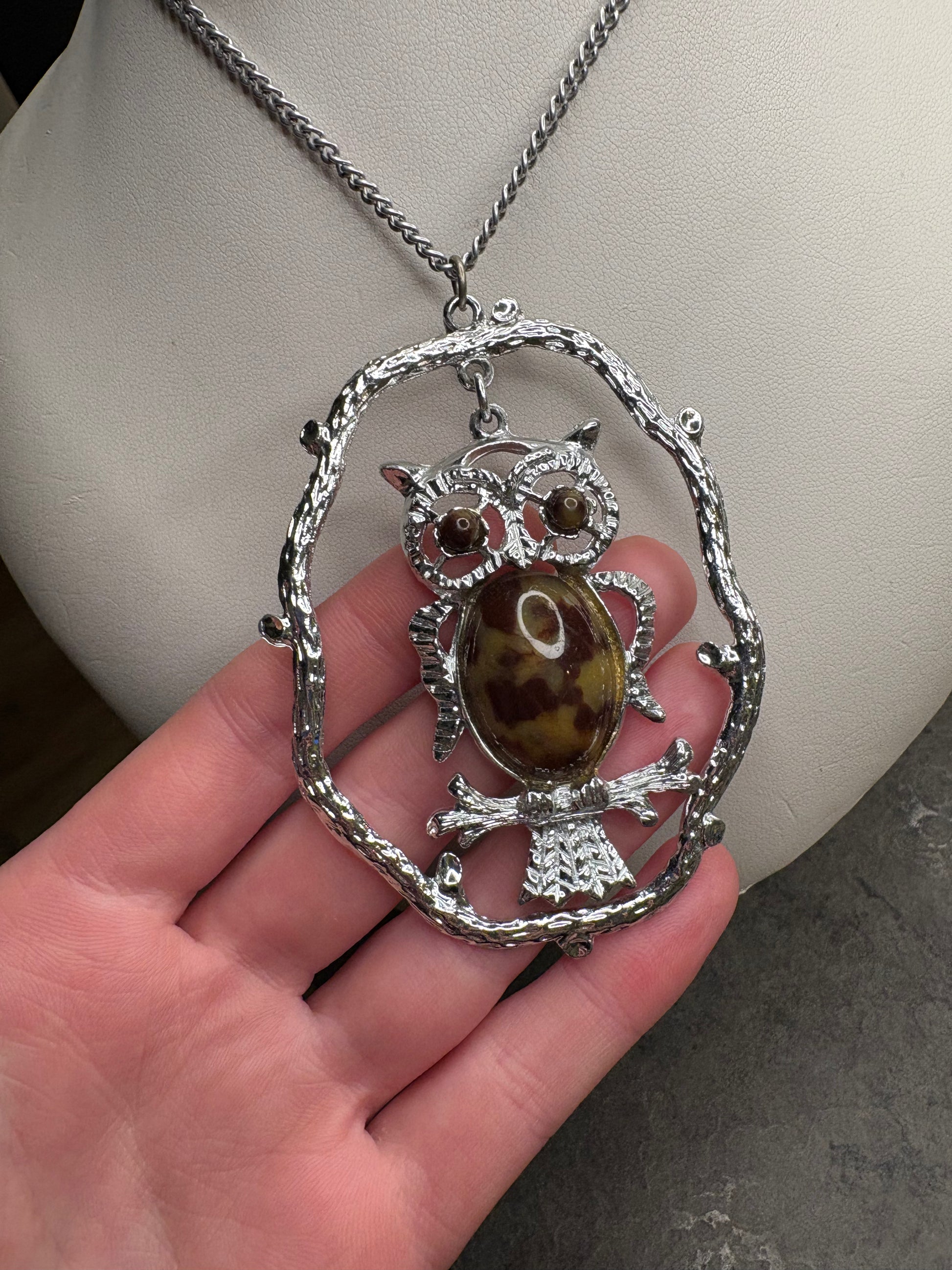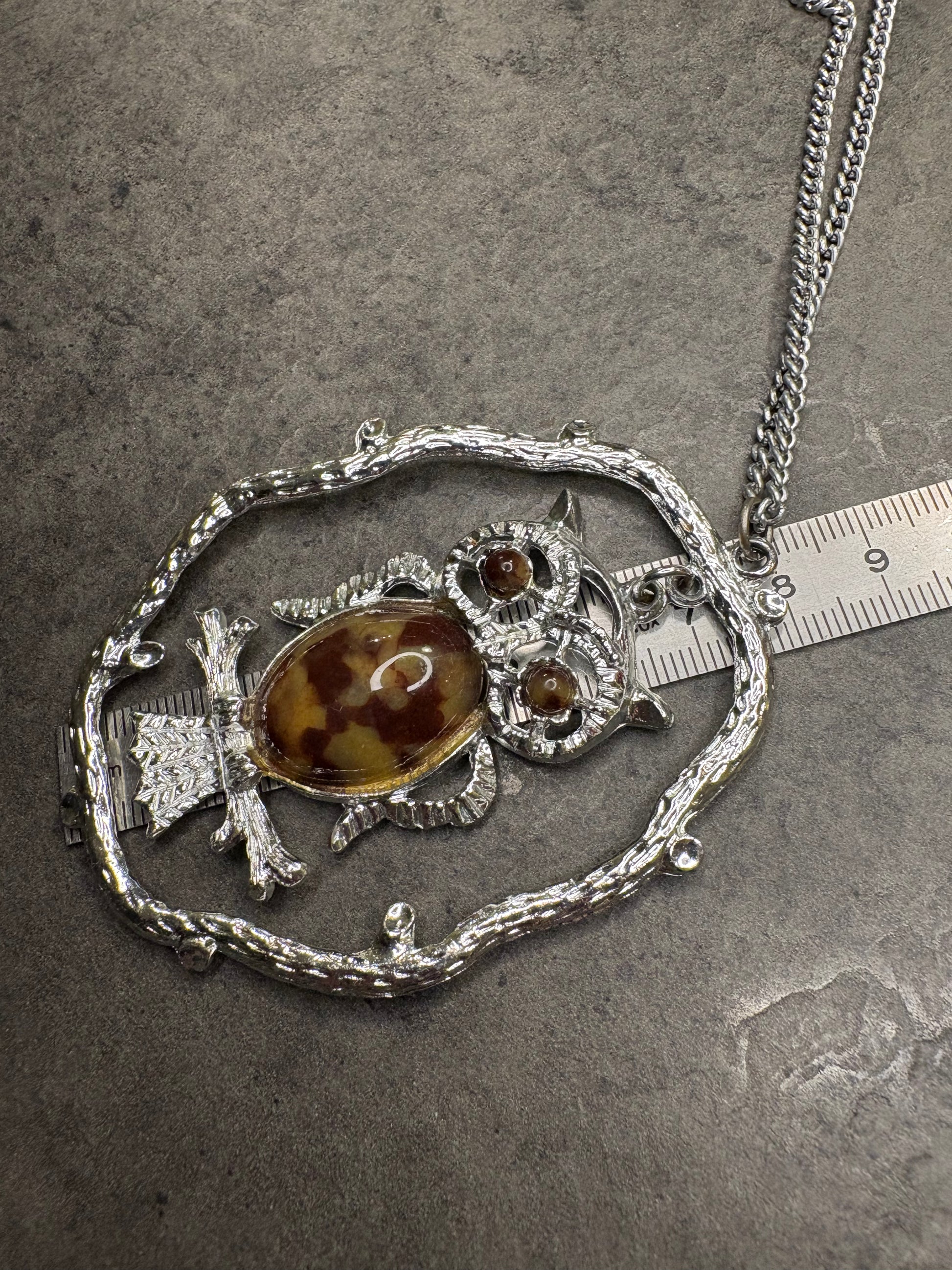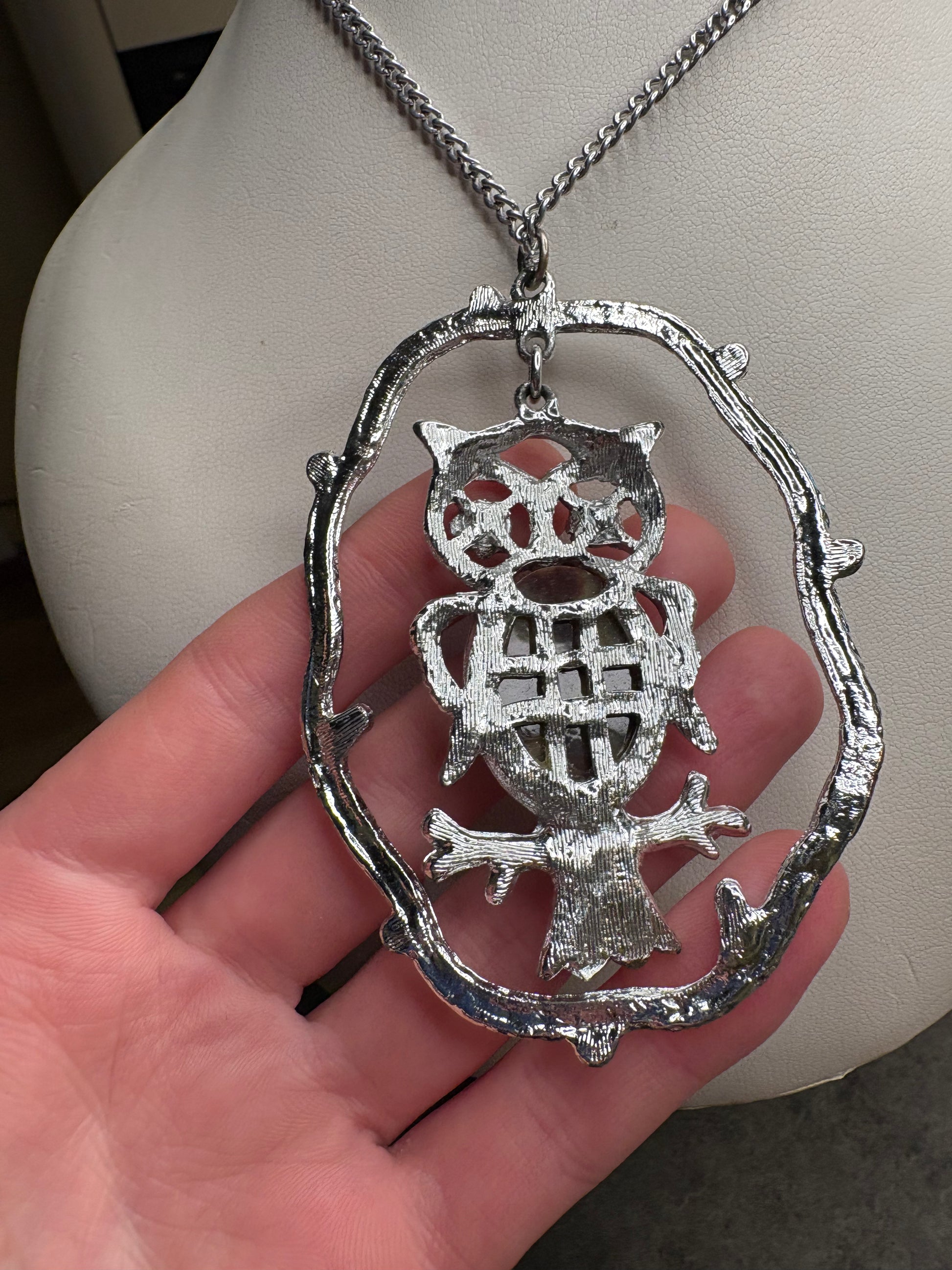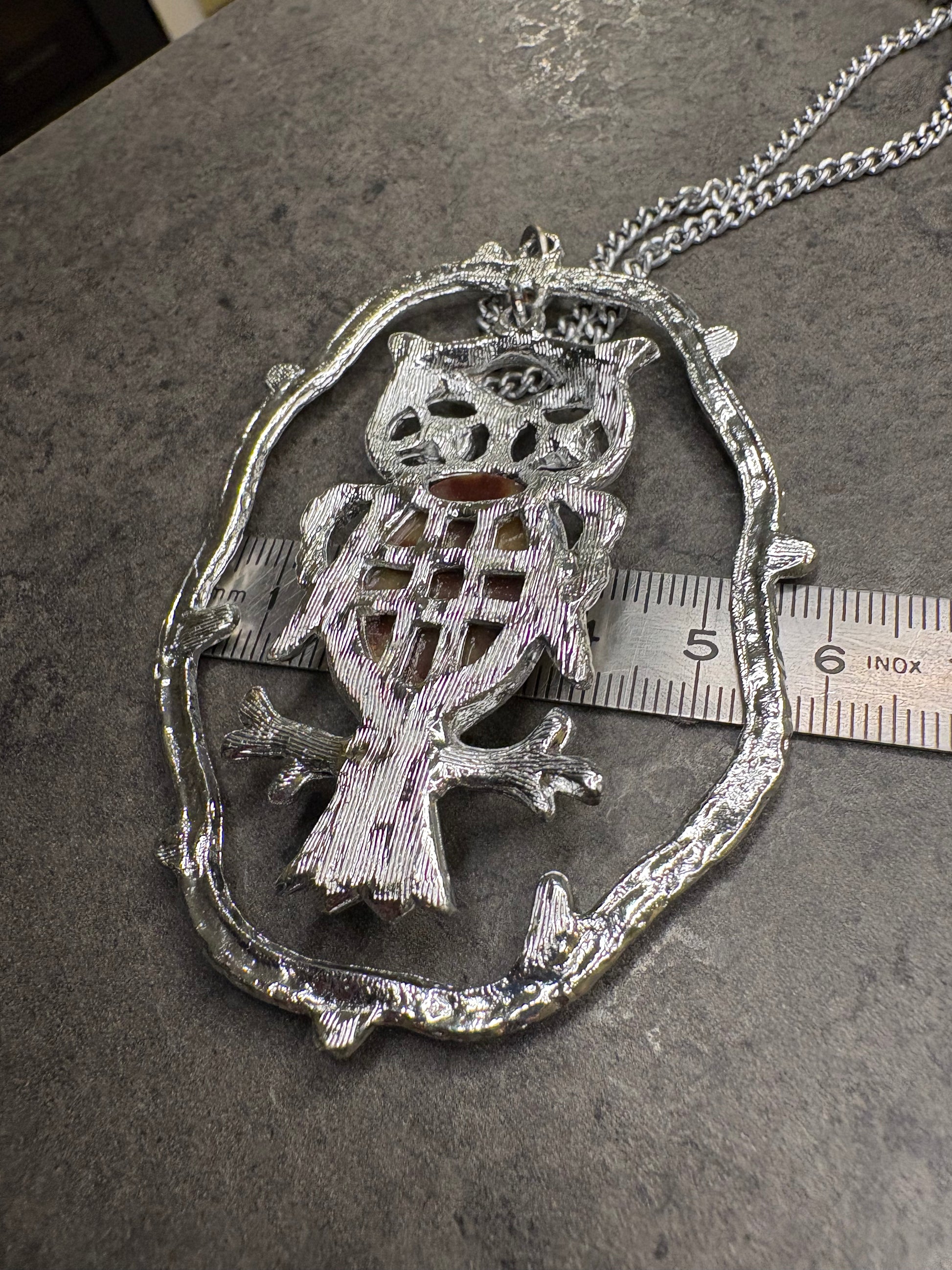 Affascinante pendente vintage anni ’70 raffigurante un gufo stilizzato sospeso all’interno di una cornice ad effetto ramo, in metallo argentato dal finish lucido e testurizzato.