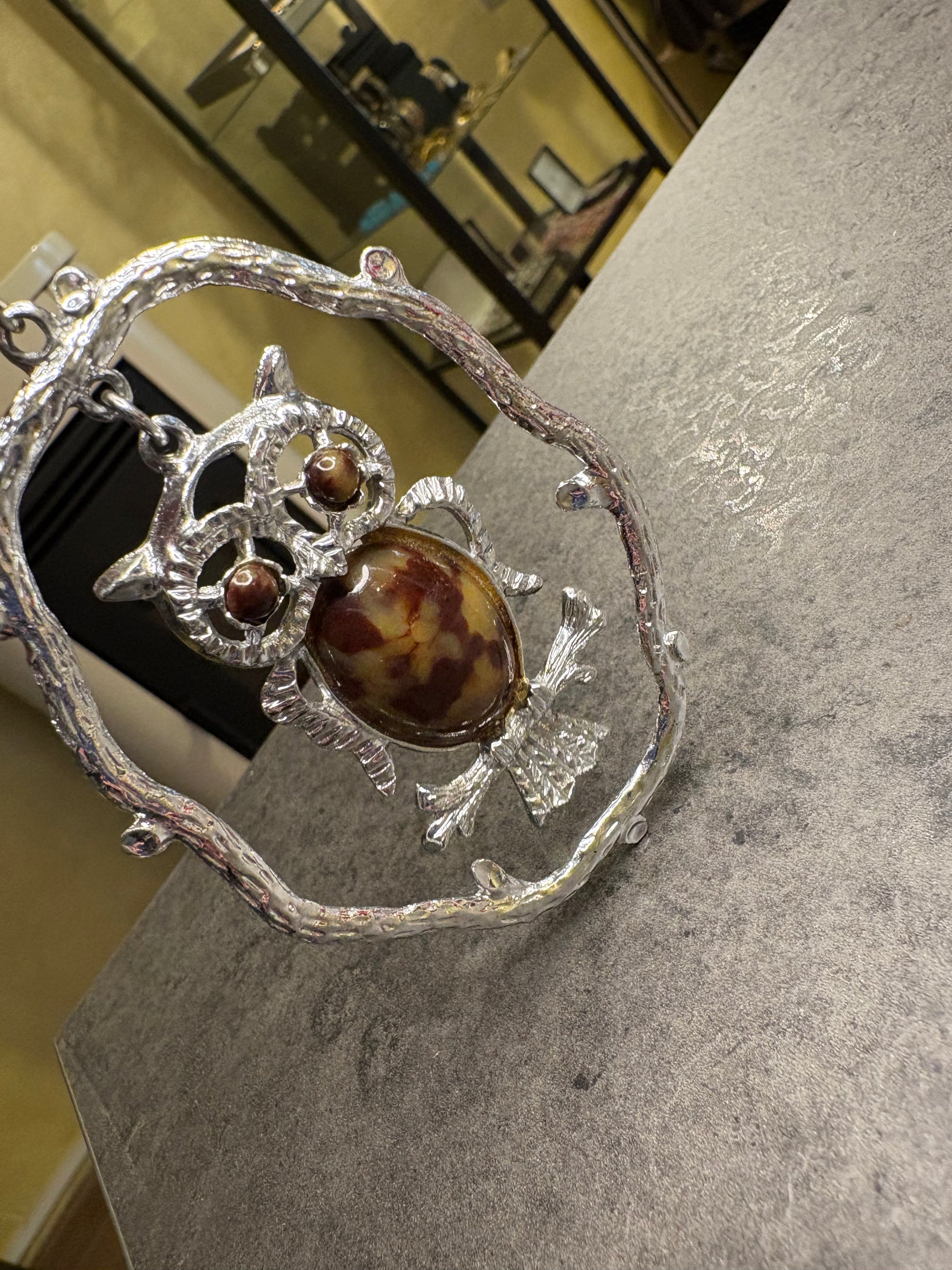 Il gufo, simbolo di saggezza e protezione, presenta un corpo centrale decorato da una grande cabochon ovale effetto marmorizzato nei toni del marrone e dell’ambra, mentre gli occhi sono realizzati con piccole perle tonde coordinate che gli donano un’espressione vivace e curiosa.