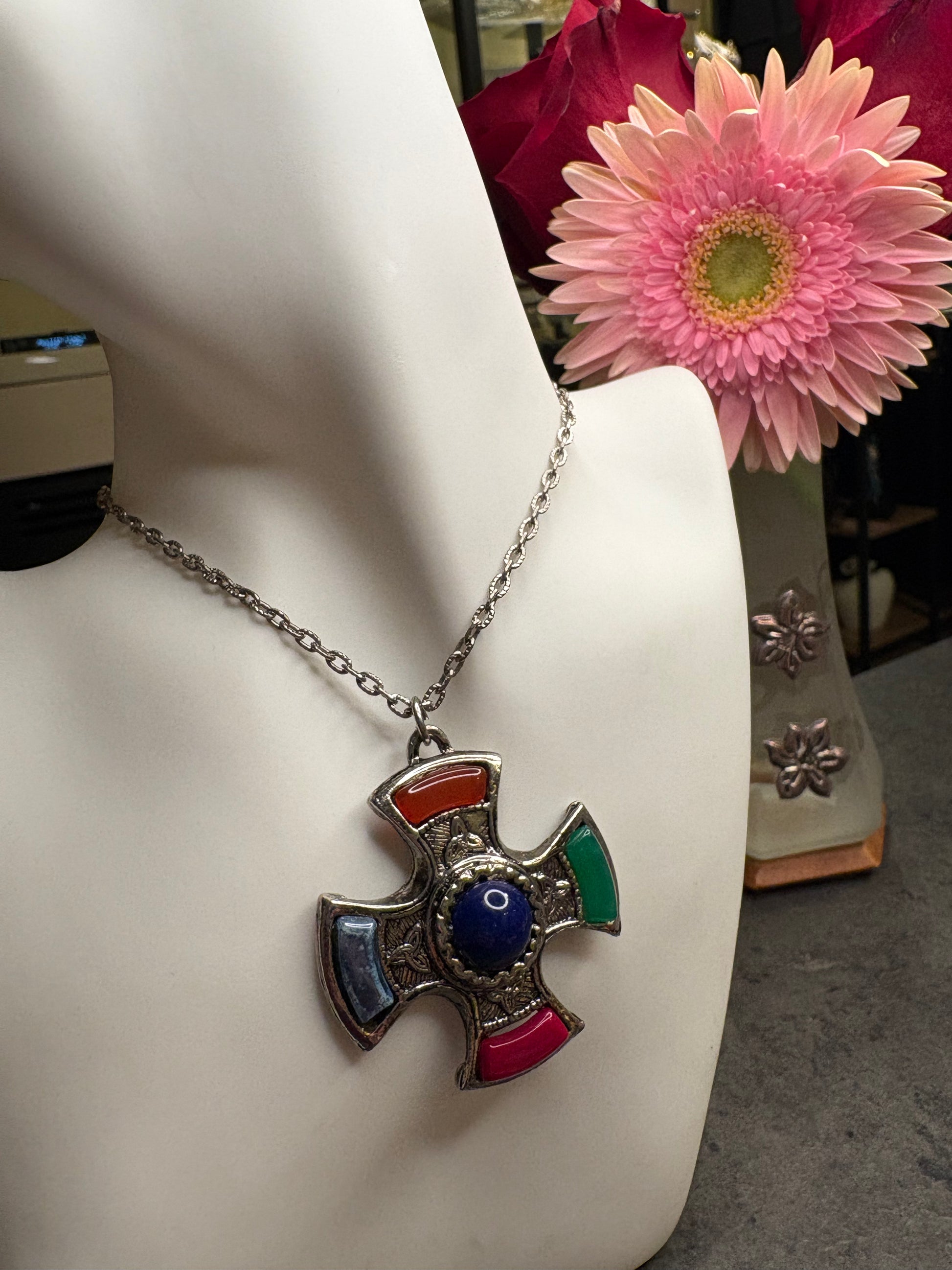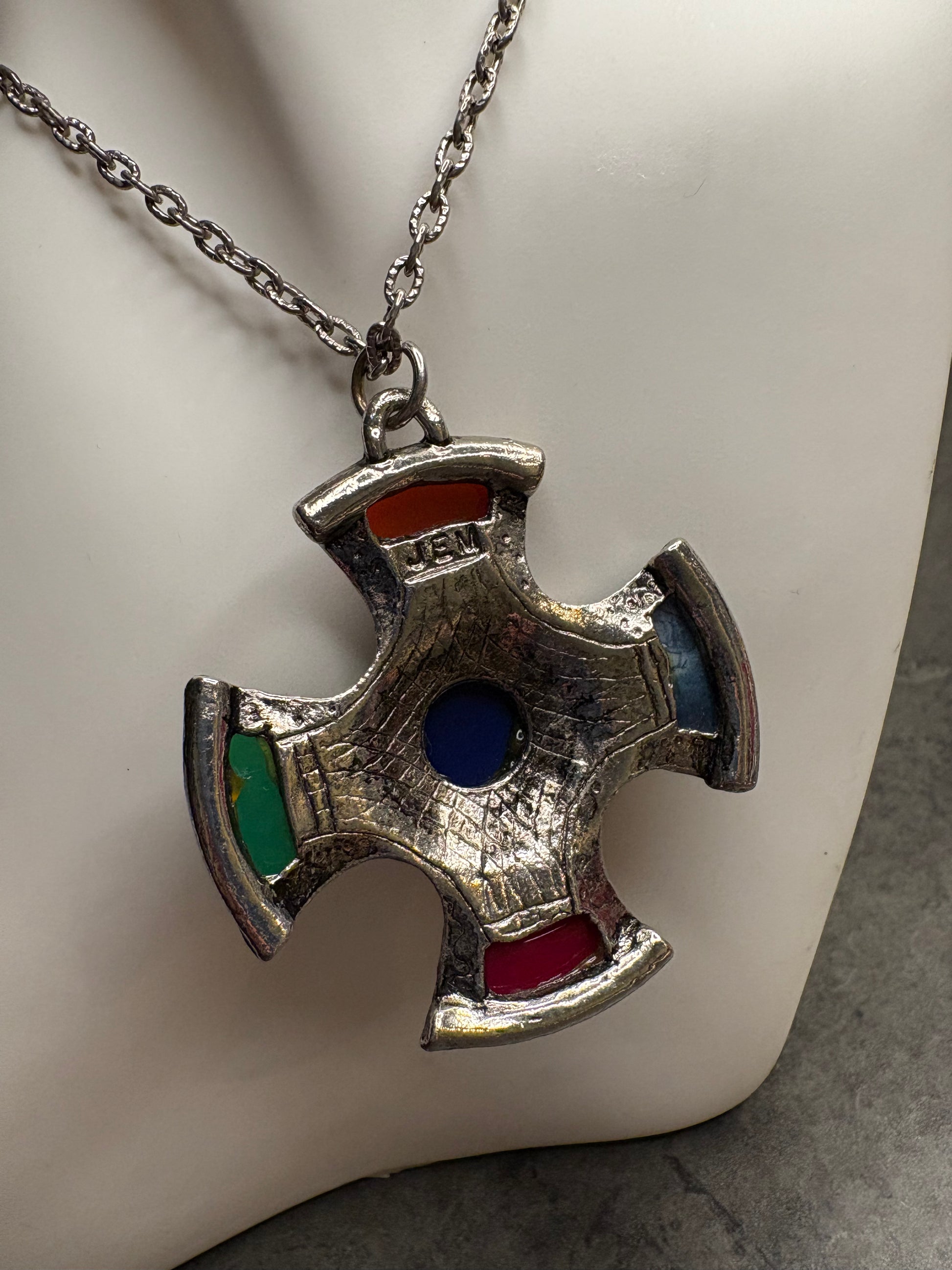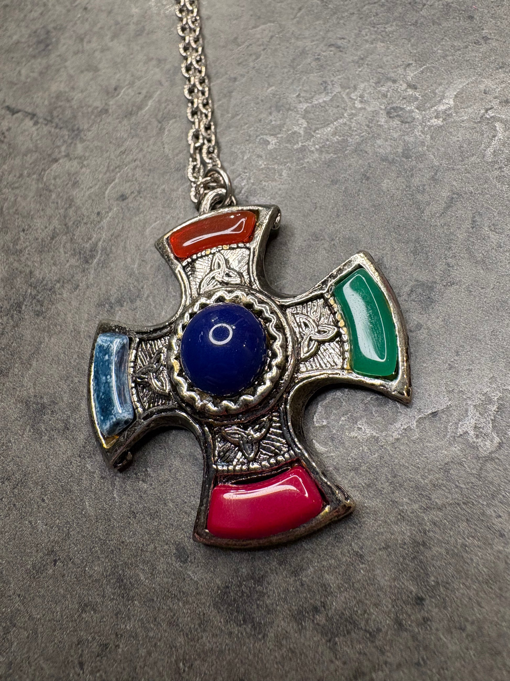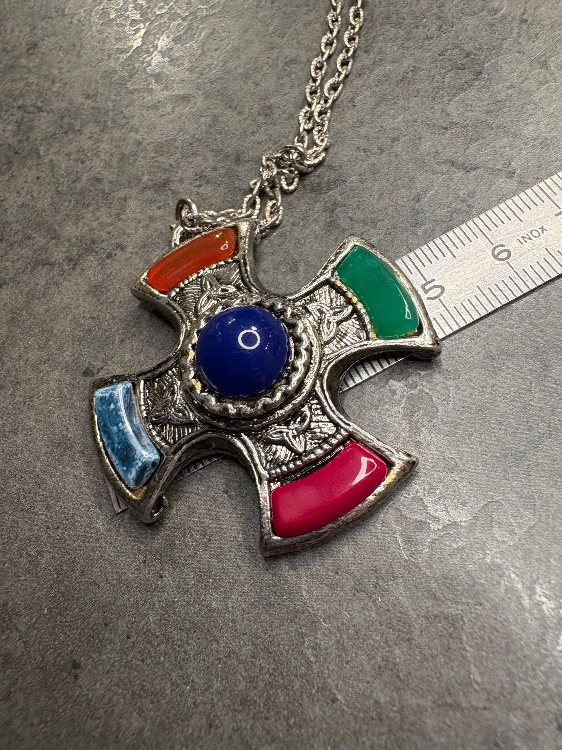 Questo splendido pendente vintage JEM è realizzato in stile scozzese e presenta una caratteristica forma a croce rotondeggiante, riccamente decorata da motivi incisi di ispirazione celtica. Al centro spicca un grande cabochon blu, mentre i quattro bracci sono impreziositi da inserti in vetro colorato nei toni del rosso, verde, blu e arancione.