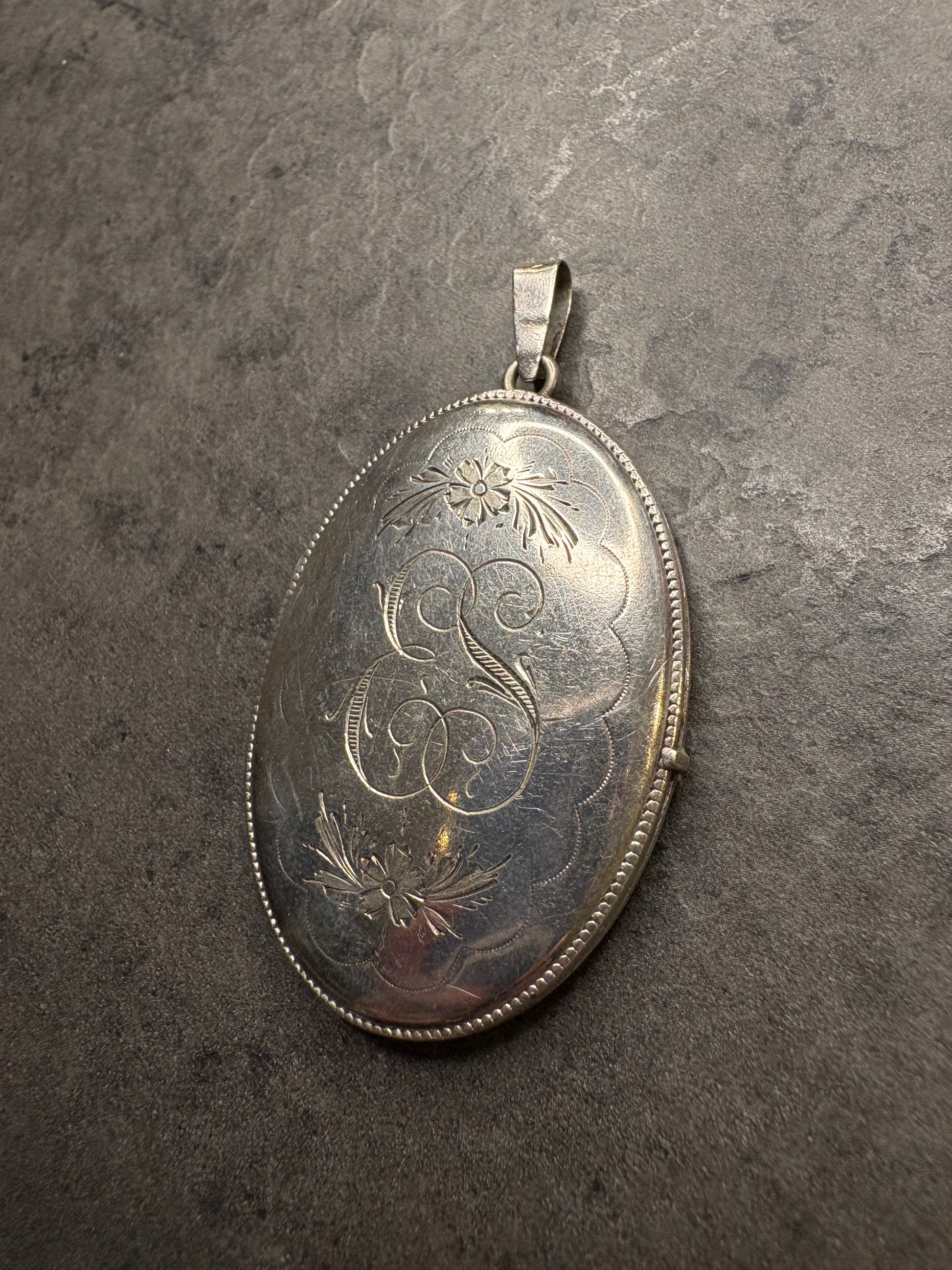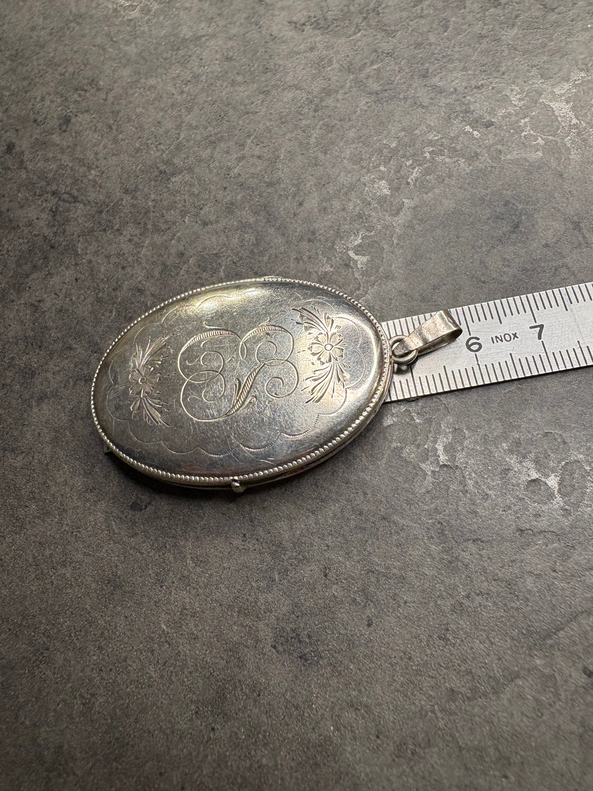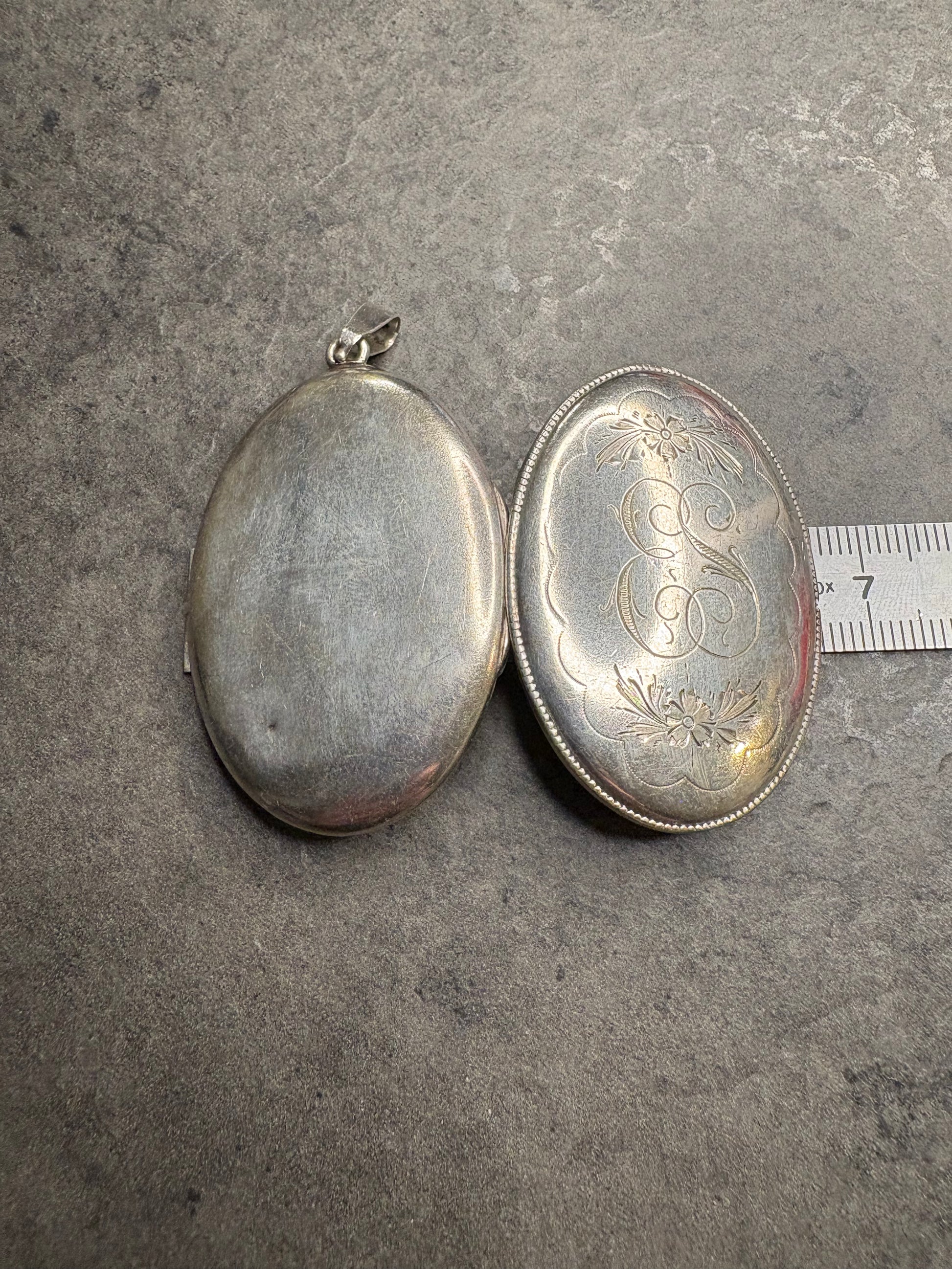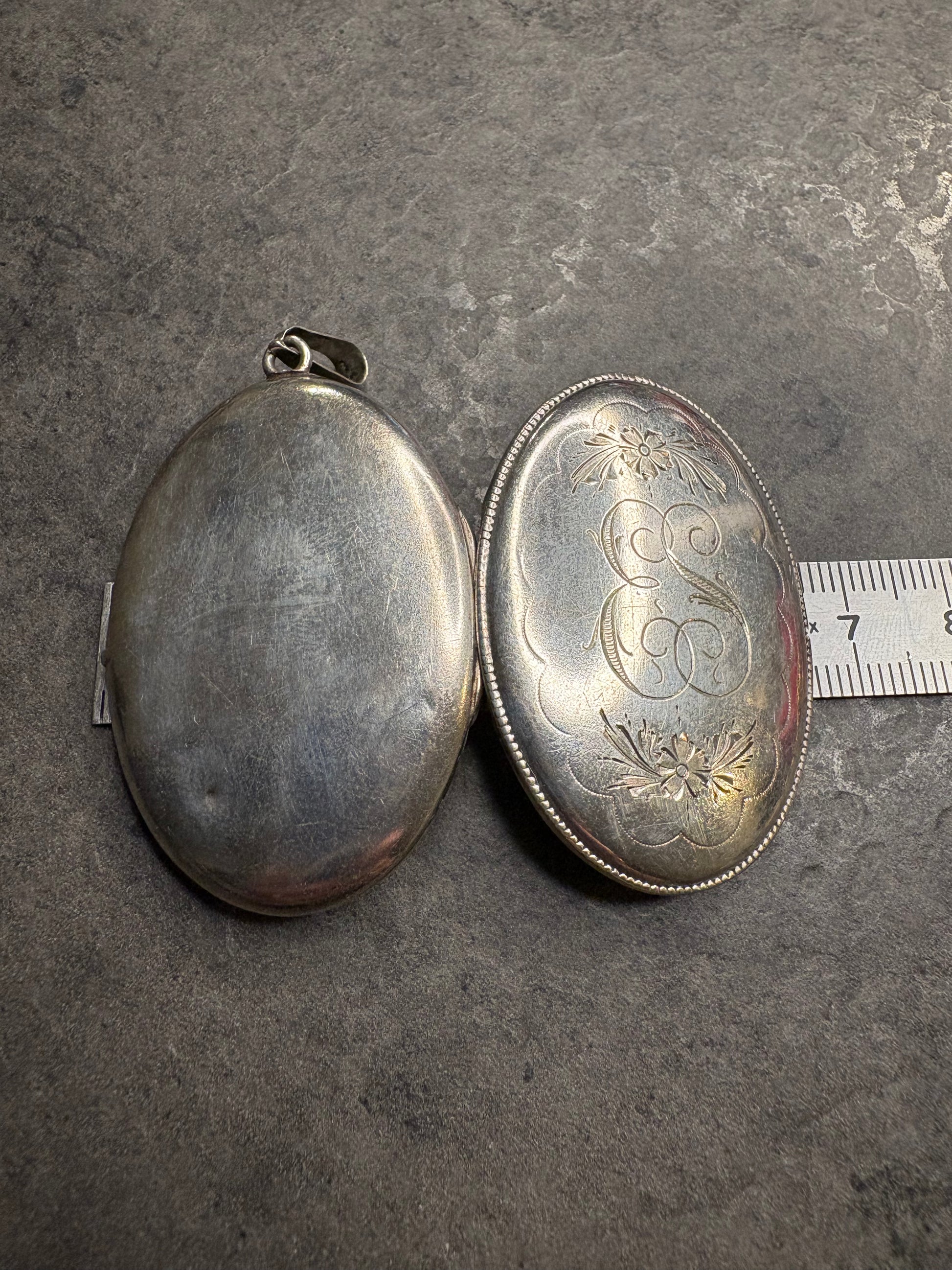 Questo elegante pendente locket vintage in alpacca si distingue per la sua forma ovale e per la raffinata decorazione incisa sul fronte. Al centro risaltano le lettere intrecciate “ES”, realizzate con uno stile calligrafico armonioso e circondate da motivi floreali e volute delicate. Il bordo perlinato ne definisce il profilo, aggiungendo un tocco di eleganza classica.