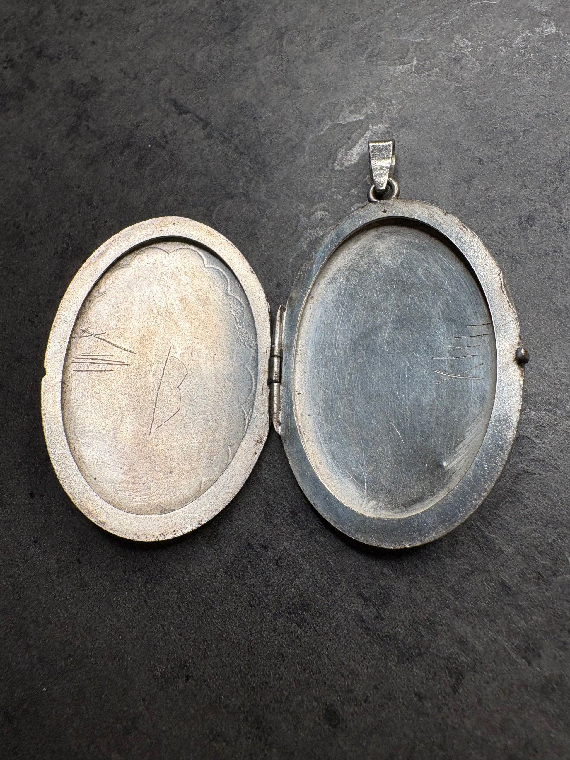 Realizzato in alpacca, lega nota anche come “argento tedesco”, il locket mantiene un aspetto luminoso e raffinato, con leggere ossidazioni che gli conferiscono un fascino autenticamente vintage.