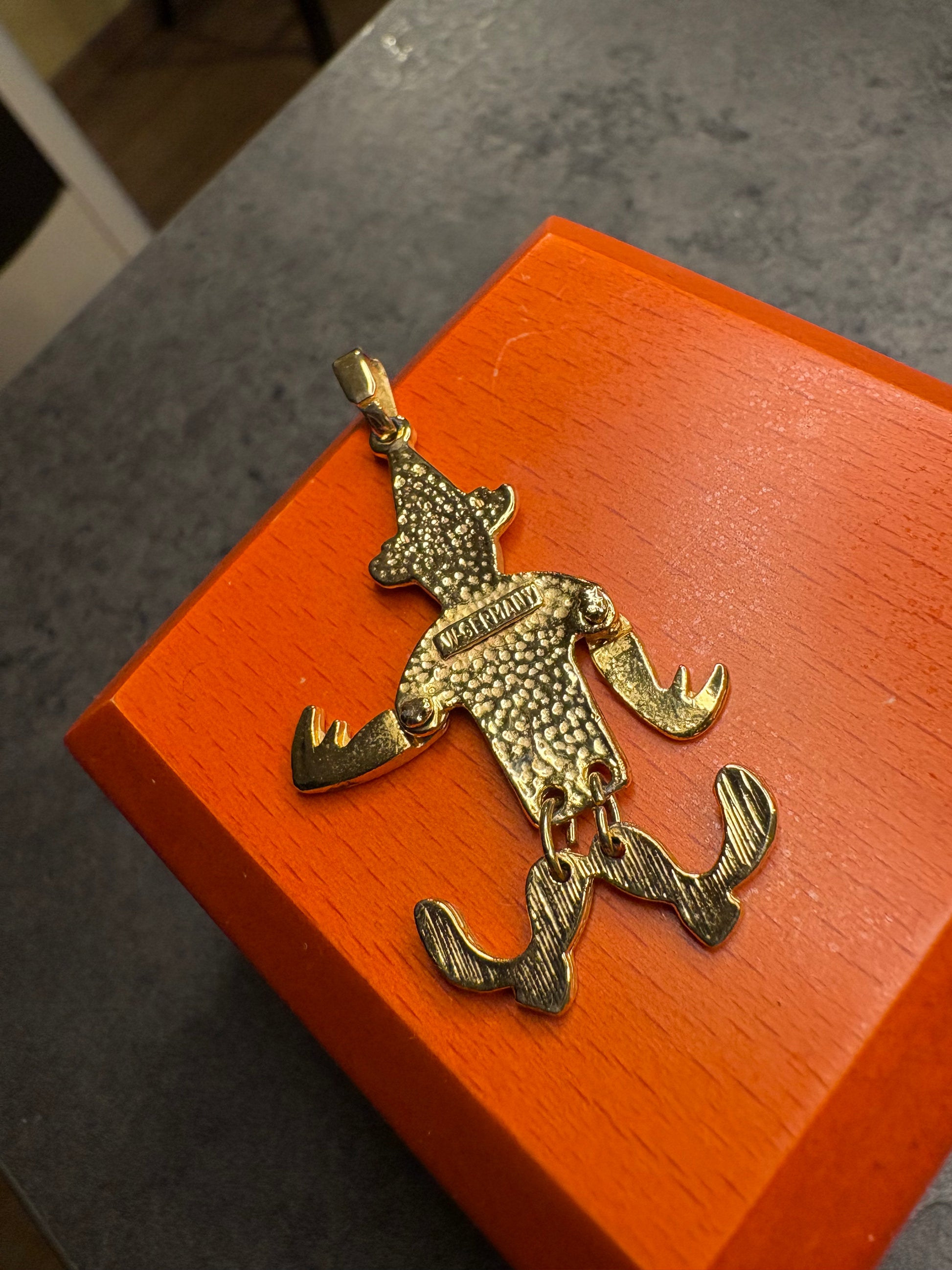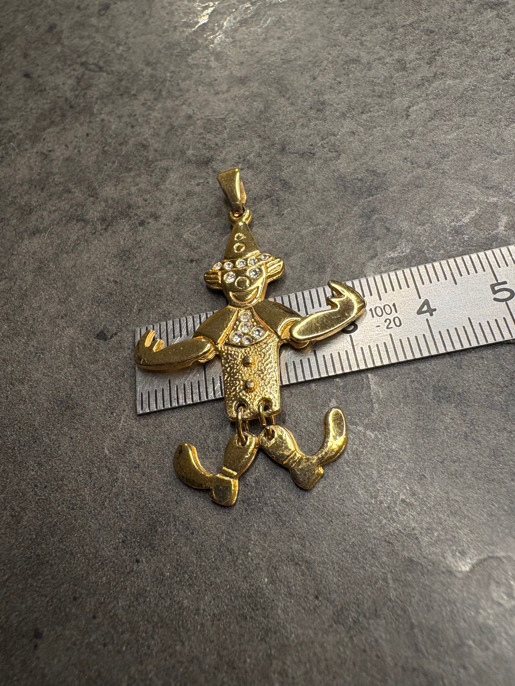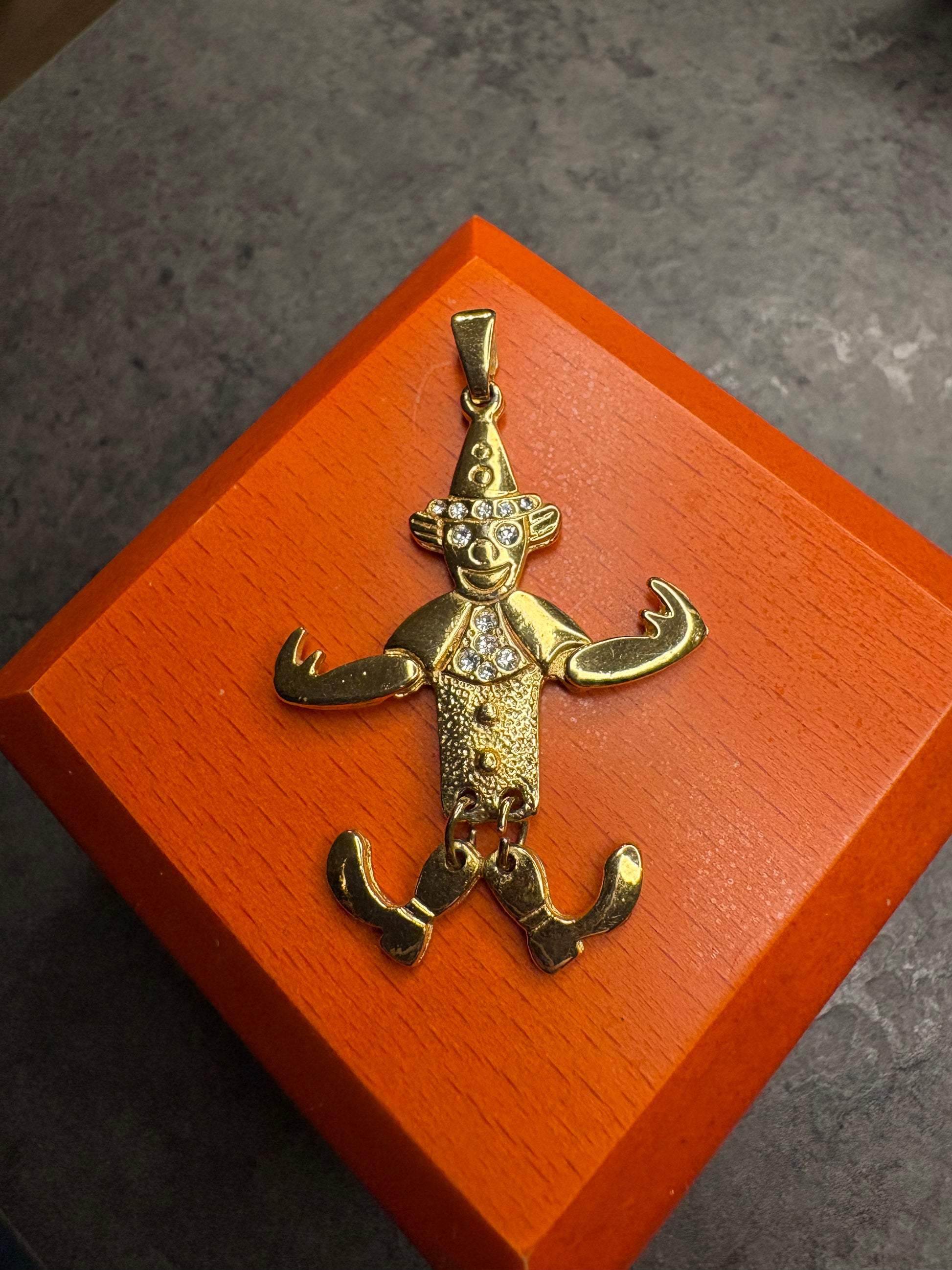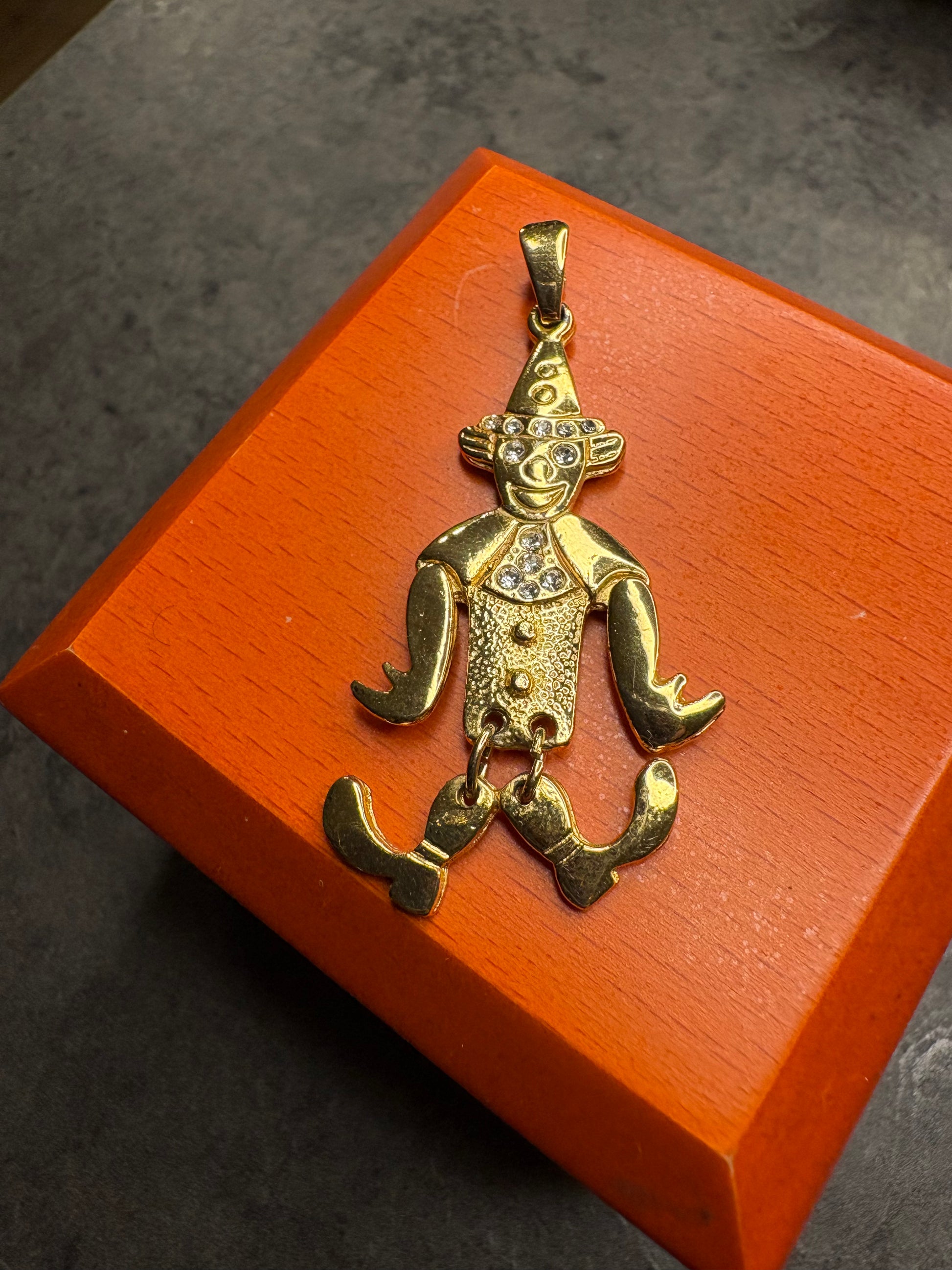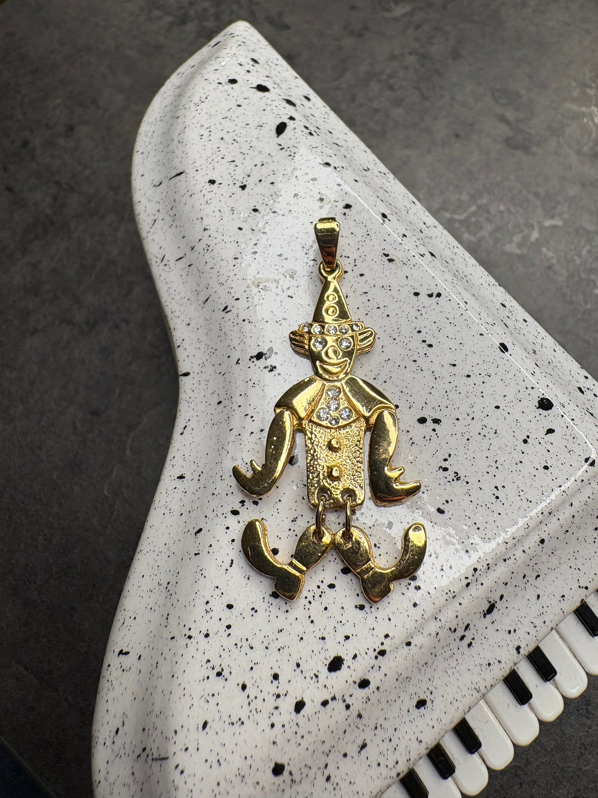 È realizzato in metallo dorato lucido, con una superficie lavorata a rilievo che ne esalta i dettagli. Il viso e il costume del clown sono impreziositi da brillanti strass trasparenti, che donano un tocco di luce e vivacità al pezzo. Le braccia e le gambe sono mobili, rendendo il pendente dinamico e giocoso.