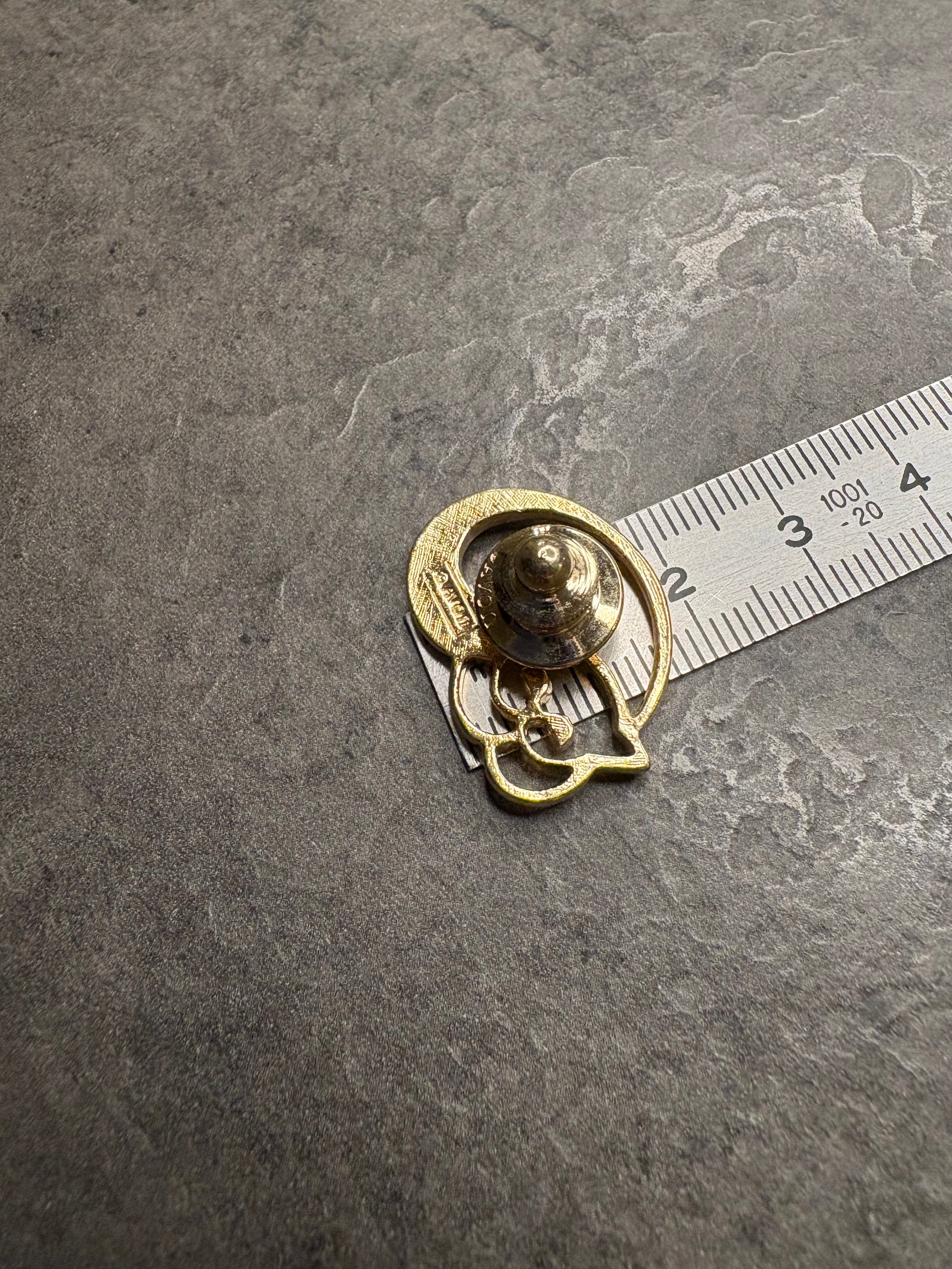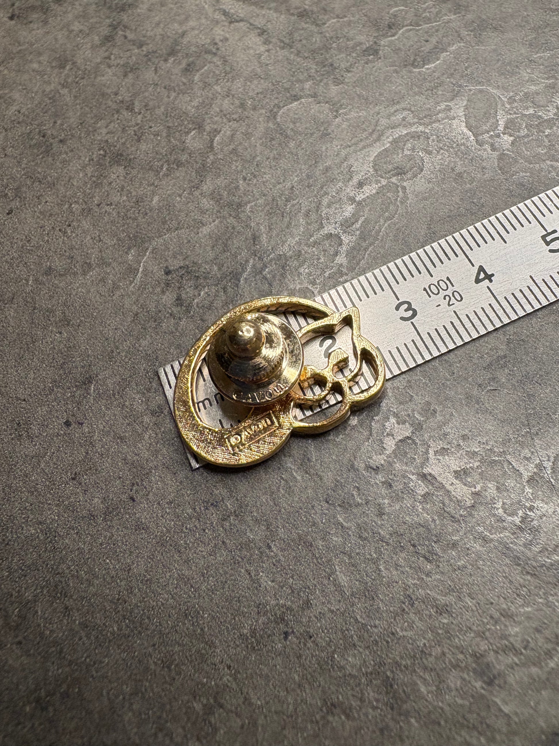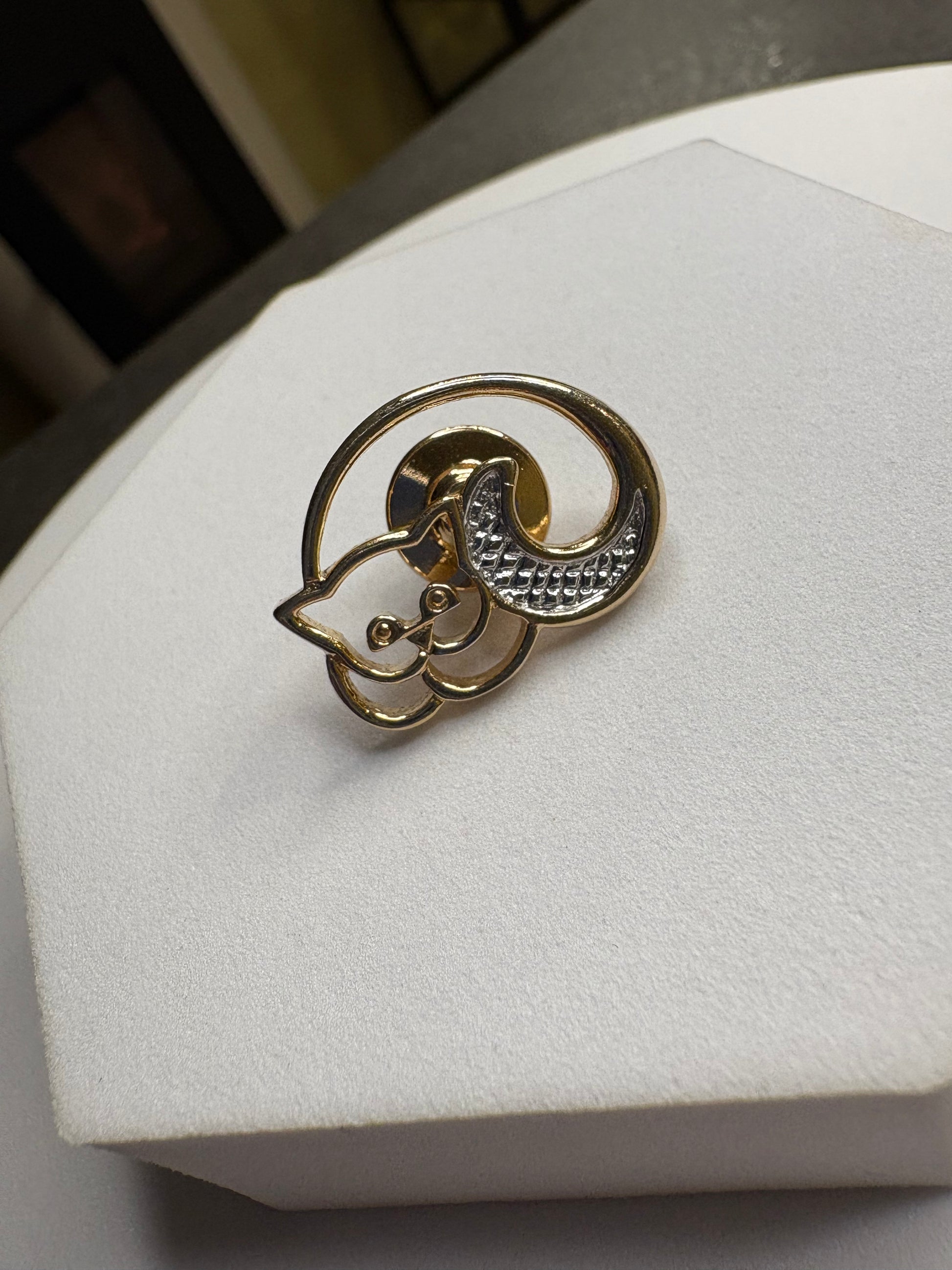 Delizioso pin a forma di gatto firmato Avon del 1980, parte della collezione “Animal Pins”, realizzato in metallo dorato con dettagli argentati che definiscono il musetto e la coda, piccolo ma molto espressivo e giocoso.