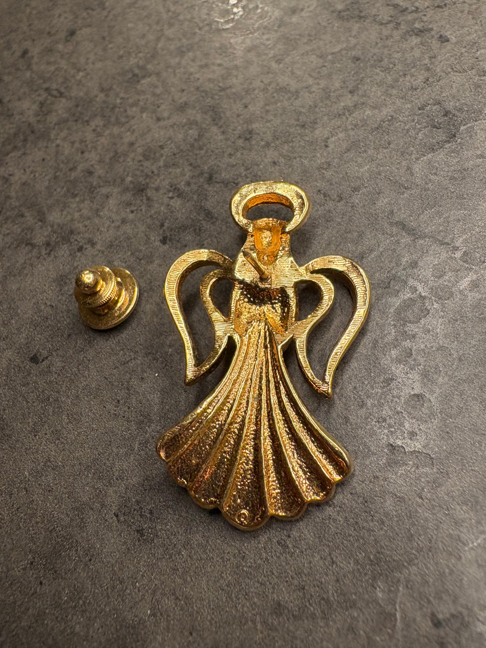 Raffinato pin vintage Avon a forma di angelo stilizzato, realizzato in metallo dorato con finitura luminosa e una delicata aureola impreziosita da piccoli strass trasparenti. Le linee fluide e armoniose delle ali si aprono con grazia, mentre la veste plissettata scende in un elegante movimento che dona profondità e luce al design.