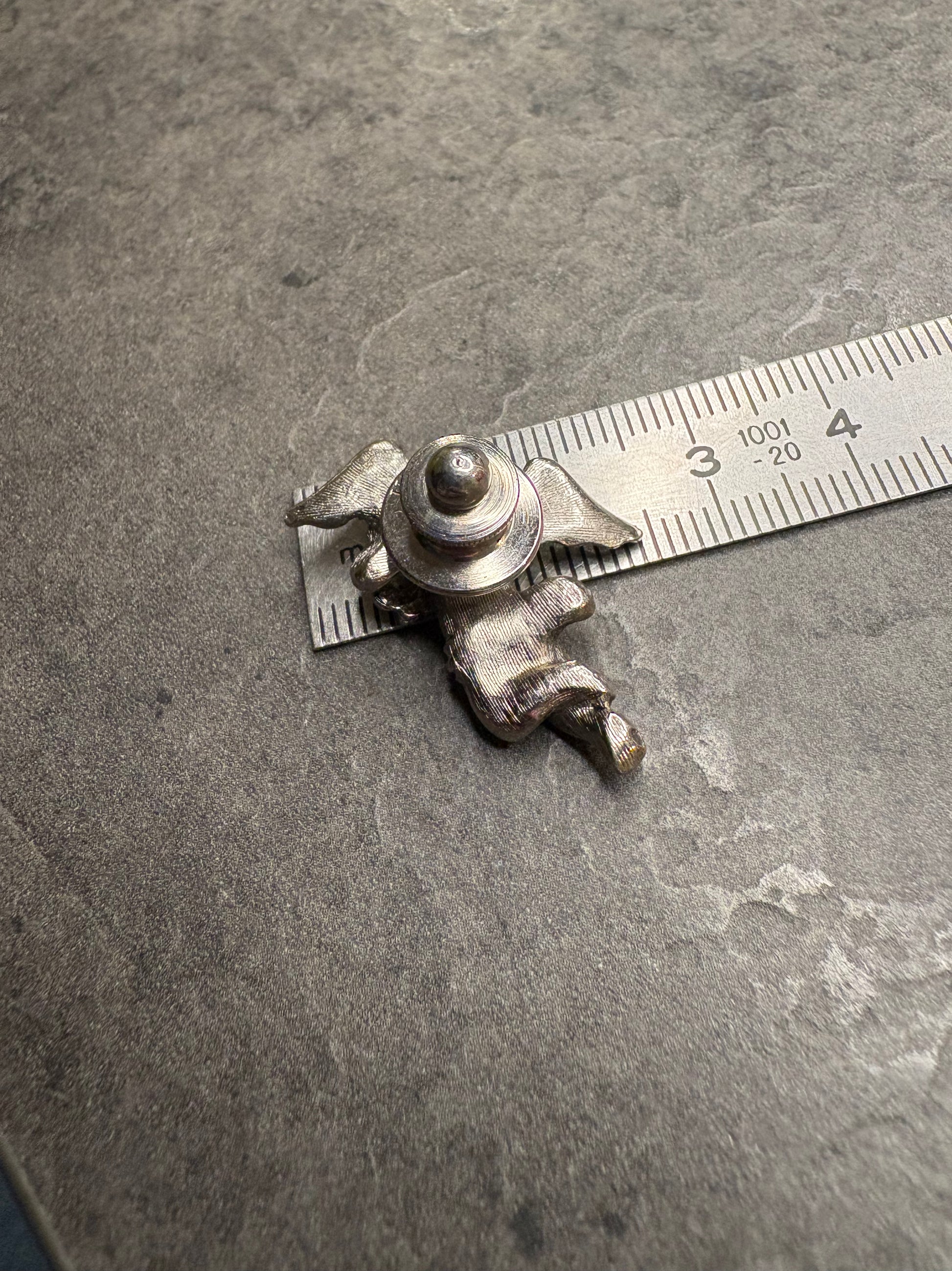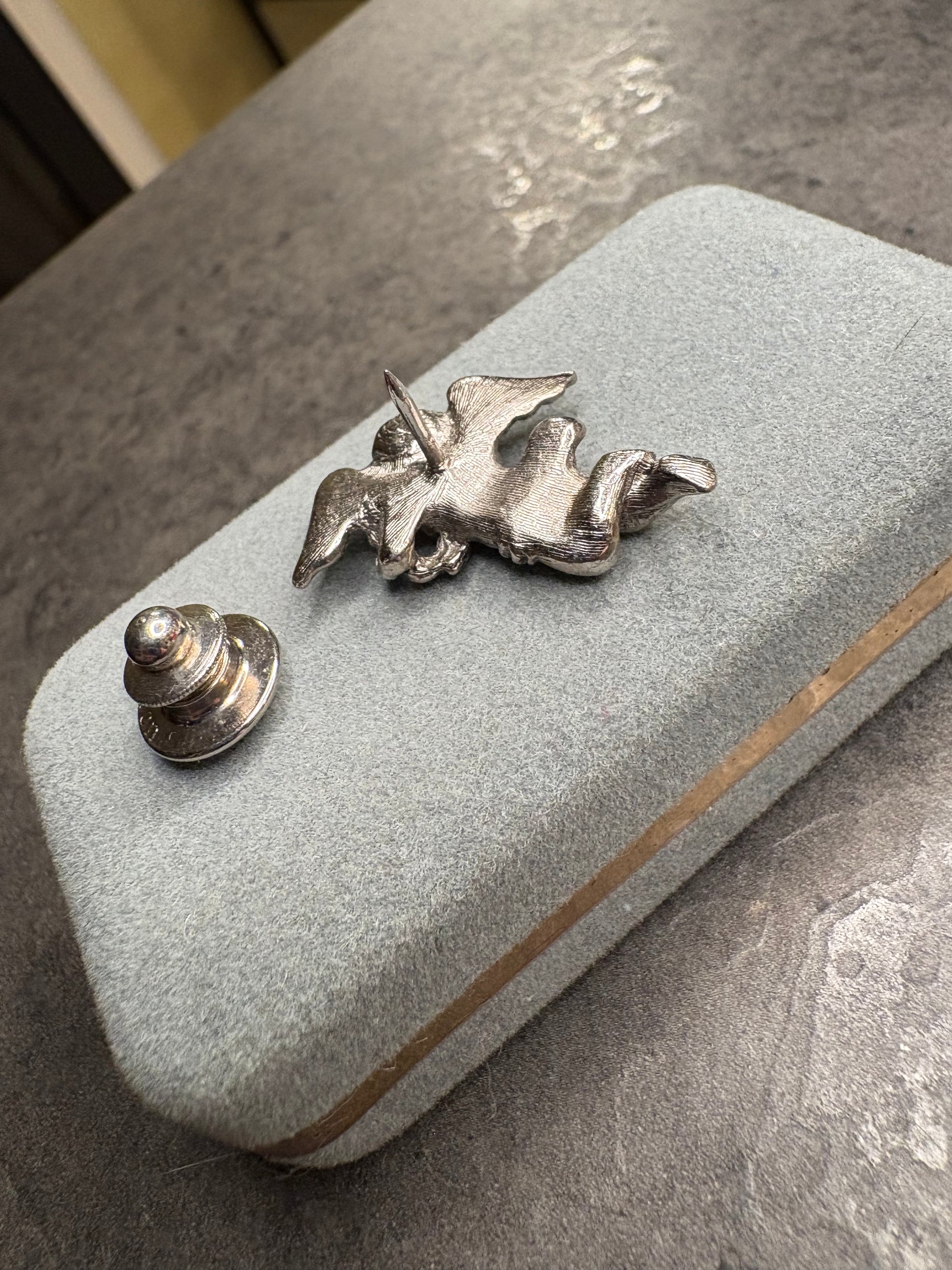 Splendido pin vintage firmato Avon, realizzato in metallo argentato e raffigurante un angioletto alato in stile classico. Le ali sono impreziosite da piccoli dettagli in rilievo che donano luce e movimento alla figura. Il design tridimensionale rende questo accessorio ancora più affascinante e ricco di carattere.
