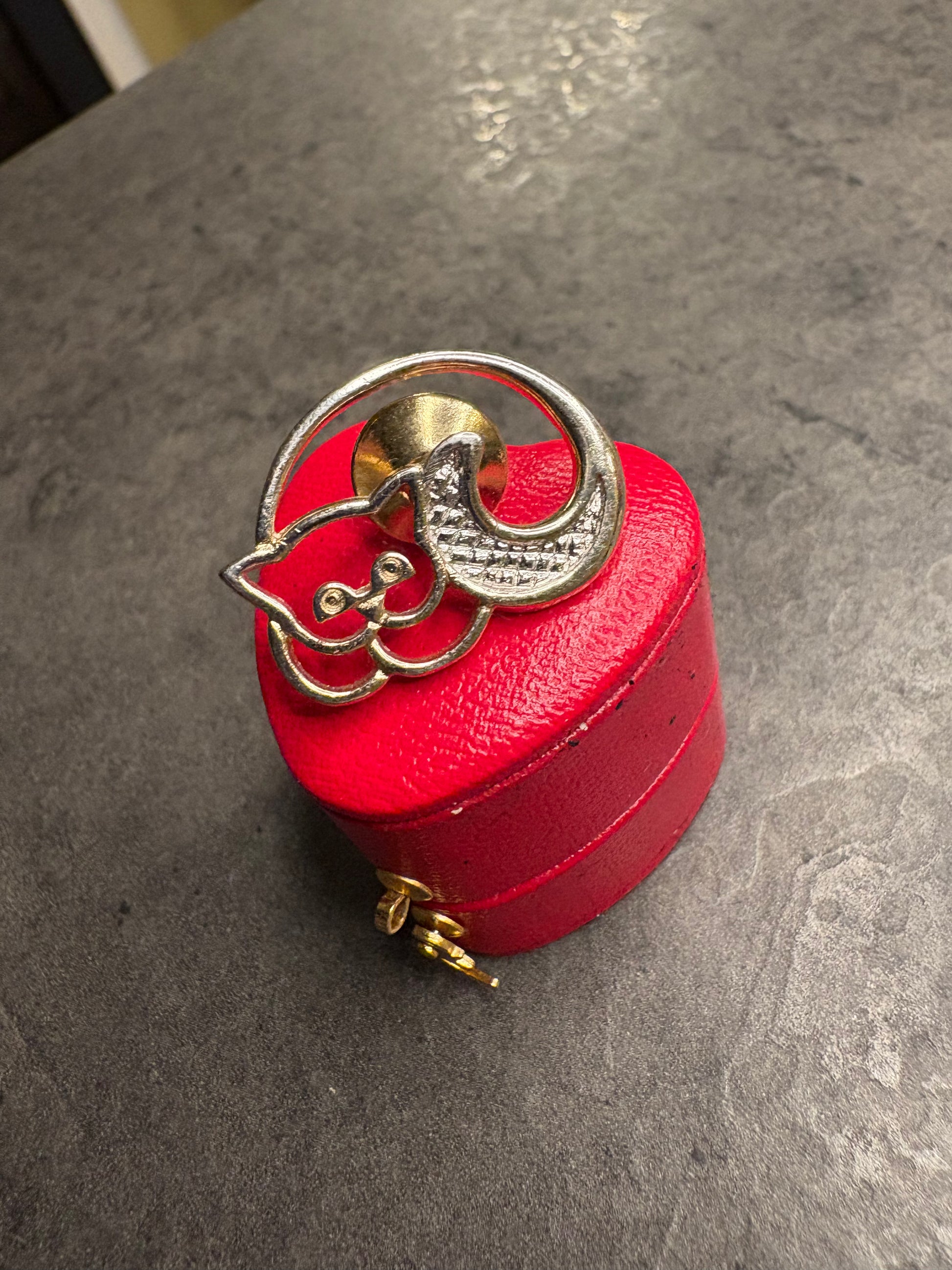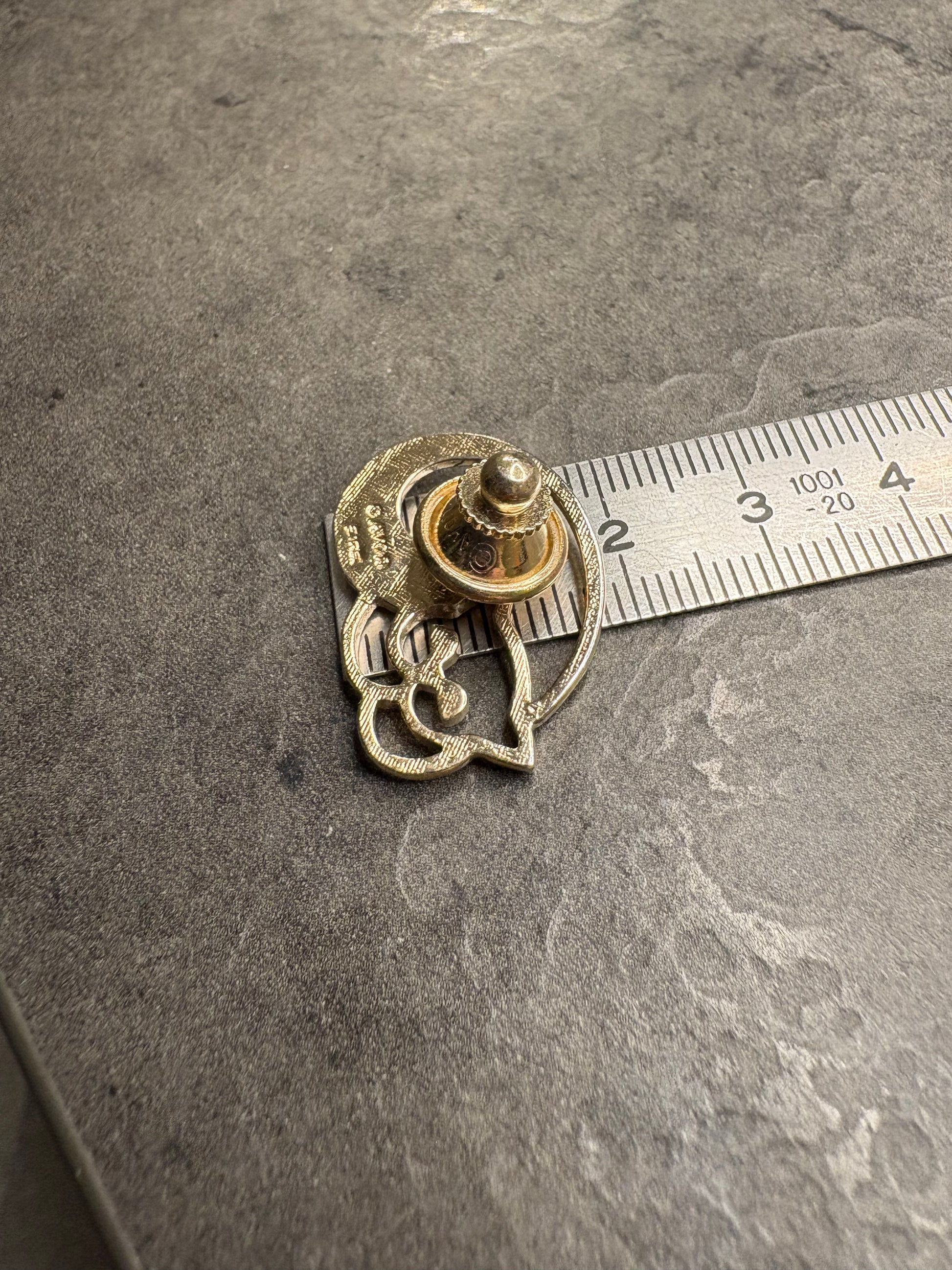 Il gioiello è realizzato in metallo color oro lucido, con raffinati dettagli argentati, creando un delicato contrasto cromatico. Lo stile è tipico delle collezioni Avon di quel periodo, elegante ma allo stesso tempo giocoso, perfetto come accessorio per impreziosire giacche, camicette, sciarpe o cappelli.