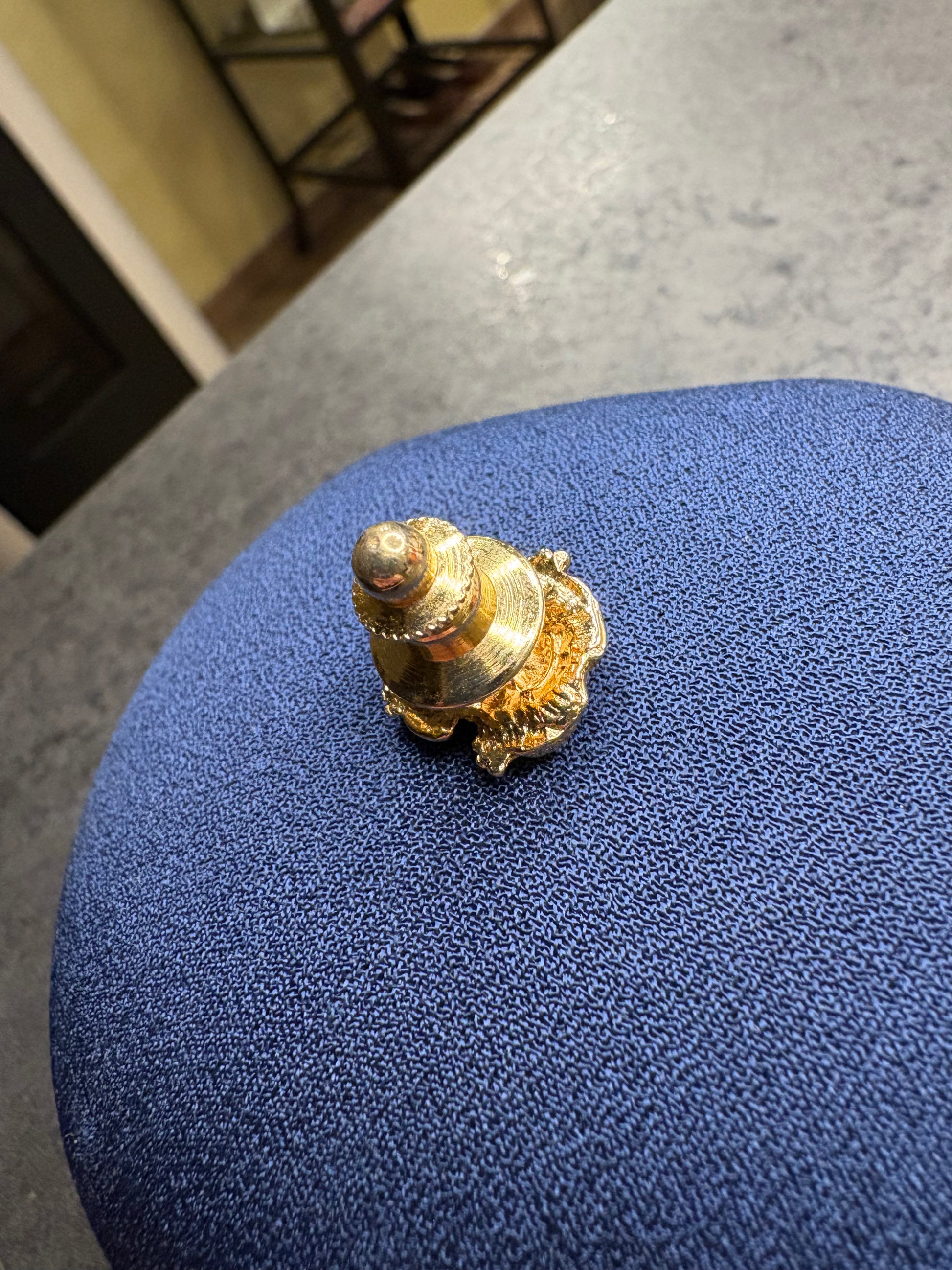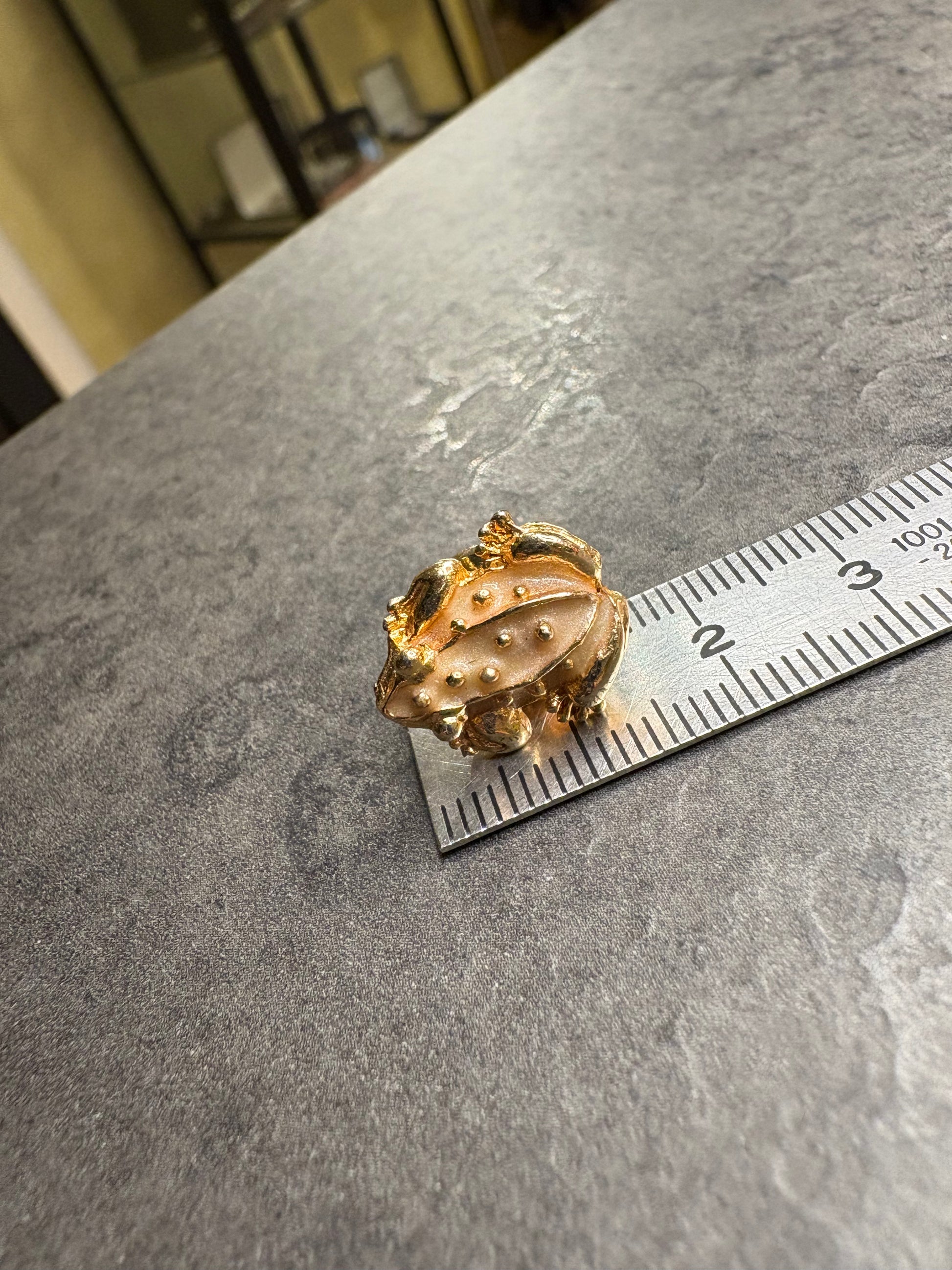 Questo delizioso pin vintage di Avon raffigura una simpatica rana, simbolo di trasformazione e buona fortuna. Realizzato in metallo placcato oro, presenta una lavorazione tridimensionale che ne esalta i dettagli: il corpo è impreziosito da smalto color pesca con punti in rilievo dorati che ne sottolineano la texture naturale. Le zampette e i contorni, lucidi e dorati, donano un contrasto raffinato e luminoso.
