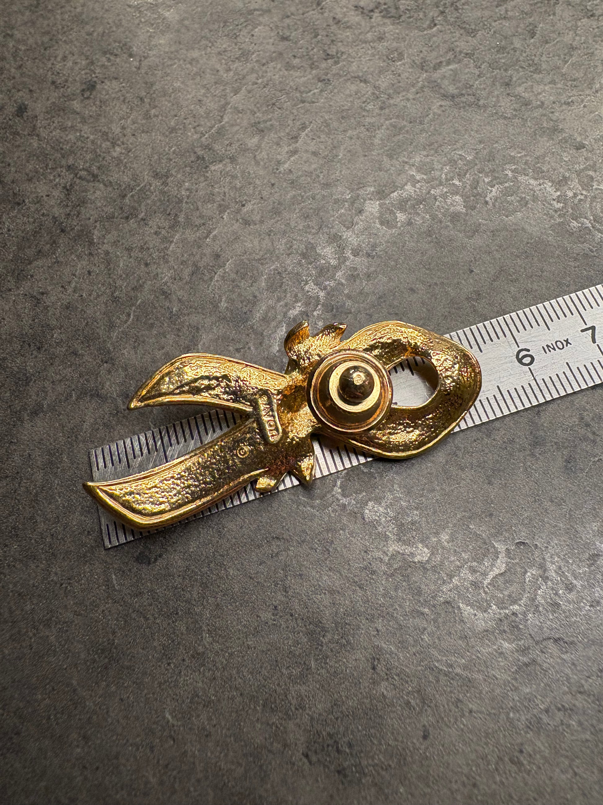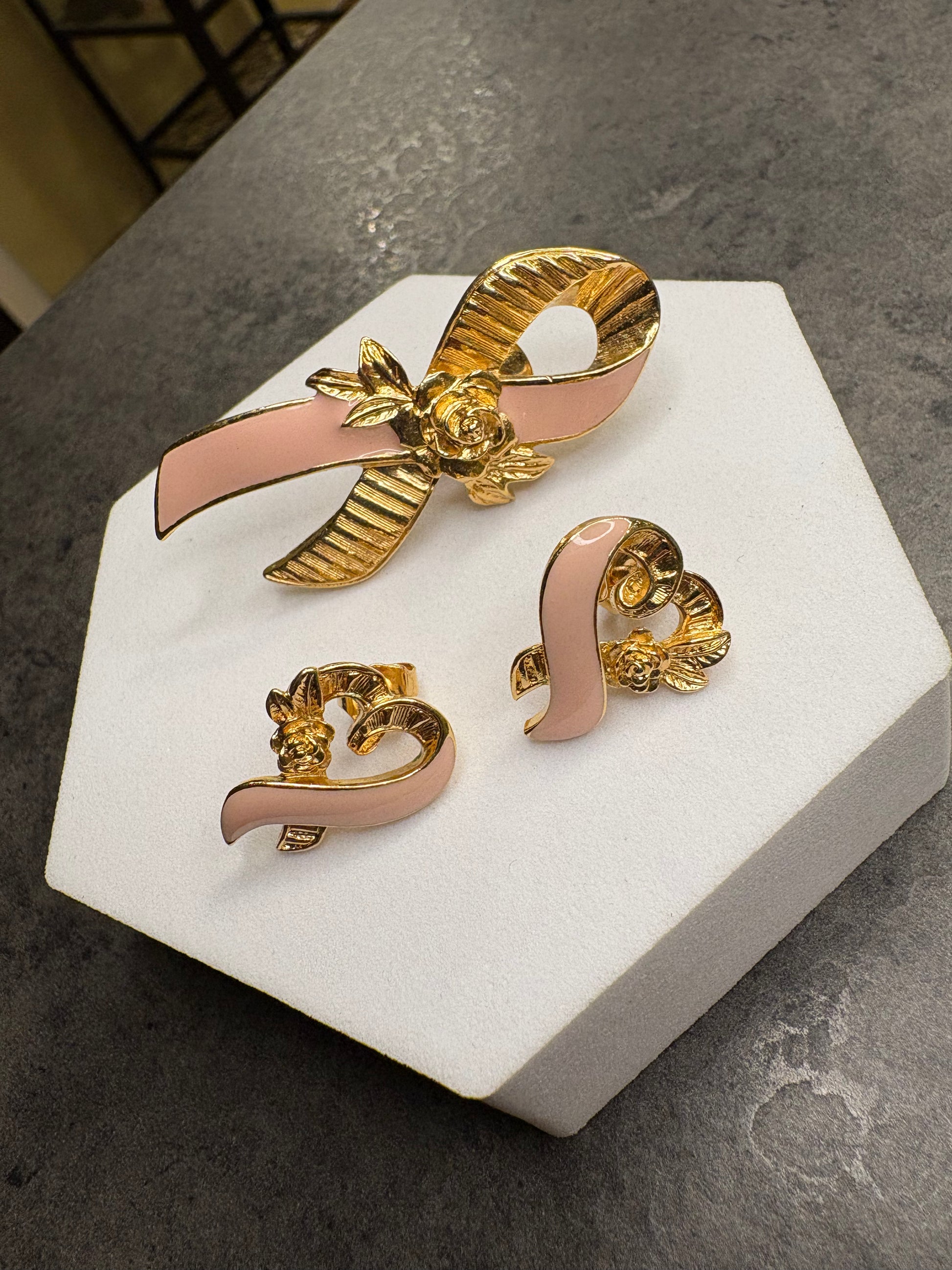 Questa delicata e simbolica demi-parure della collezione “Pink Ribbon”, composta da orecchini per lobi forati e spilla (pin). La spilla, realizzata nel 1993, e gli orecchini, prodotti nel 1996, riprendono il celebre motivo del fiocco rosa, simbolo universalmente legato alla sensibilizzazione e alla lotta contro il tumore al seno. I pezzi sono realizzati in metallo color oro con inserti smaltati rosa, con un design elegante, femminile e al tempo stesso sobrio, arricchito da piccoli dettagli decorativi che ne aumentano la raffinatezza senza appesantirli. Questa demi-parure unisce valore estetico e valore simbolico, rendendola particolarmente apprezzata sia dai collezionisti sia da chi ama indossare gioielli con un significato.