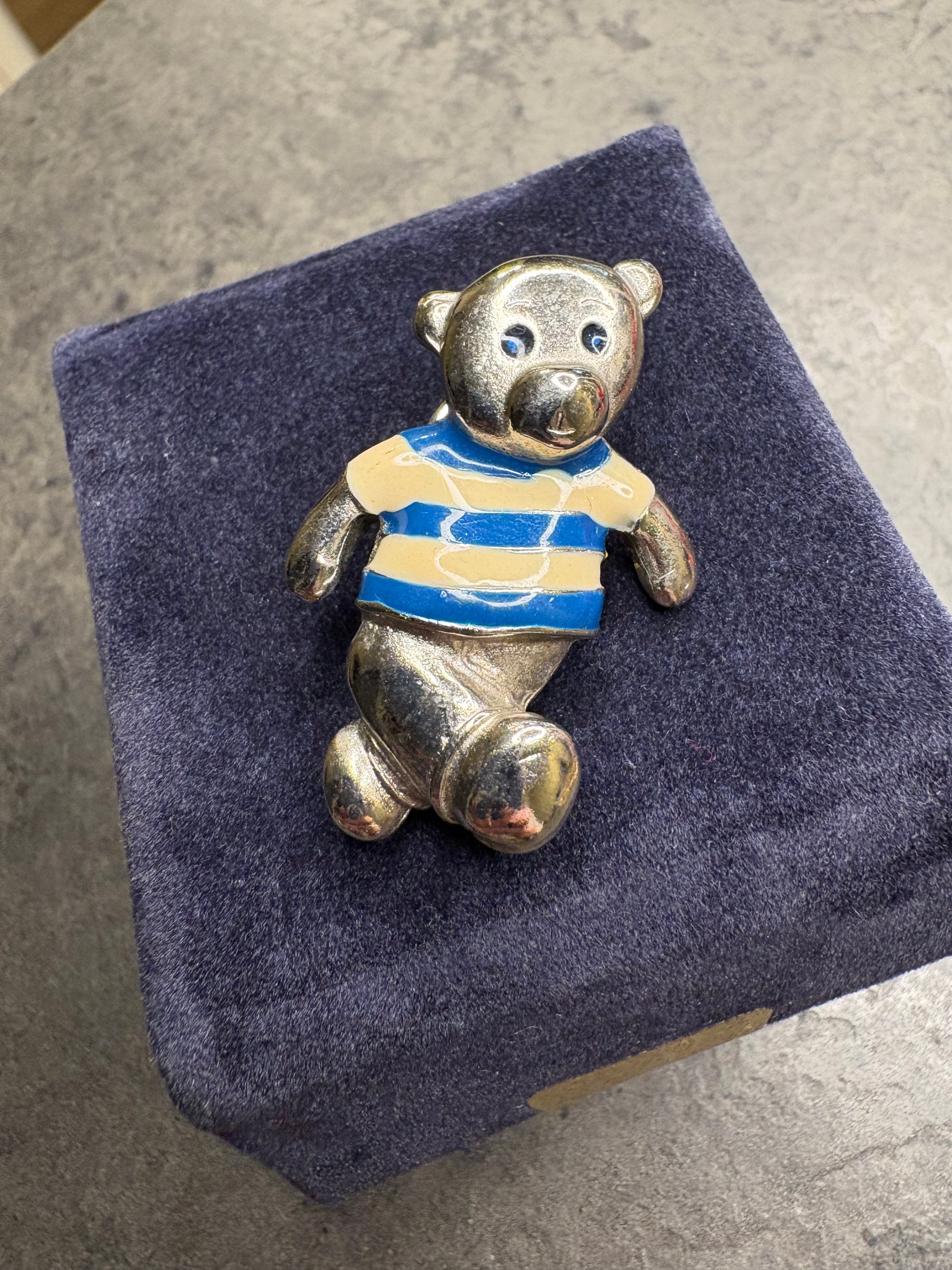 Questa adorabile pin vintage raffigura un simpatico orsetto stilizzato, un piccolo gioiello dal fascino giocoso e tenero. Realizzata in metallo argentato lucido, presenta una lavorazione tridimensionale che dona all’orsetto un aspetto morbido e “cicciottello”, quasi fosse un pupazzo in miniatura.