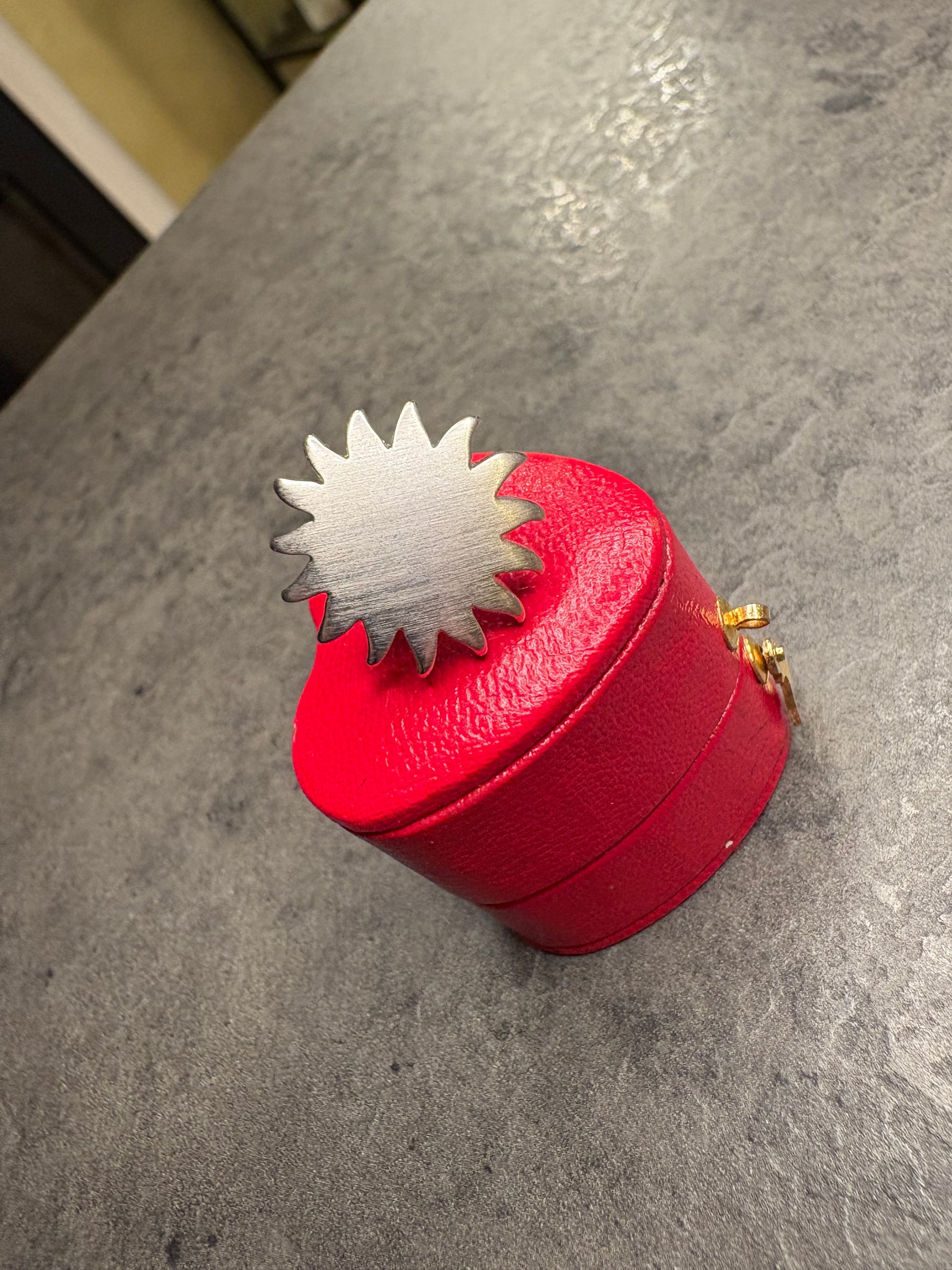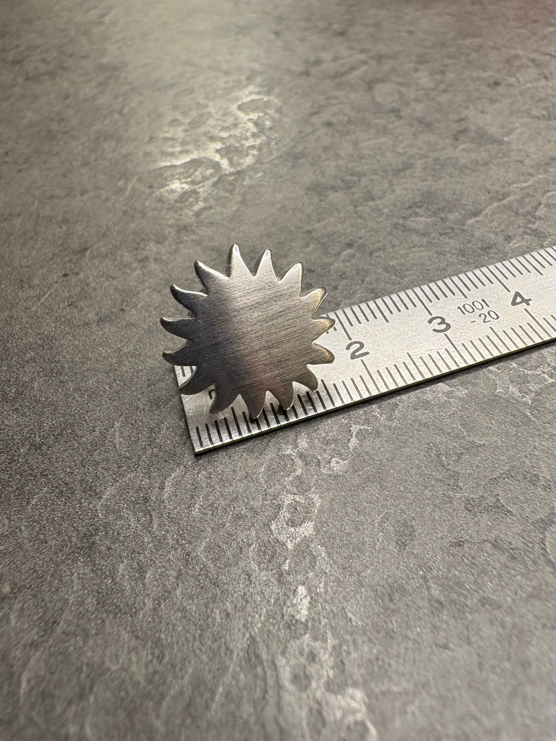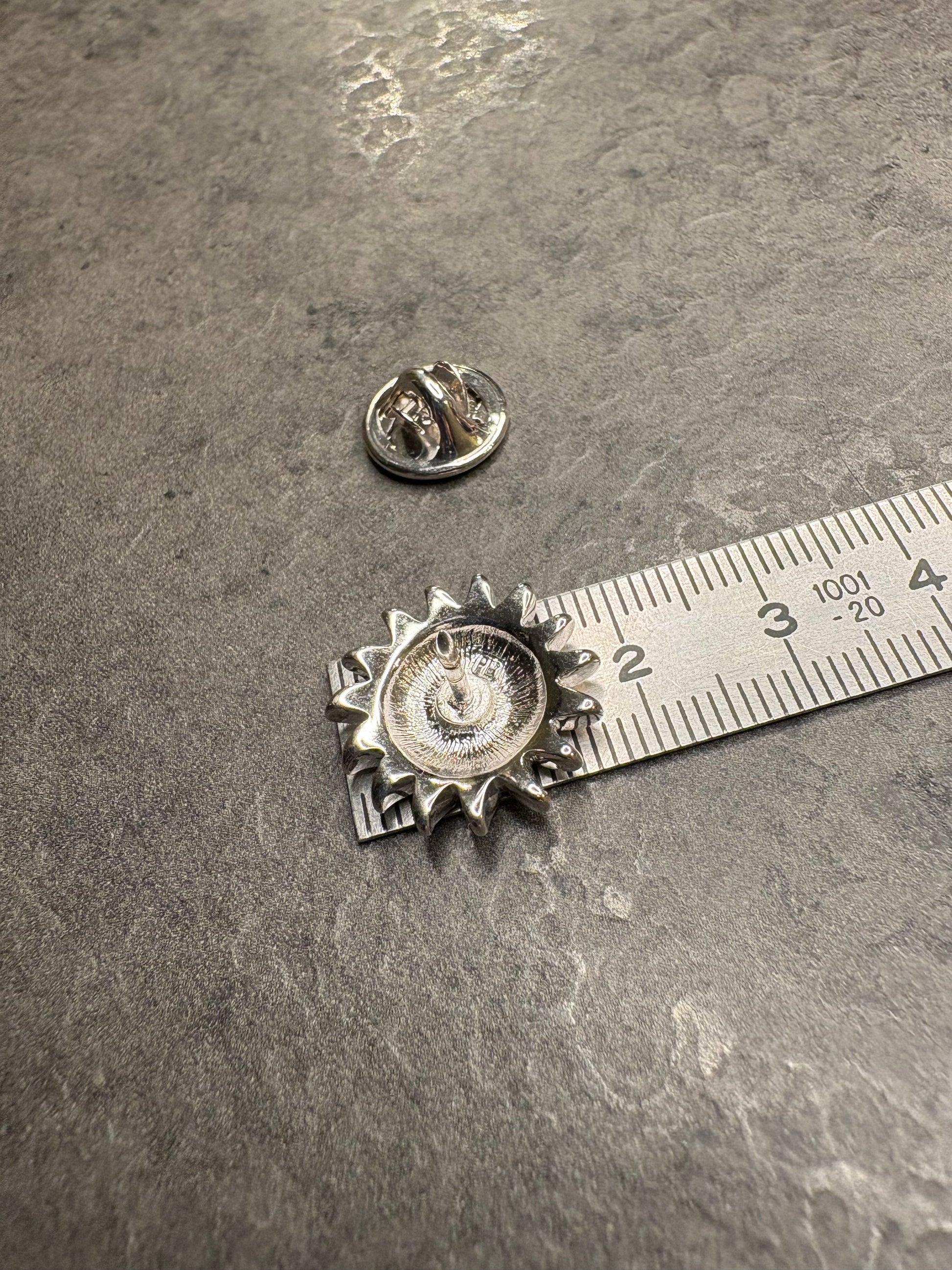 La spilla ha la forma stilizzata di un sole radiante, con raggi appuntiti disposti a raggiera. La parte frontale presenta una finitura opaca color argento, che dona al gioiello un aspetto elegante e sobrio, perfetto per un look moderno e sofisticato.