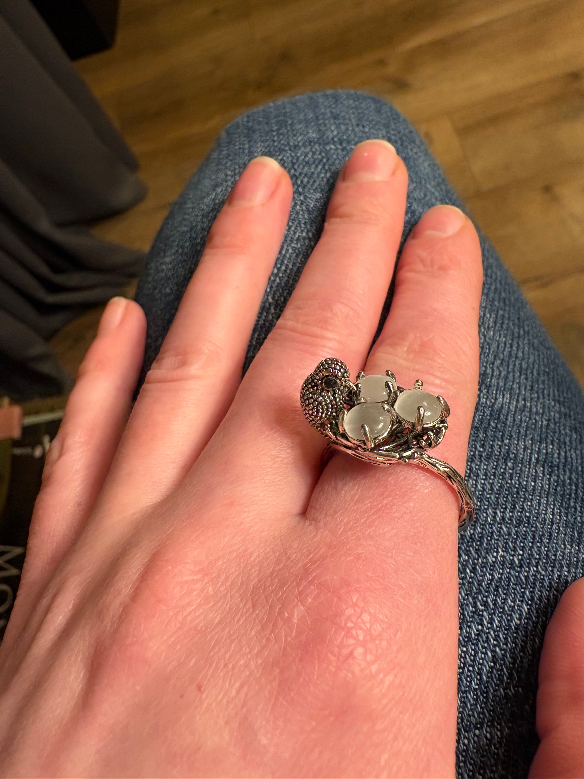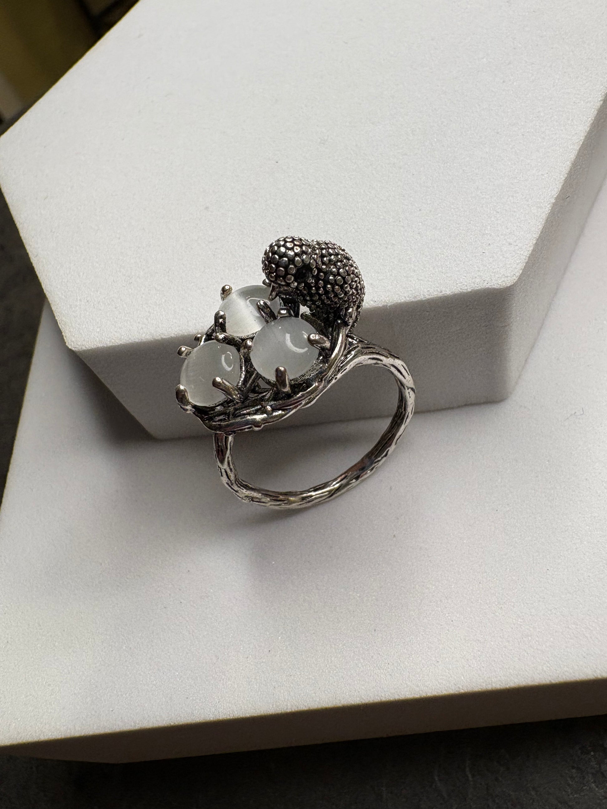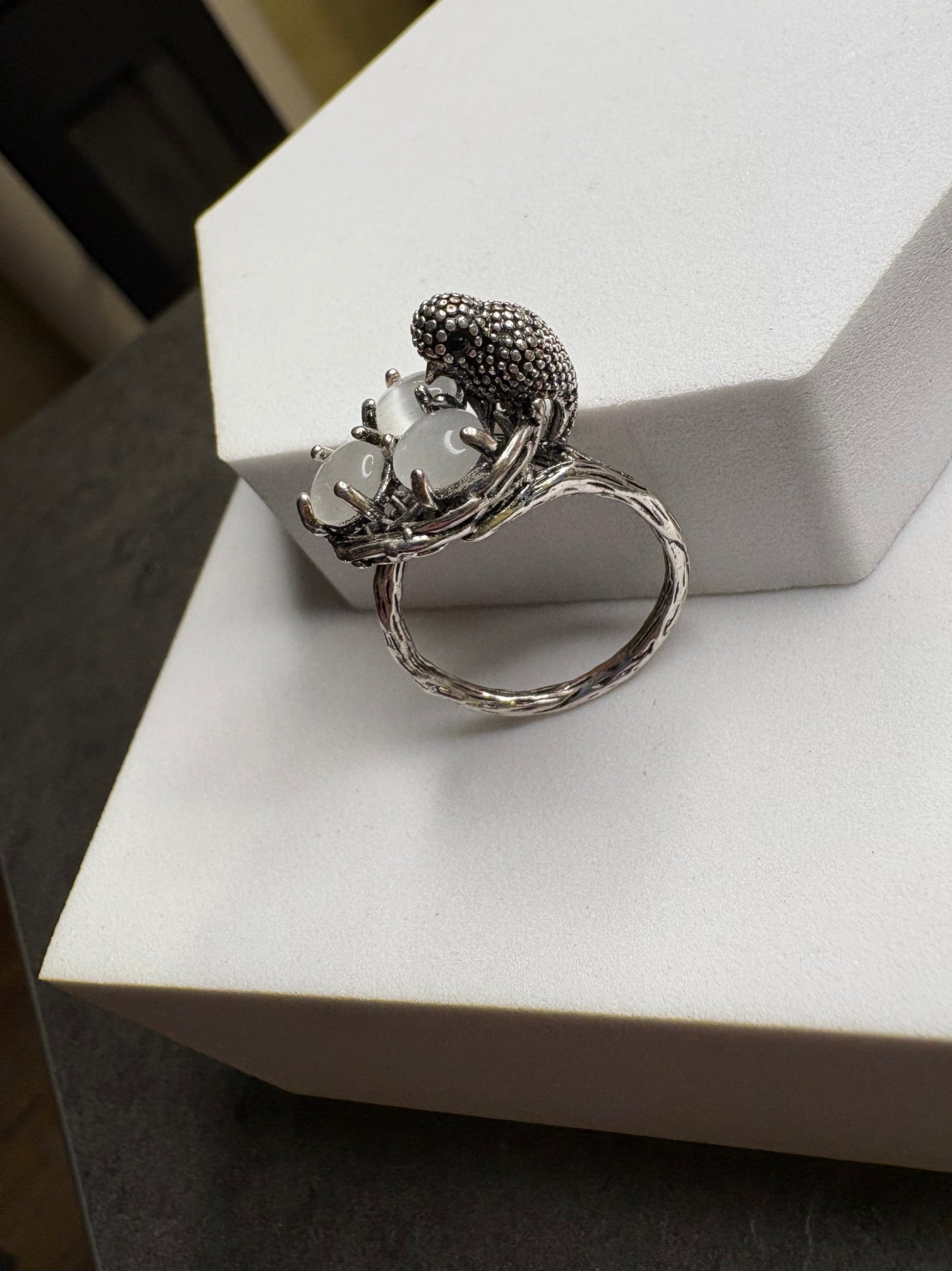 Particolarissimo anello di bigiotteria in metallo color argento, caratterizzato da una forma scultorea che rappresenta il un nido con tre uova che sostiene un piccolo uccello stilizzato, simbolo di libertà e delicatezza. La lavorazione è ricca di dettagli e richiama motivi organici e naturalistici, con una struttura solida ma visivamente leggera. Un gioiello originale e poetico, perfetto per chi ama pezzi non convenzionali dal forte impatto visivo.