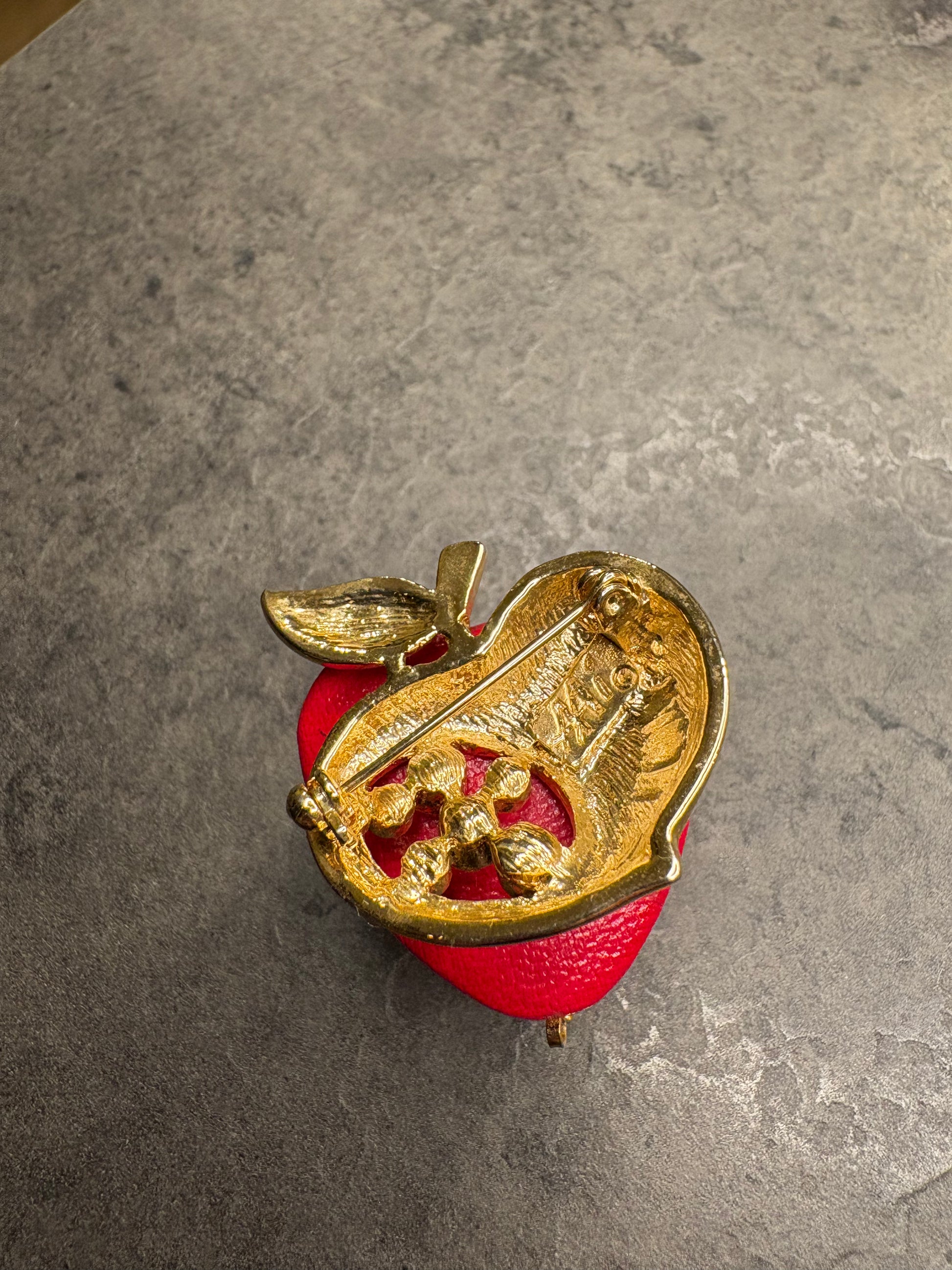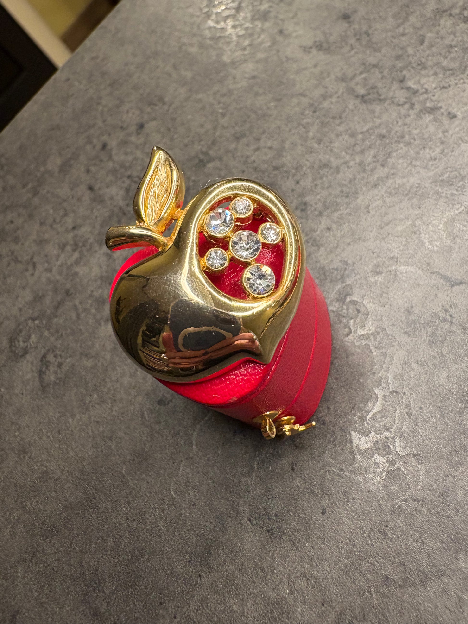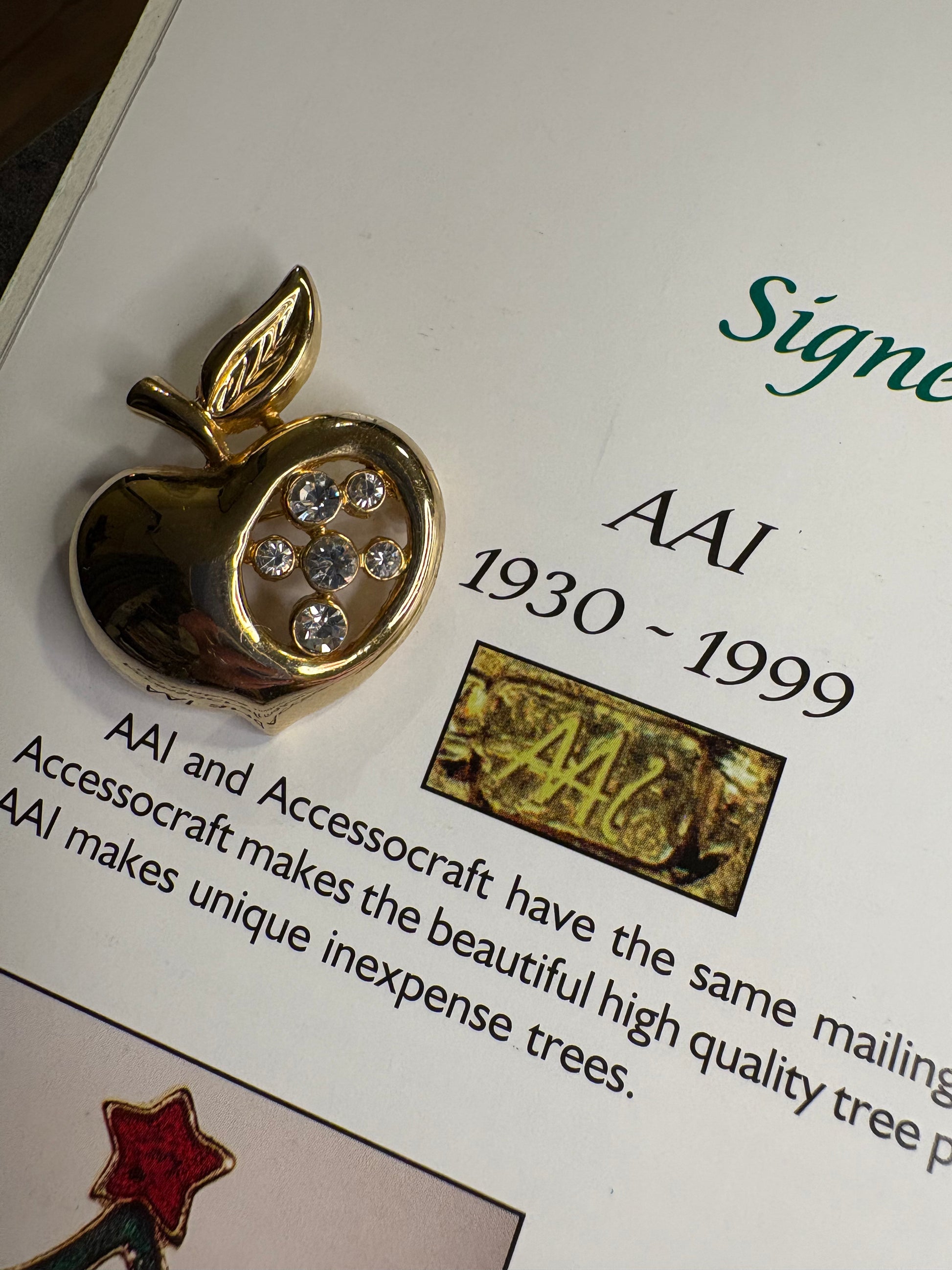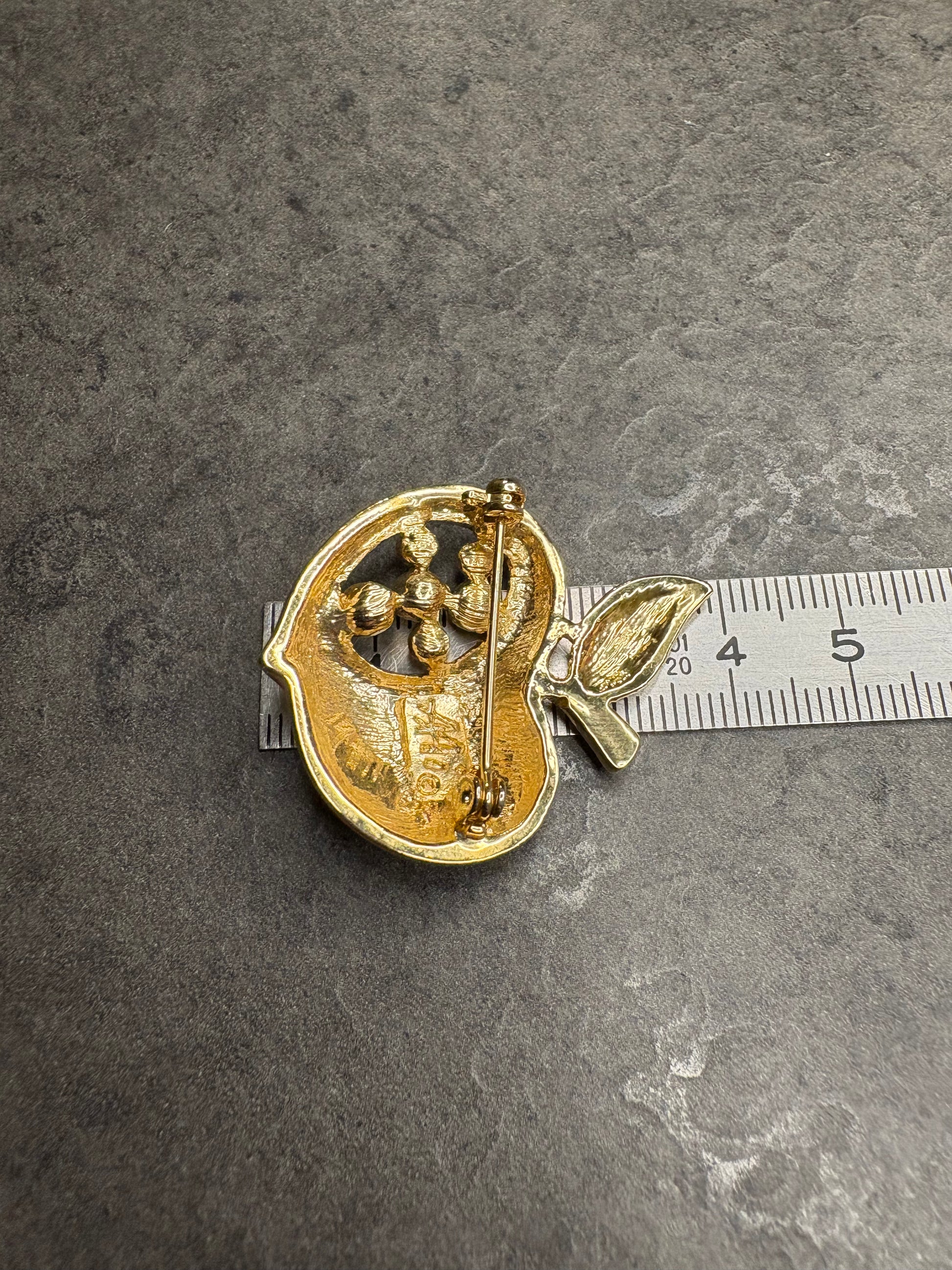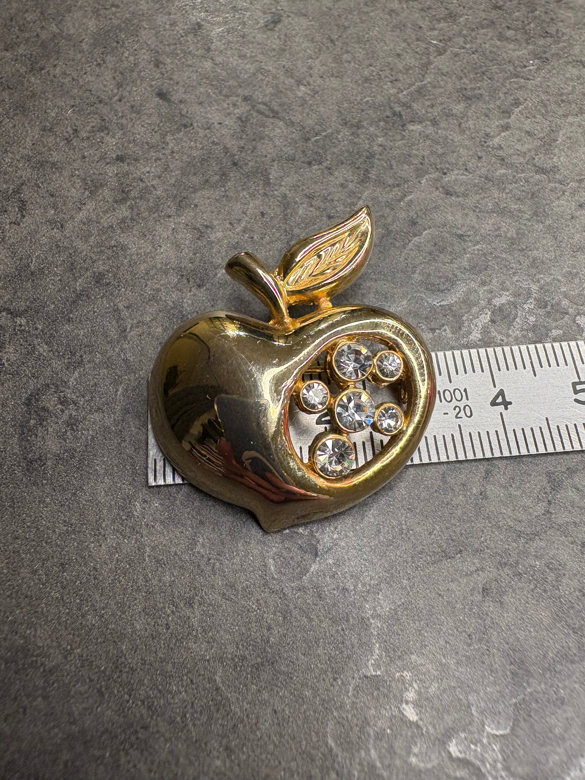 Deliziosa spilla vintage firmata AAI, raffigurante una mela stilizzata in metallo dorato lucente. Il design, semplice ma di grande effetto, è impreziosito da sei luminosi strass trasparenti incastonati al centro del frutto, che creano un raffinato contrasto con la superficie dorata e levigata. Il gambo e la foglia, elegantemente incisi, aggiungono un tocco di realismo e movimento alla composizione.