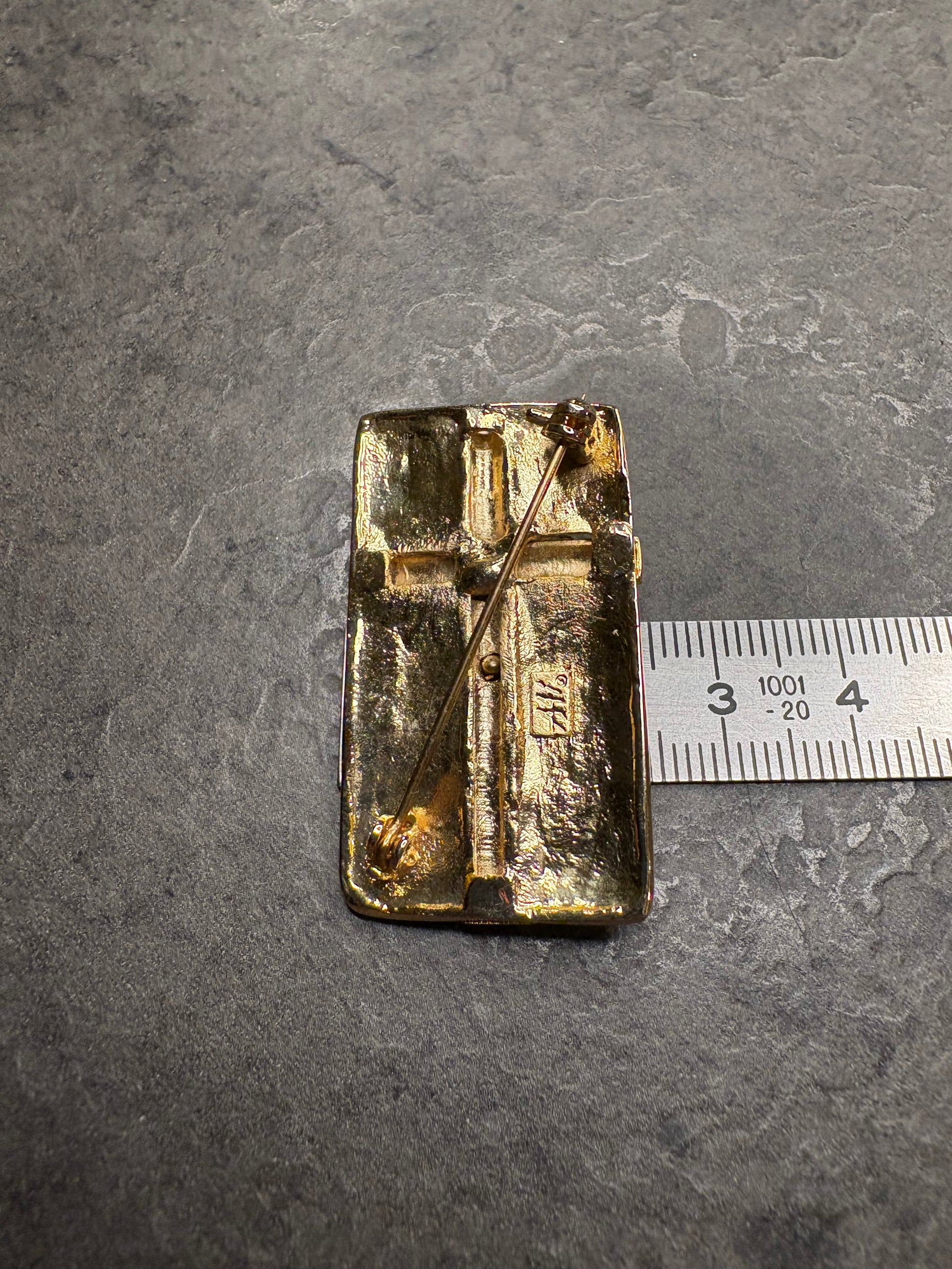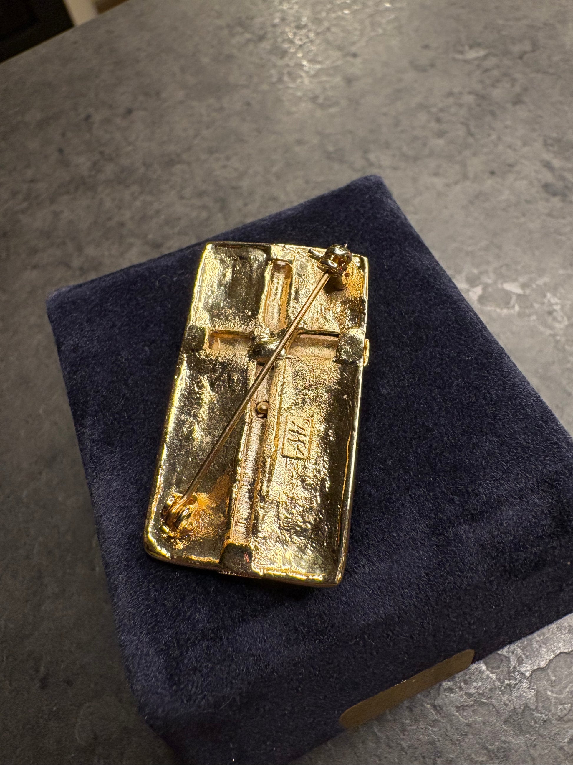Questa affascinante spilla vintage firmata AAI sembra un piccolo scrigno di eleganza, trasformando un semplice “pacchetto regalo” in un gioiello raffinato e dal forte impatto visivo. Realizzata in metallo dorato dalla lucentezza ricca e calda, presenta una silhouette rettangolare morbida e leggermente bombata, che riflette la luce con grande intensità.