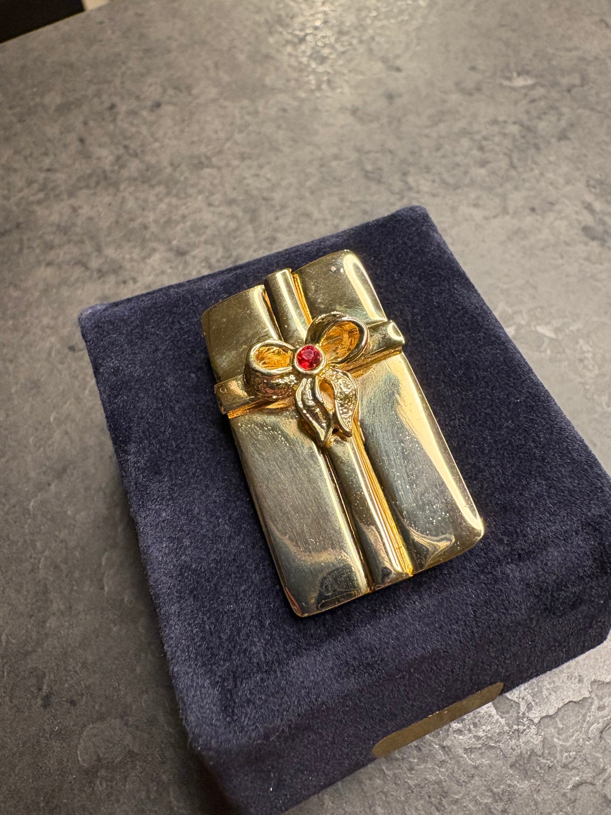Sul fronte, due bande verticali stilizzate imitano i nastri di un dono prezioso, mentre al centro spicca un fiocco scolpito con cura, dalle forme piene e armoniose. Al cuore del fiocco brilla una pietra rossa, vivida e luminosa, che aggiunge un accento di colore raffinato e interrompe perfettamente il bagliore dell’oro. L’effetto complessivo è elegante, festoso e sorprendentemente moderno nonostante il carattere vintage del pezzo.