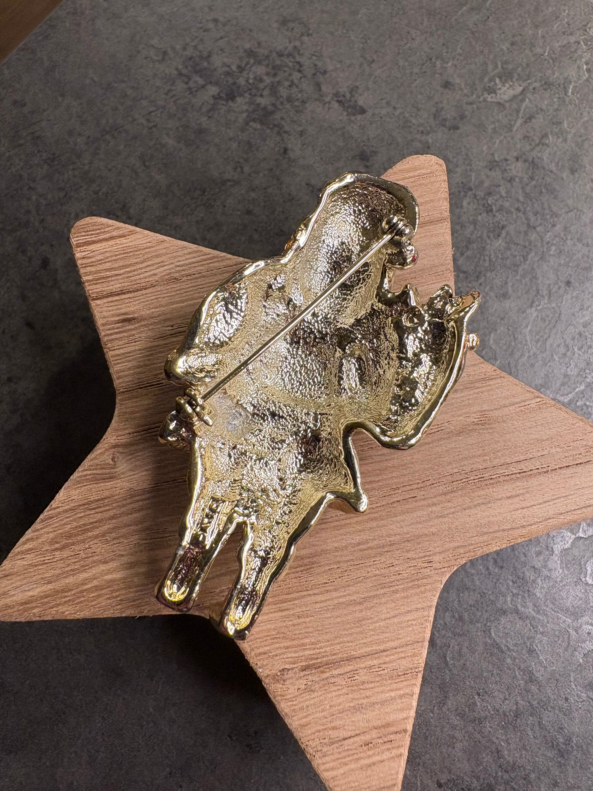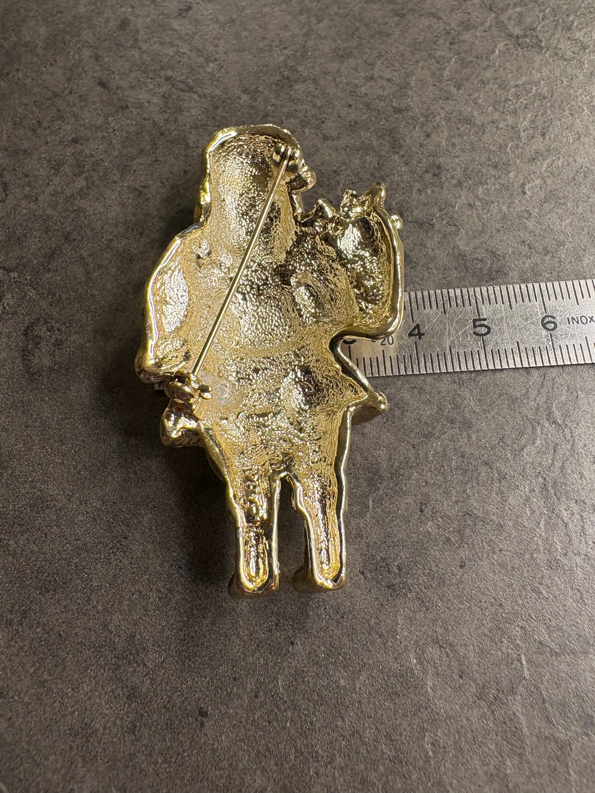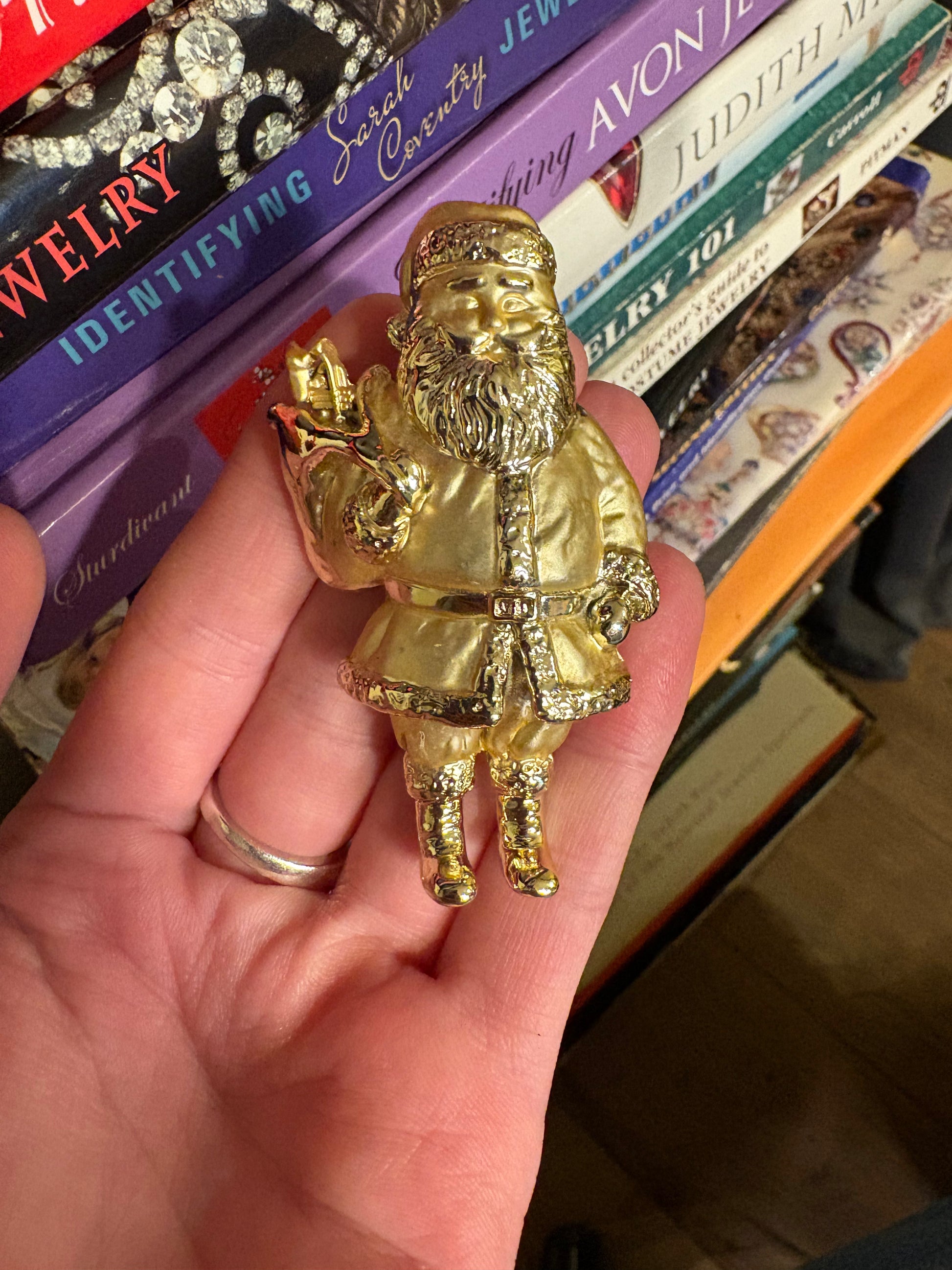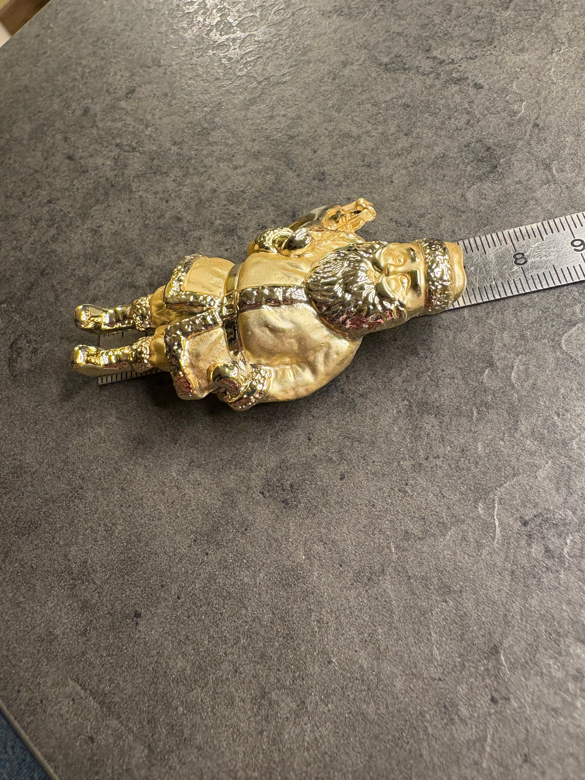 È una deliziosa spilla vintage firmata AJC (American Jewelry Chain Co.), che rappresenta un allegro Babbo Natale a figura intera, realizzata in metallo dorato con una raffinata doppia finitura lucida e opaca che dona profondità e movimento al pezzo.