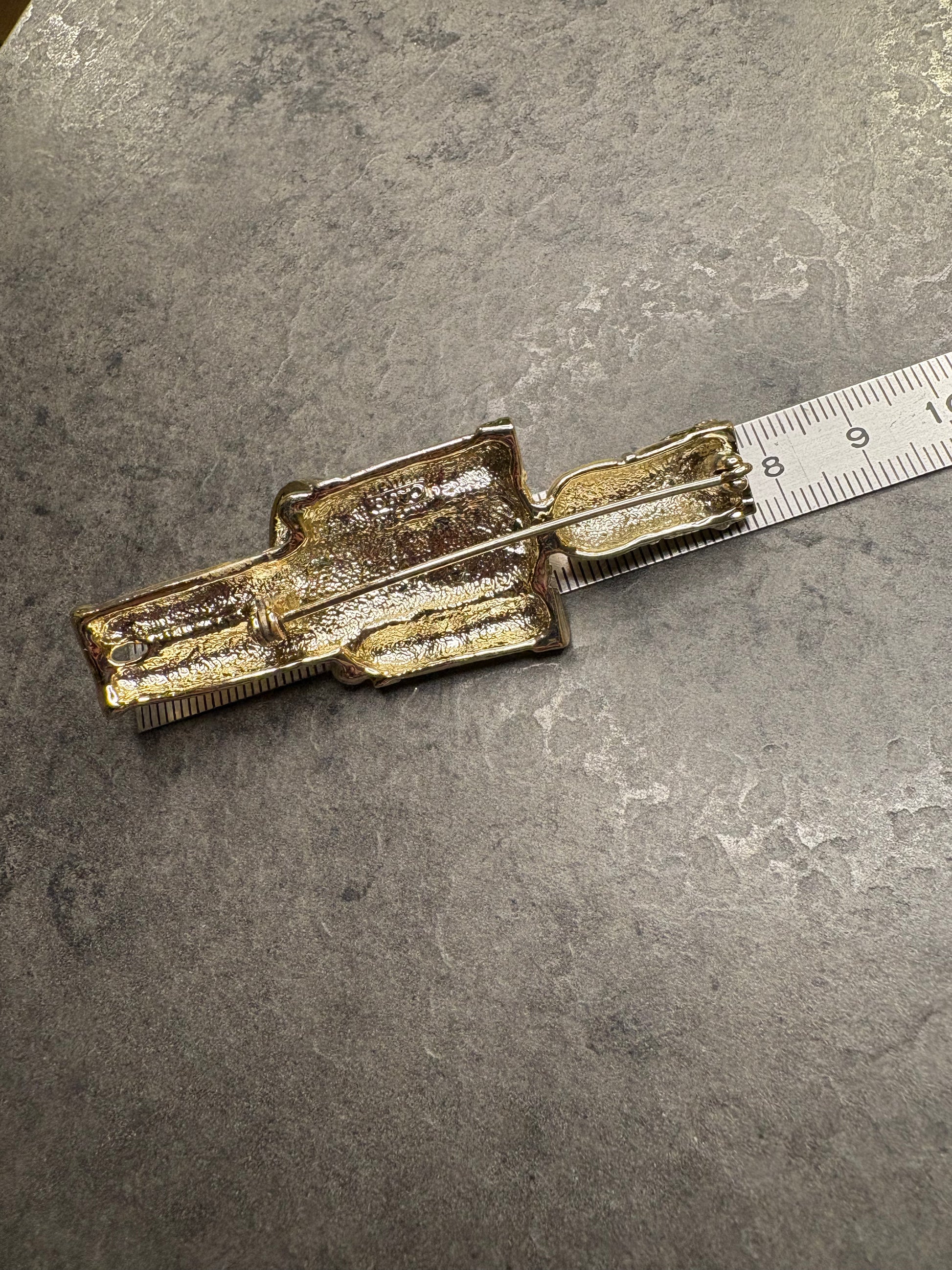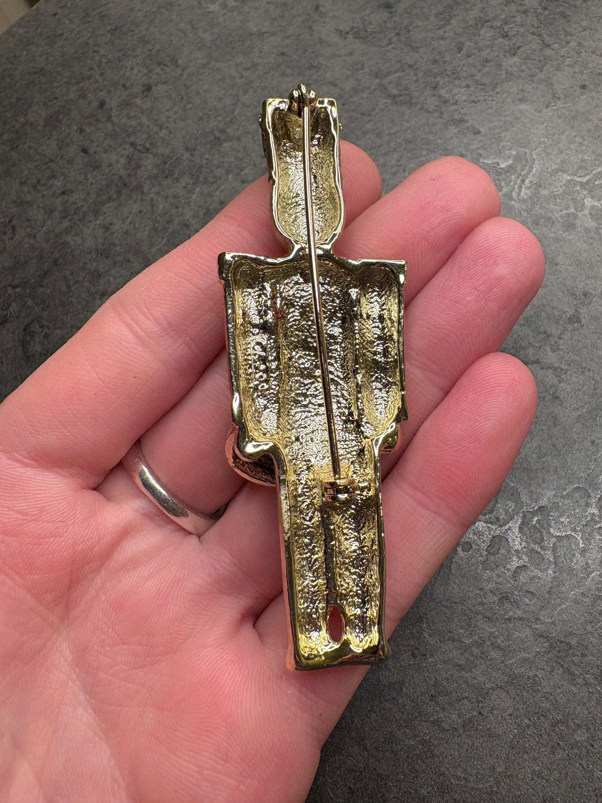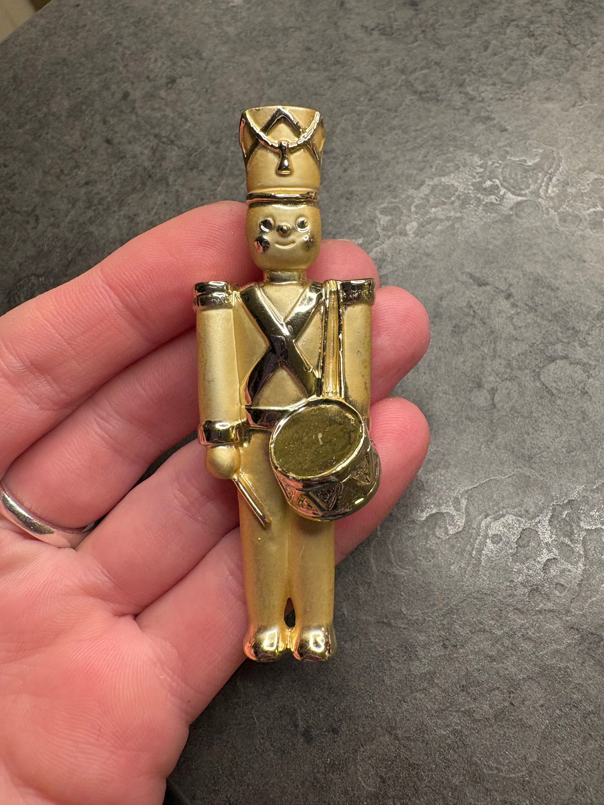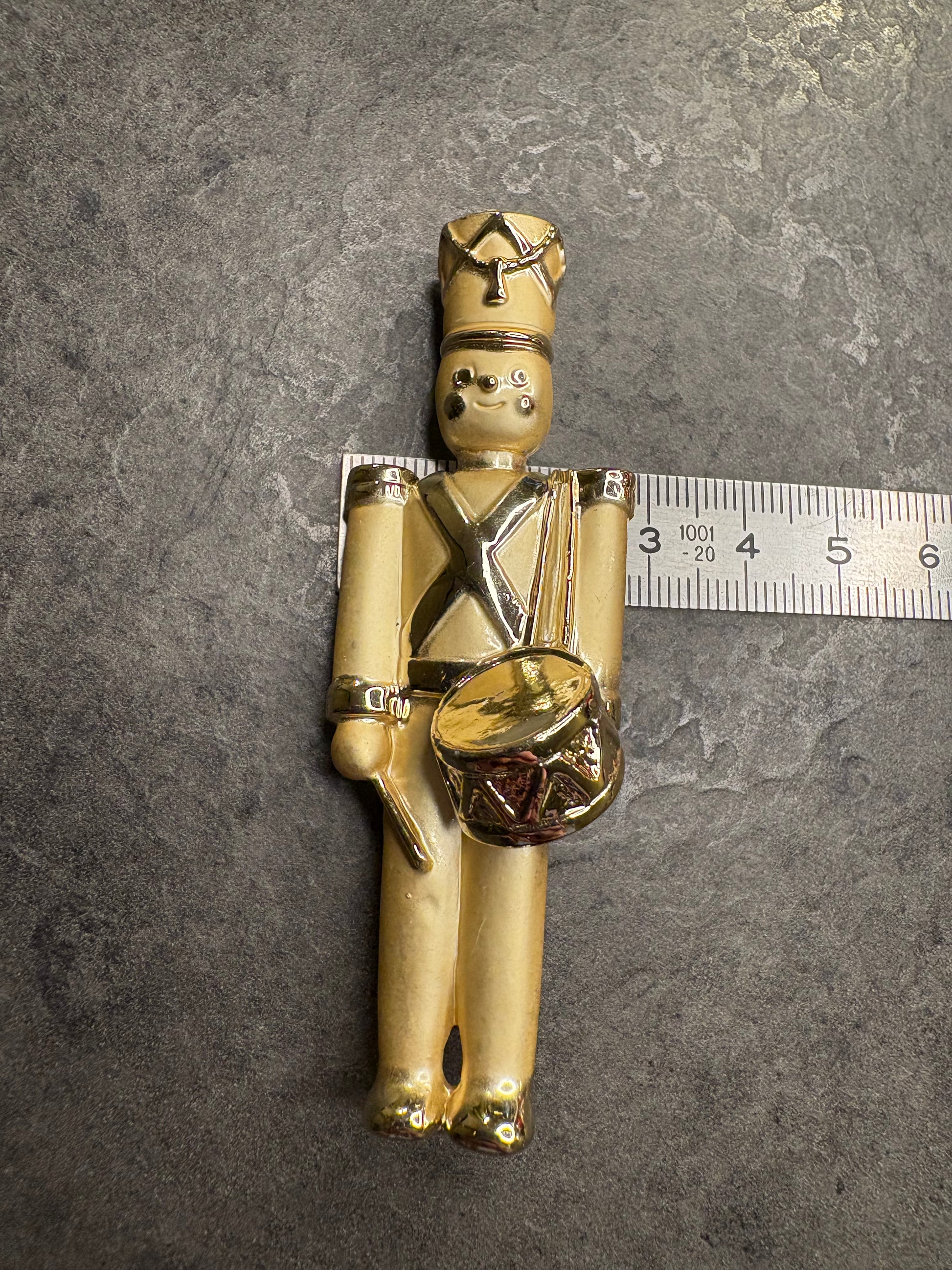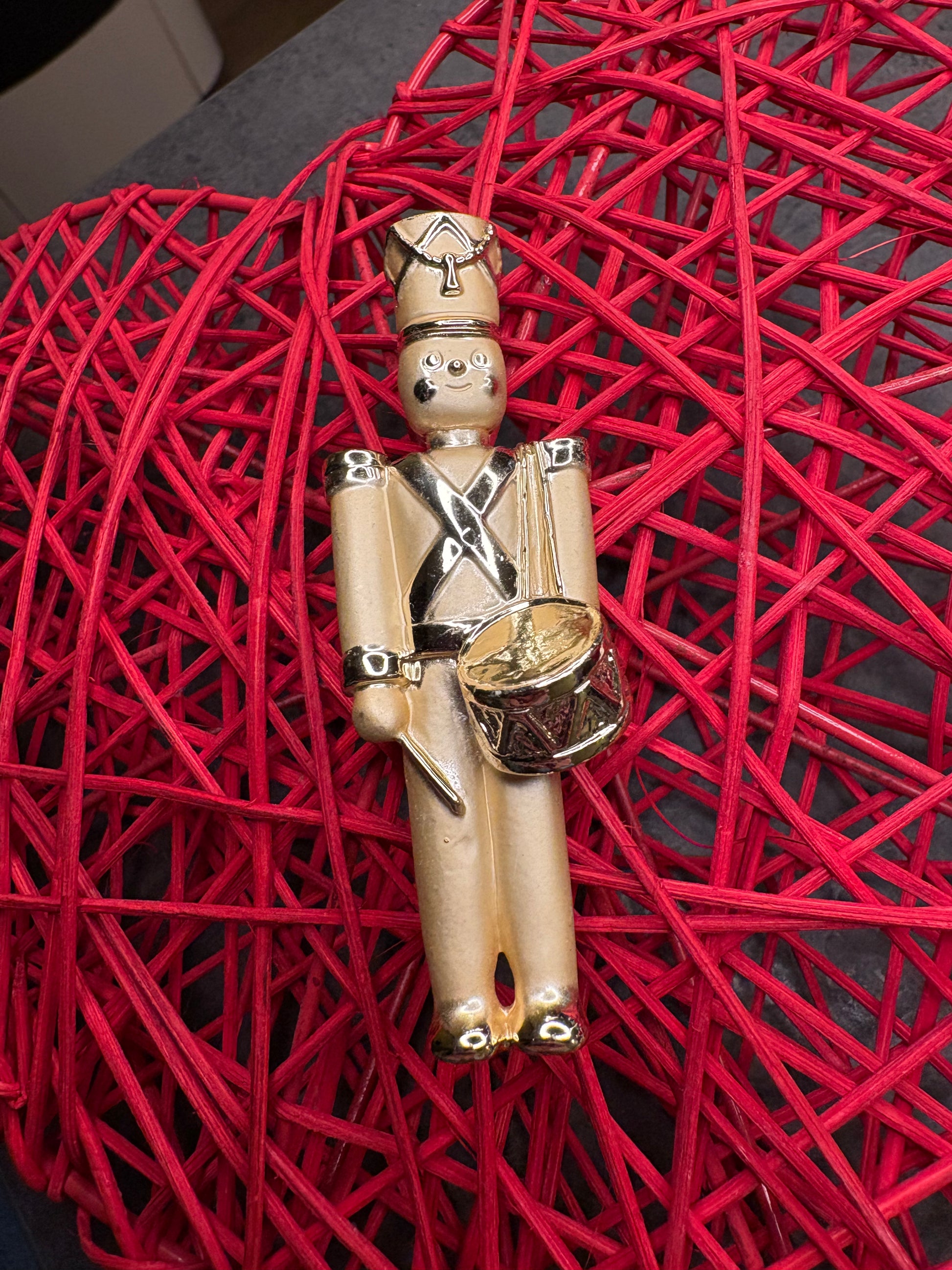 La spilla raffigura un soldatino decorativo in metallo dorato, caratterizzato da una forma allungata e da una presenza grafica molto pulita. La figura è costruita attraverso volumi semplici e ben definiti: il busto compatto, le braccia rigide e le gambe dritte richiamano l’aspetto ordinato dei soldatini tradizionali.