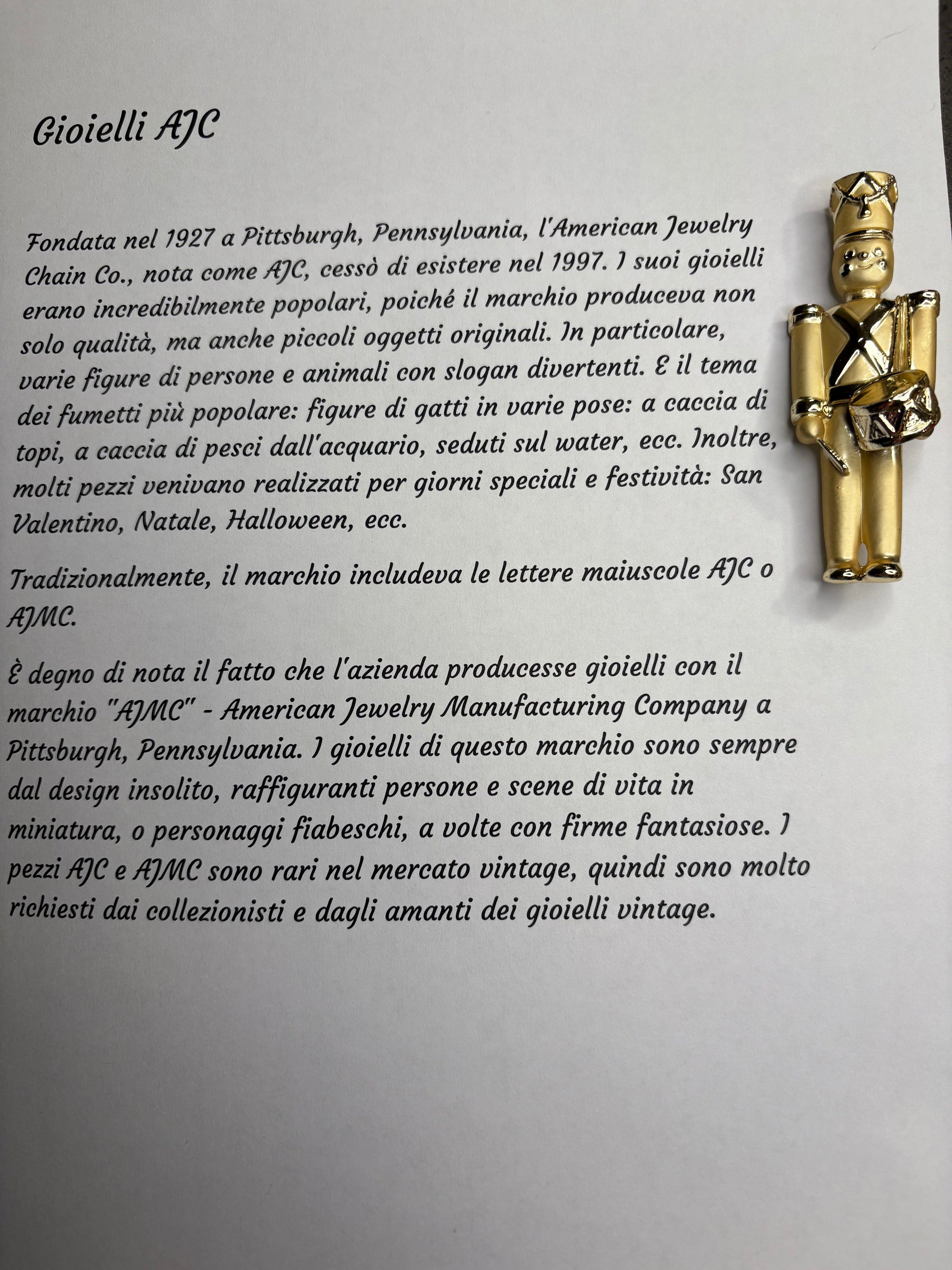 Il cappello alto, solido e geometrico, domina la parte superiore della figura e ne rafforza la verticalità. Al centro, il tamburo è reso con leggere incisioni che ne definiscono i bordi, diventando il punto focale della spilla senza appesantirla. Il volto è appena suggerito, con tratti minimi che lasciano spazio all’interpretazione. L’insieme ha un carattere elegante e un po’ giocoso, tipico delle spille figurative AJC, capace di evocare un’atmosfera nostalgica e festiva mantenendo uno stile essenziale e raffinato.