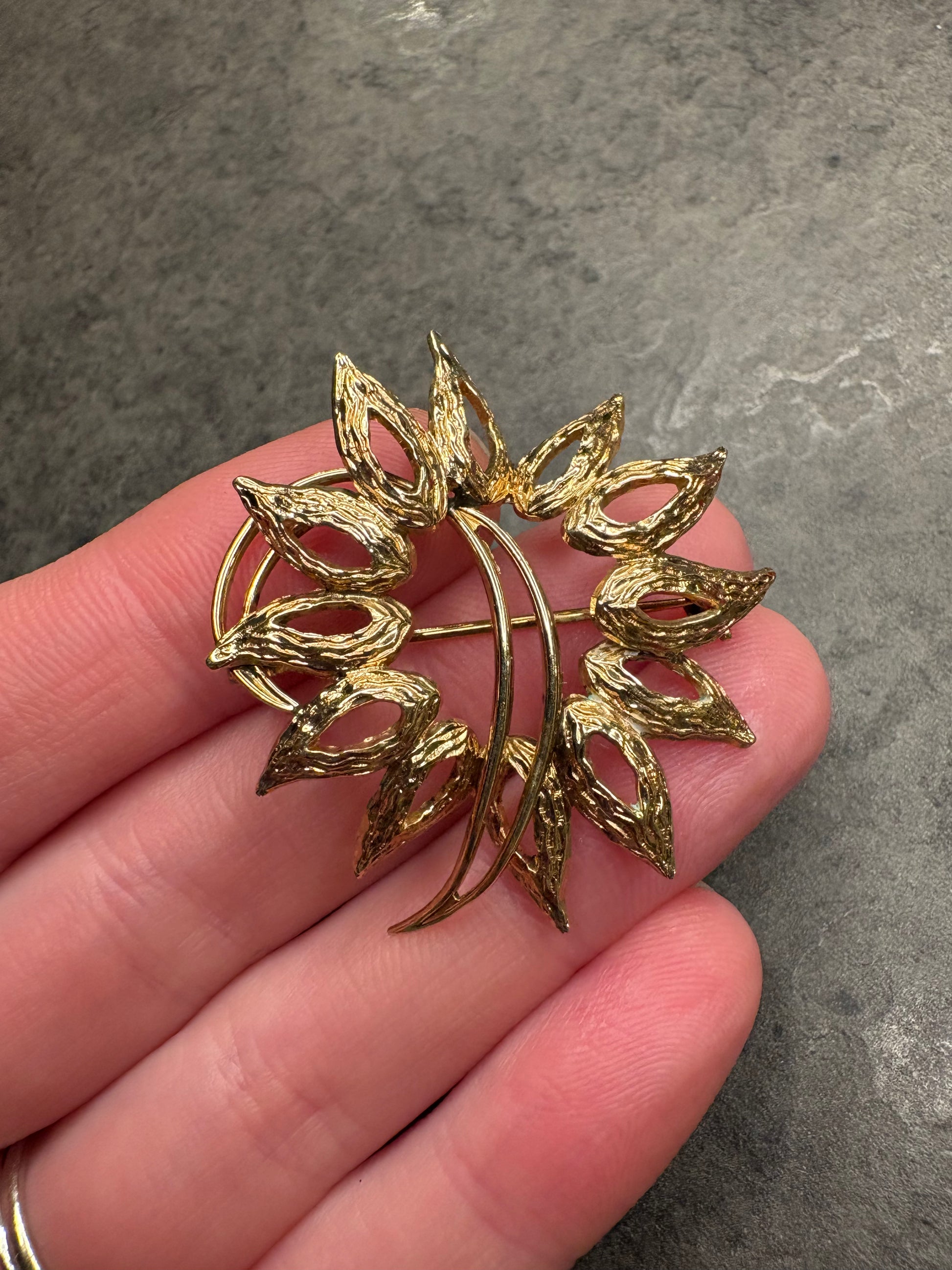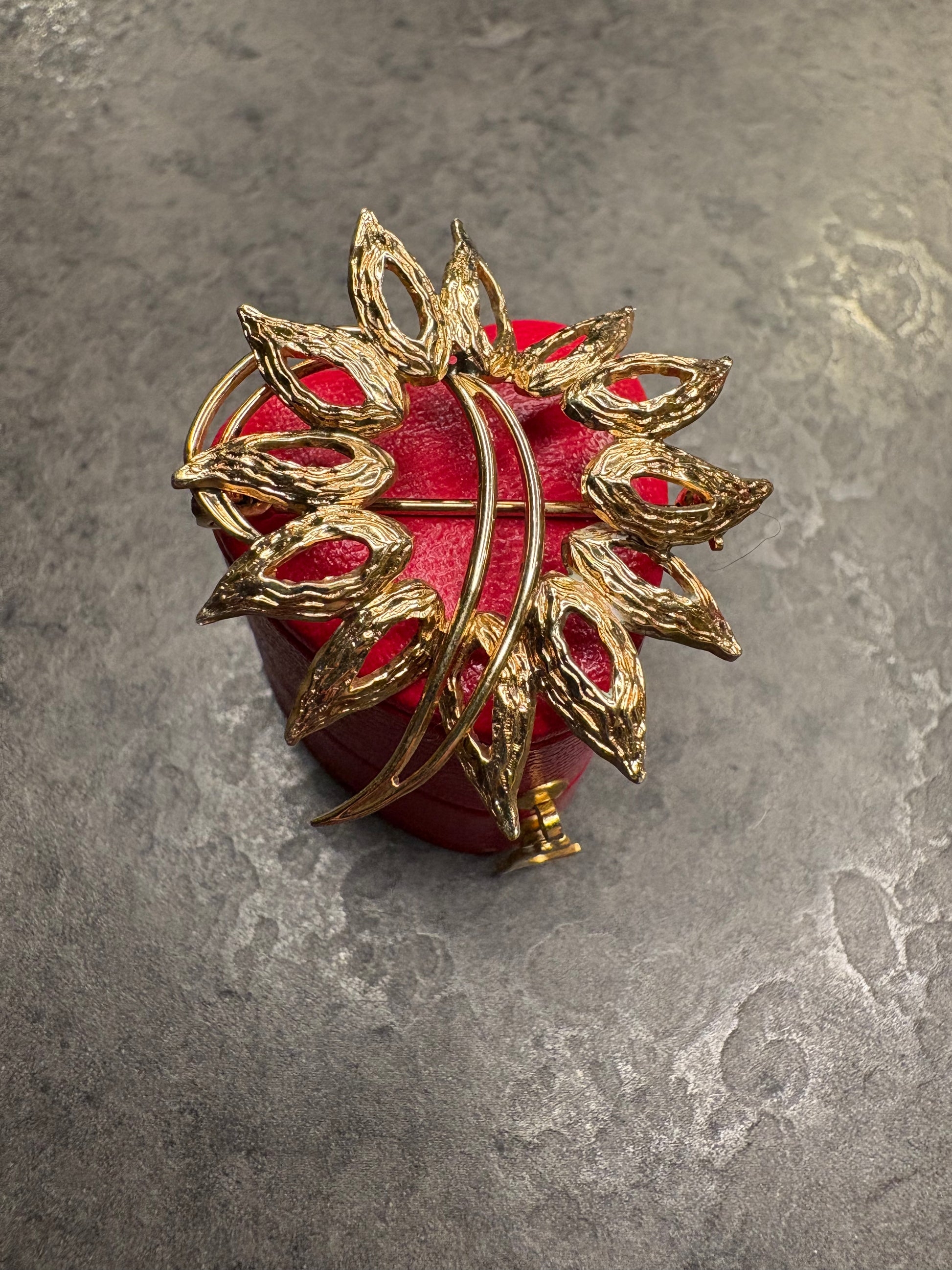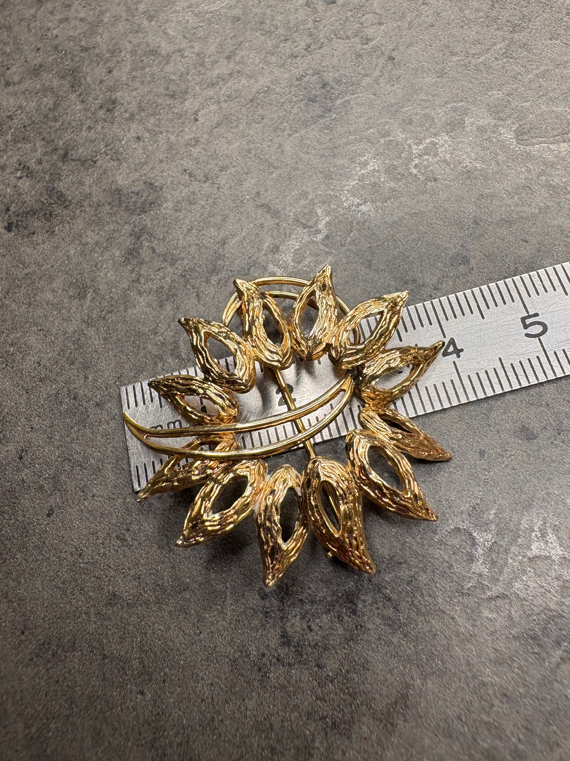 La spilla presenta una composizione floreale stilizzata, costruita su un cerchio aperto da cui si diramano eleganti elementi fogliari. Le foglie allungate e traforate, disposte a raggiera, creano un movimento armonioso e dinamico, con superfici volutamente irregolari che imitano la texture naturale delle venature. Due sottili steli centrali slanciano ulteriormente la forma, aggiungendo equilibrio e un tocco di leggerezza.