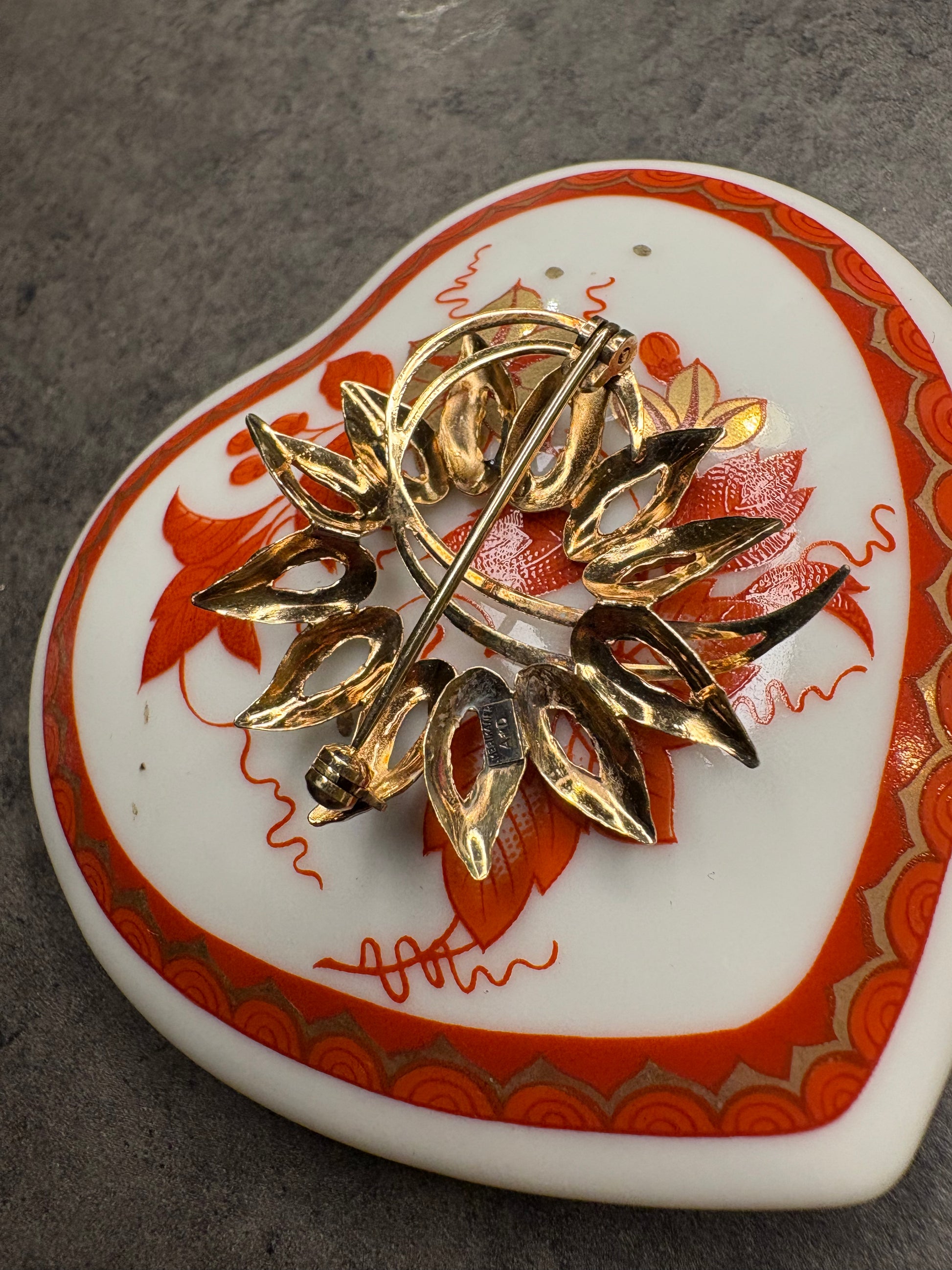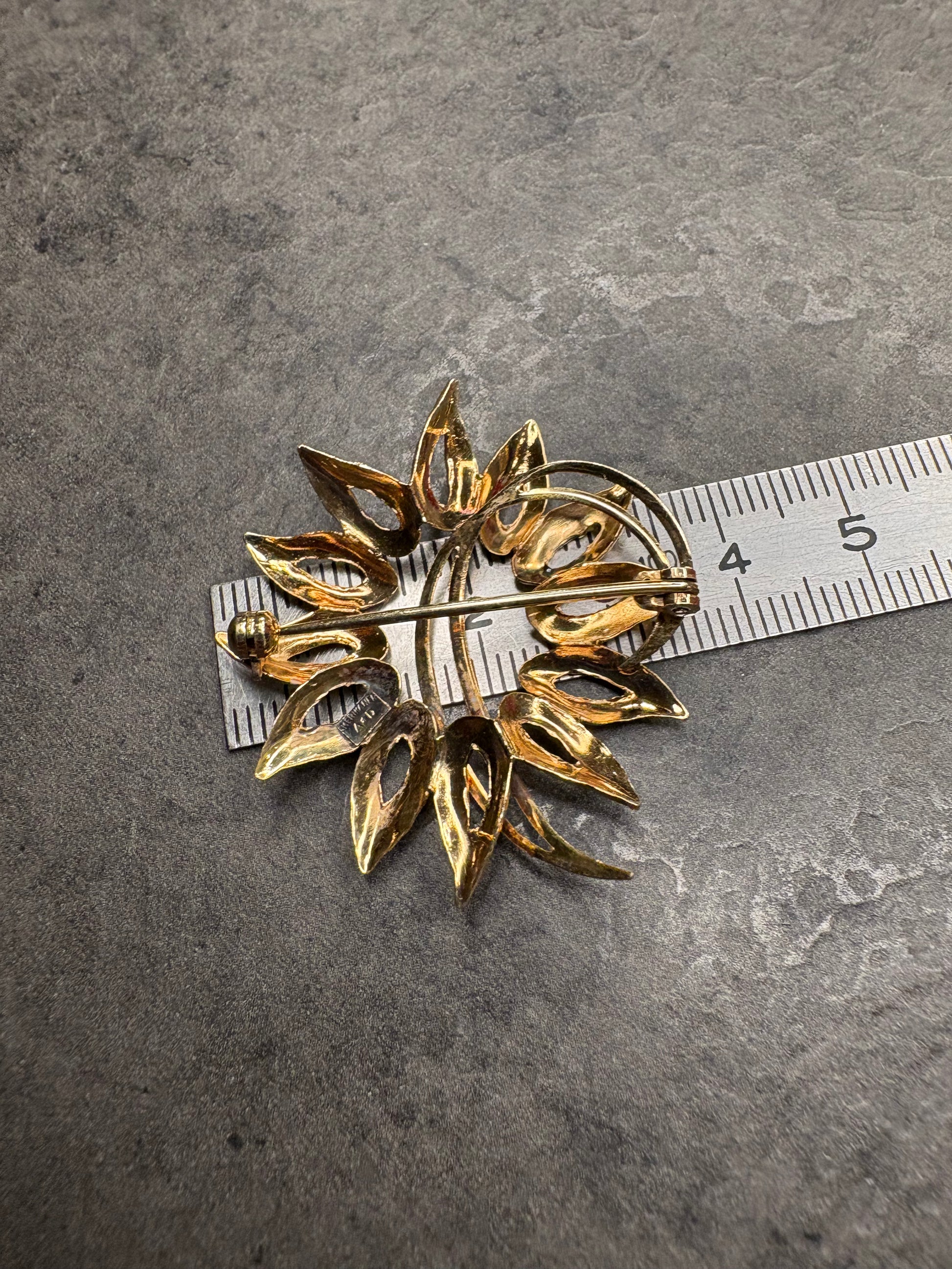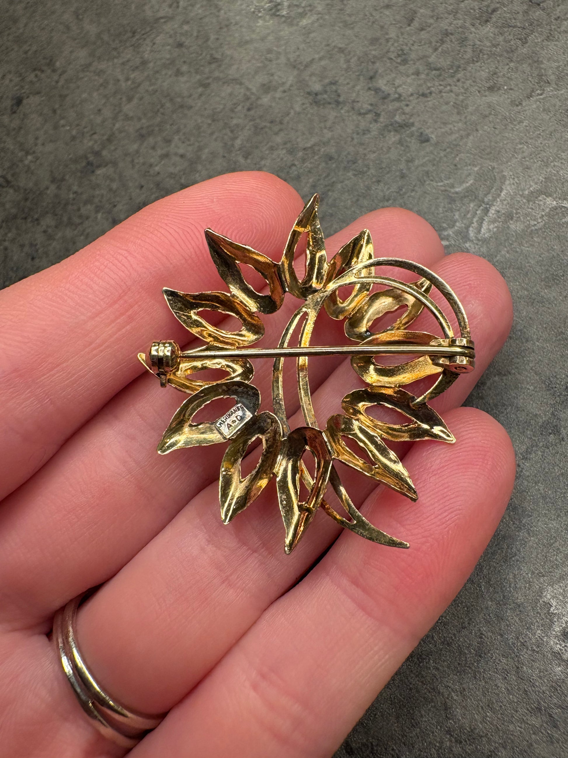 Questa splendida spilla vintage firmata Andreas Daub è un esempio raffinato della maestria tedesca nella bigiotteria placcata in Amerikaner, la caratteristica doratura a lunga durata utilizzata dalla maison fin dagli inizi del Novecento.