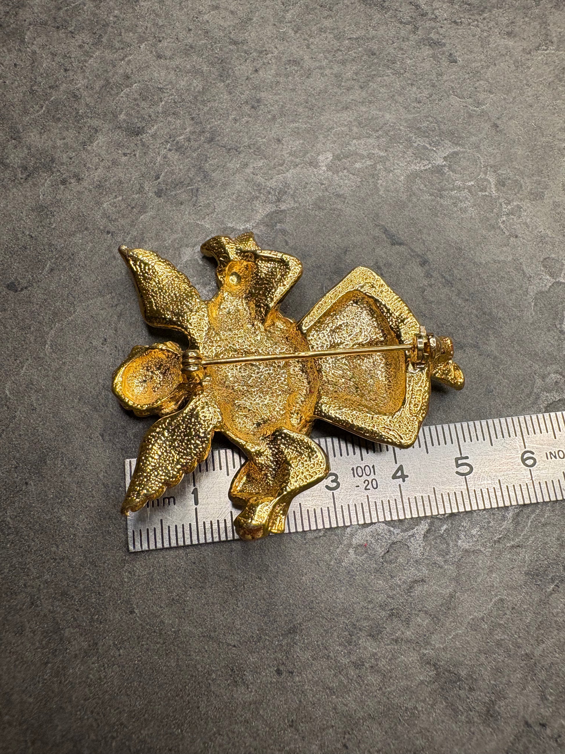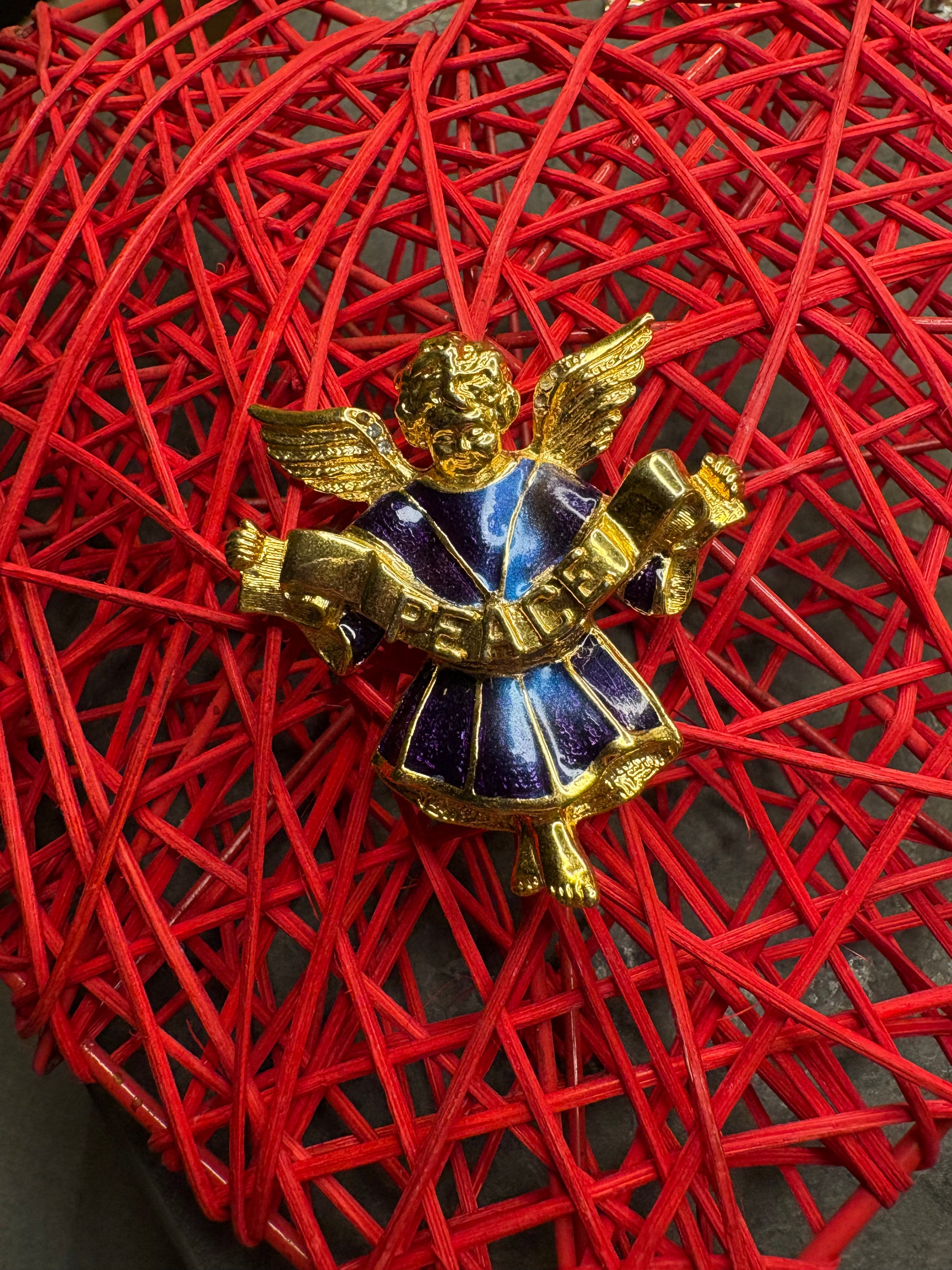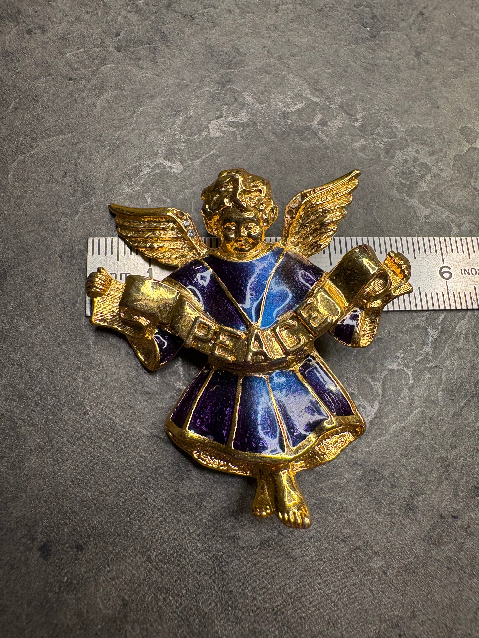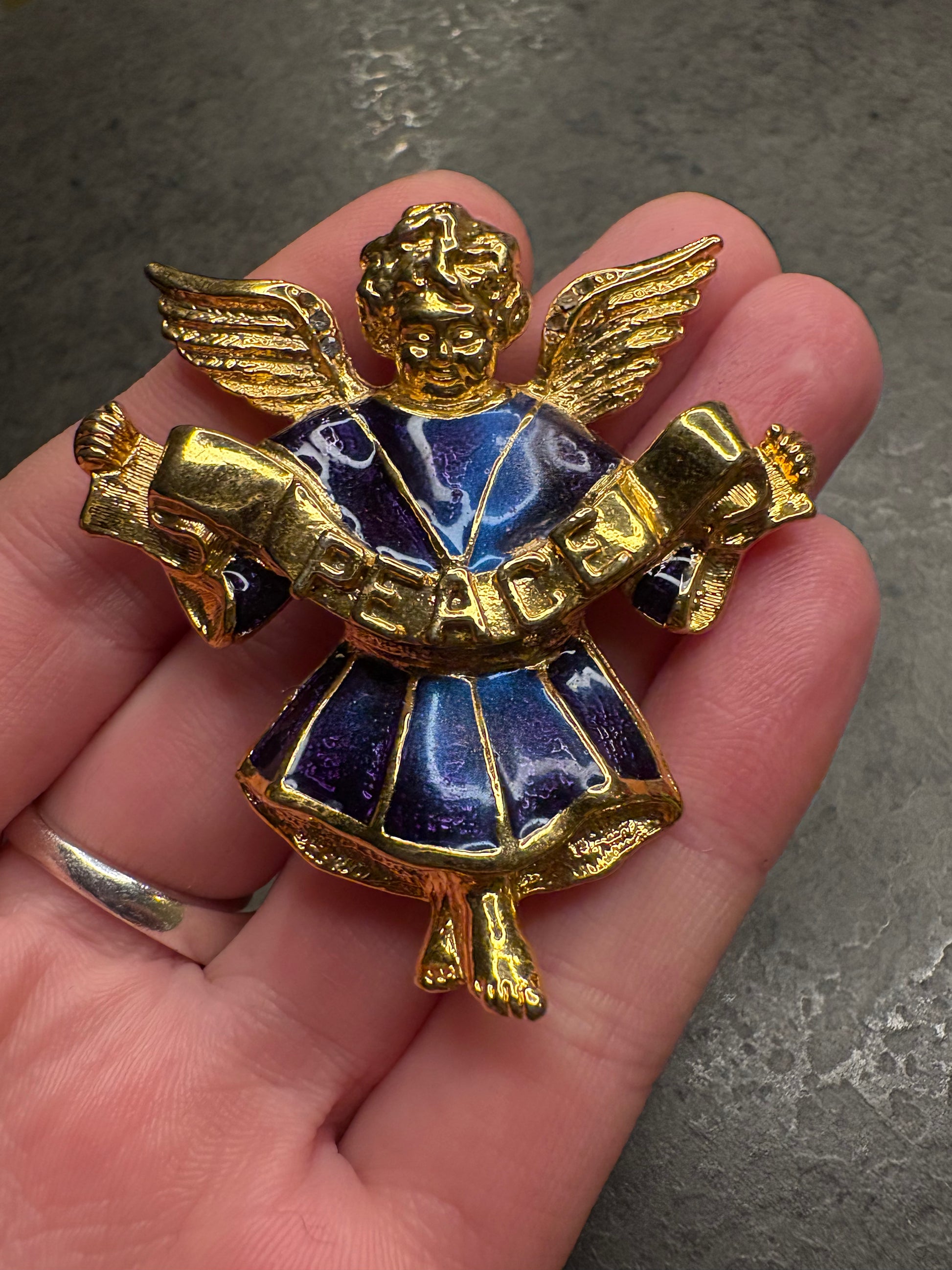 Deliziosa spilla vintage natalizia raffigurante un angelo dorato con ali spiegate e un cartiglio che reca la scritta PEACE. Un simbolo intramontabile di armonia e serenità, reso con la dolcezza e la cura dei dettagli tipica dei bijoux americani.