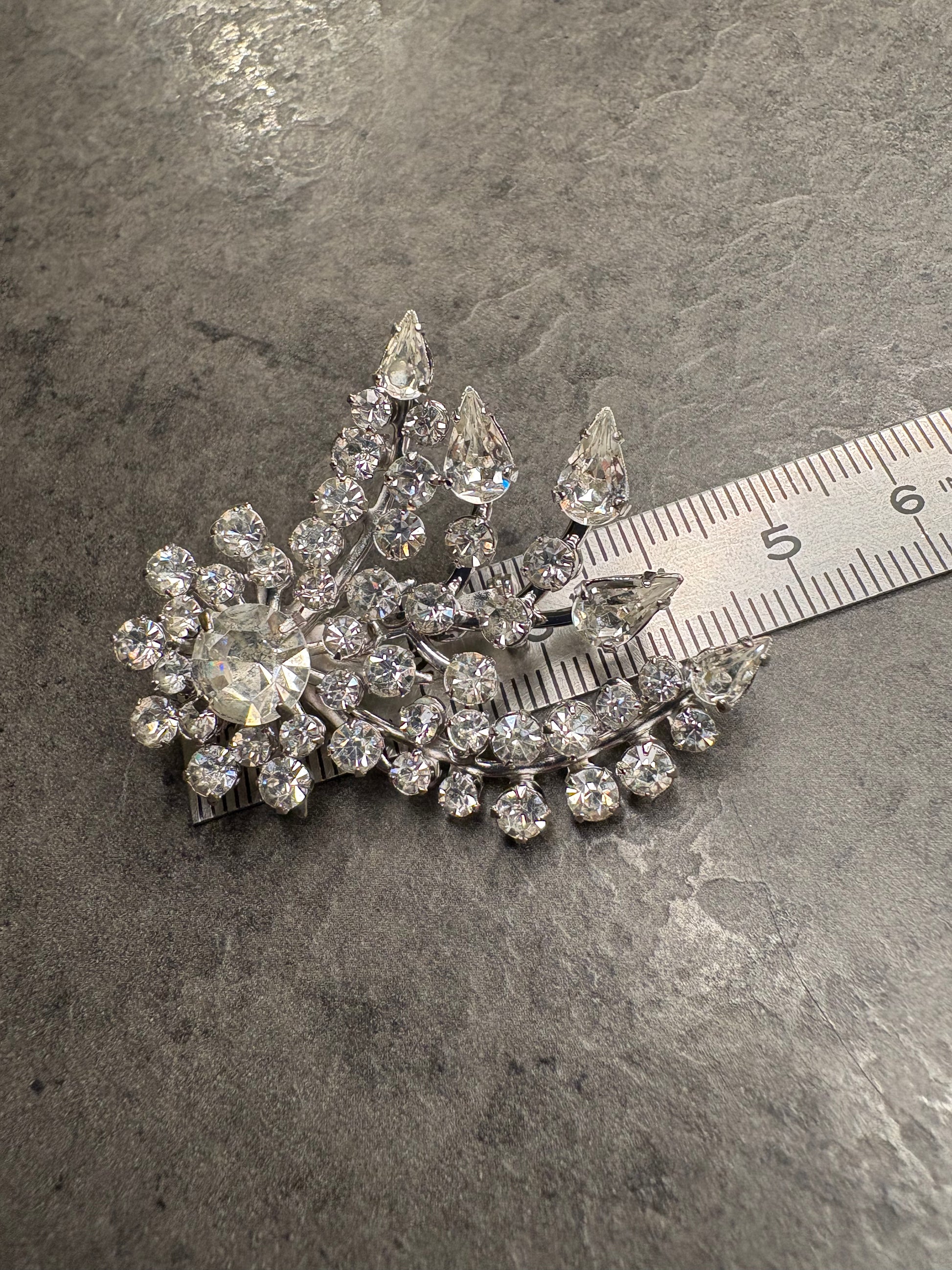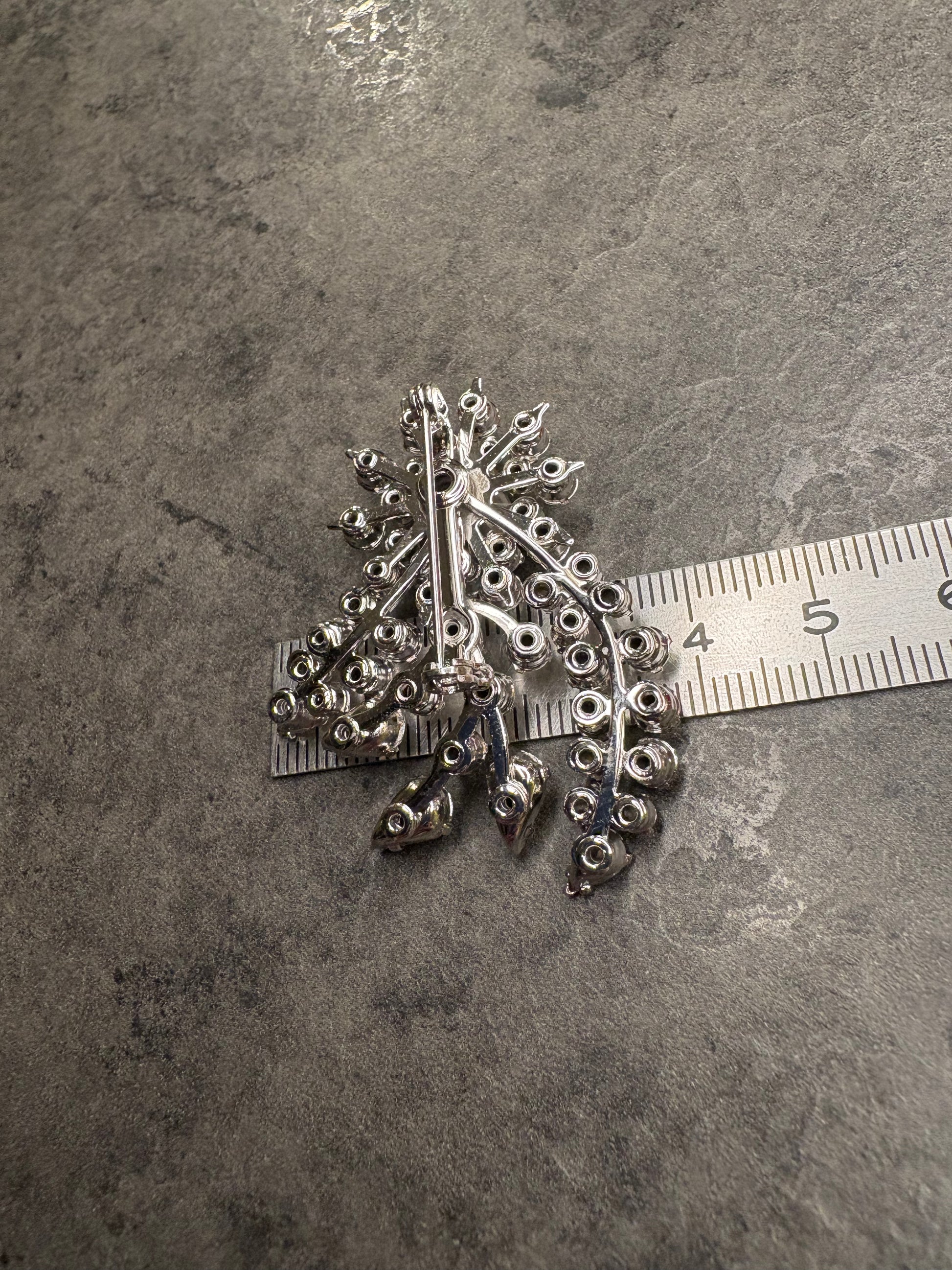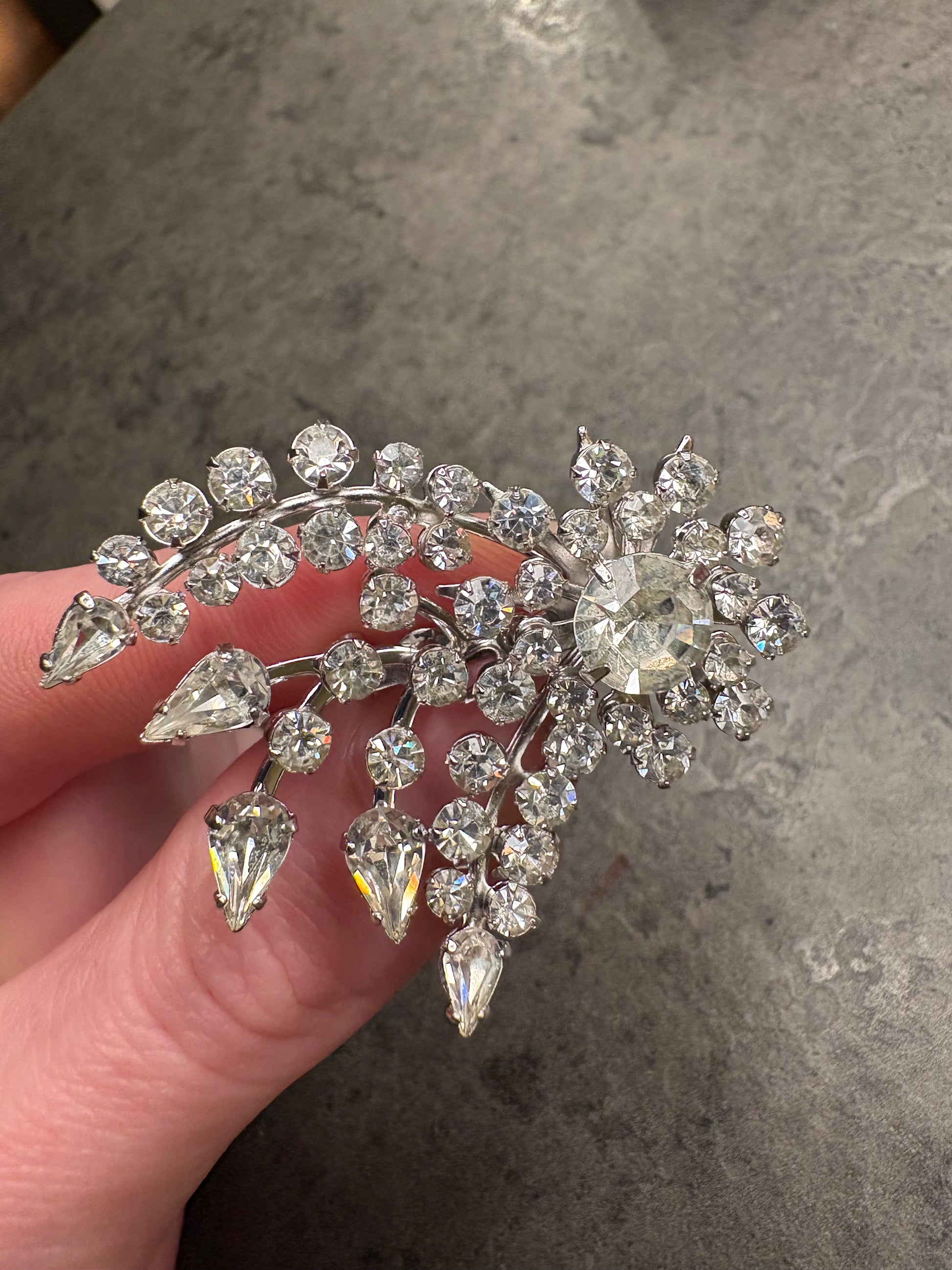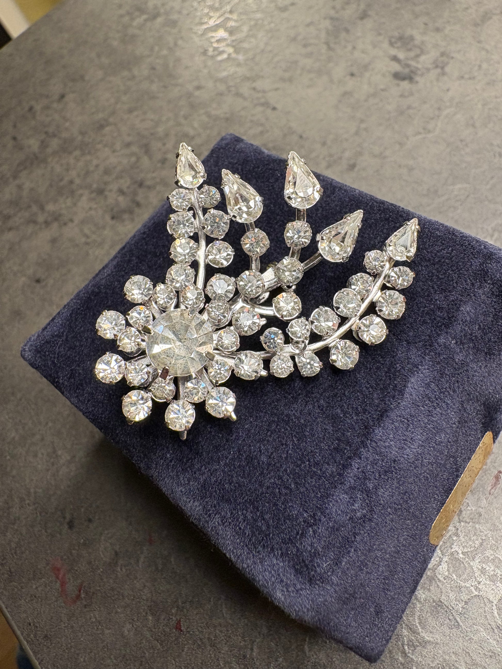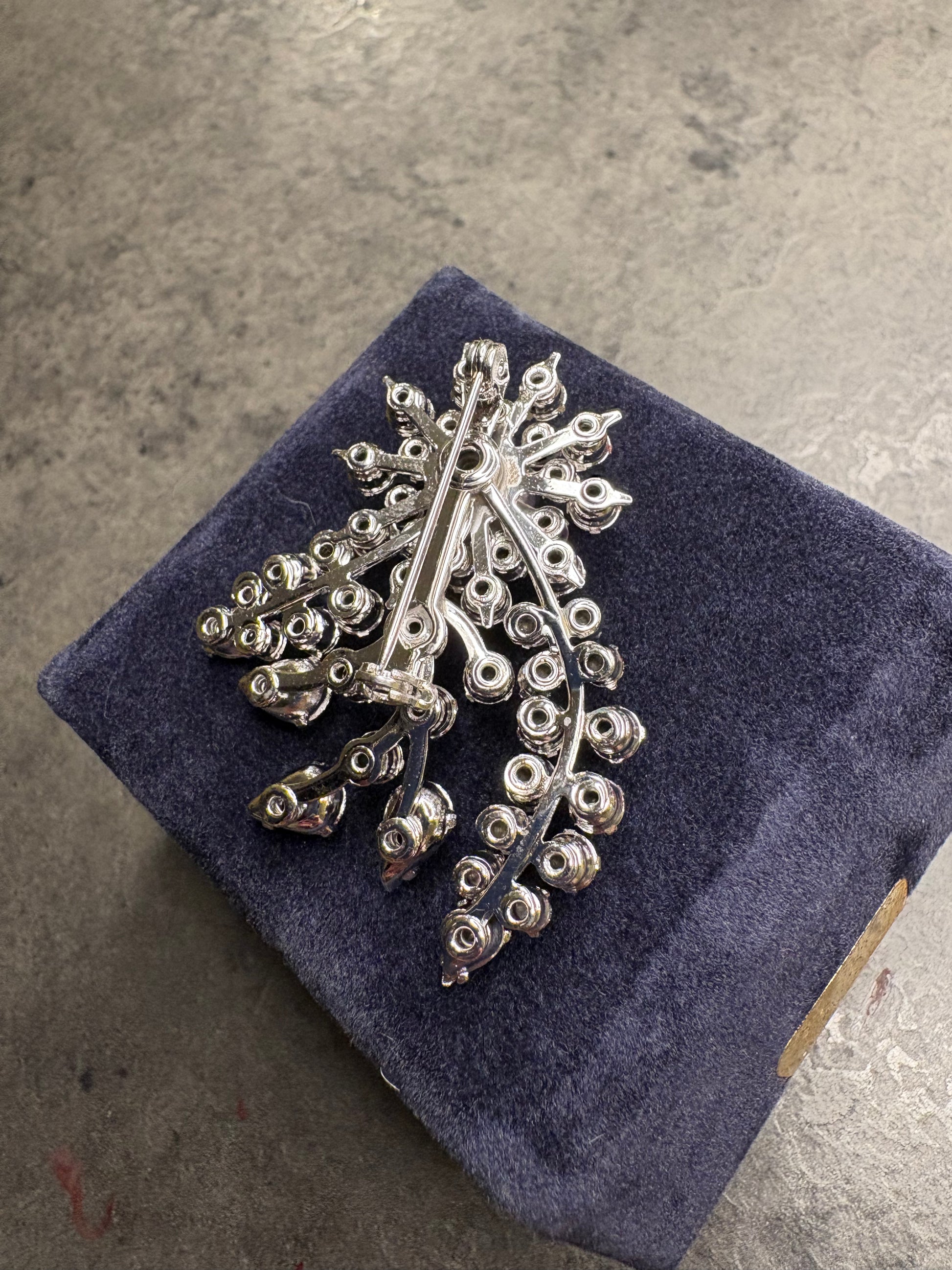 Questa splendida spilla vintage degli anni ’60 è un vero gioiello d’epoca, pensato per catturare la luce e trasformarla in eleganza assoluta. Realizzata in metallo argentato lucido, presenta una composizione ricca e scenografica di strass trasparenti, tutti montati con estrema cura in castoni aperti che permettono alla luce di attraversarli e brillare da ogni angolazione.