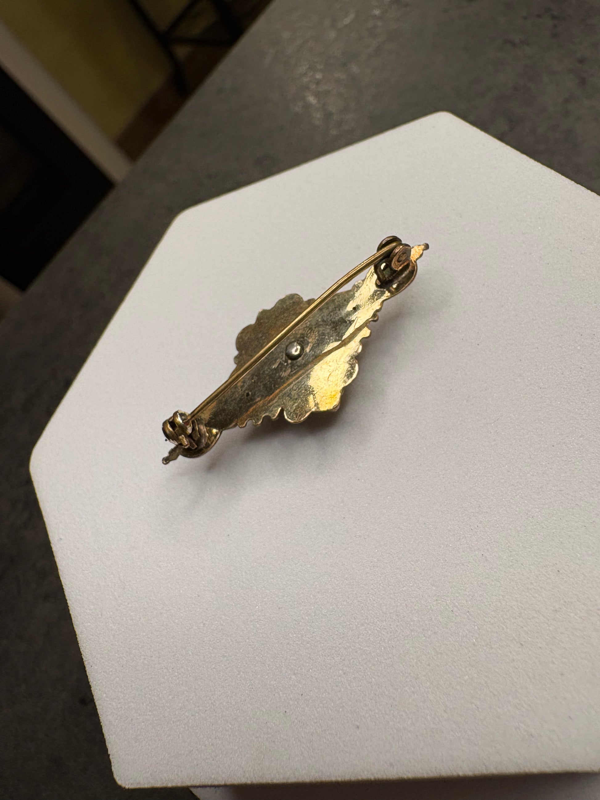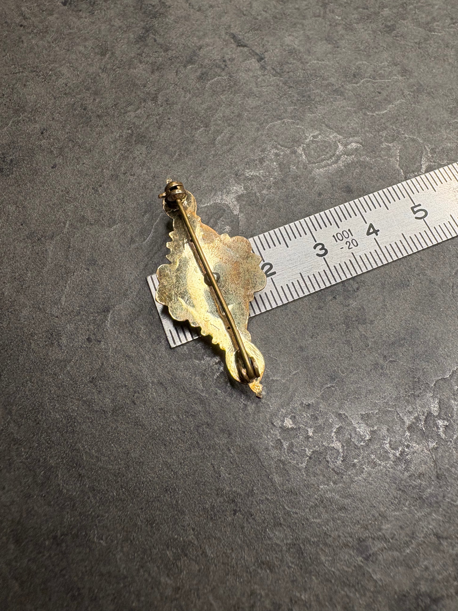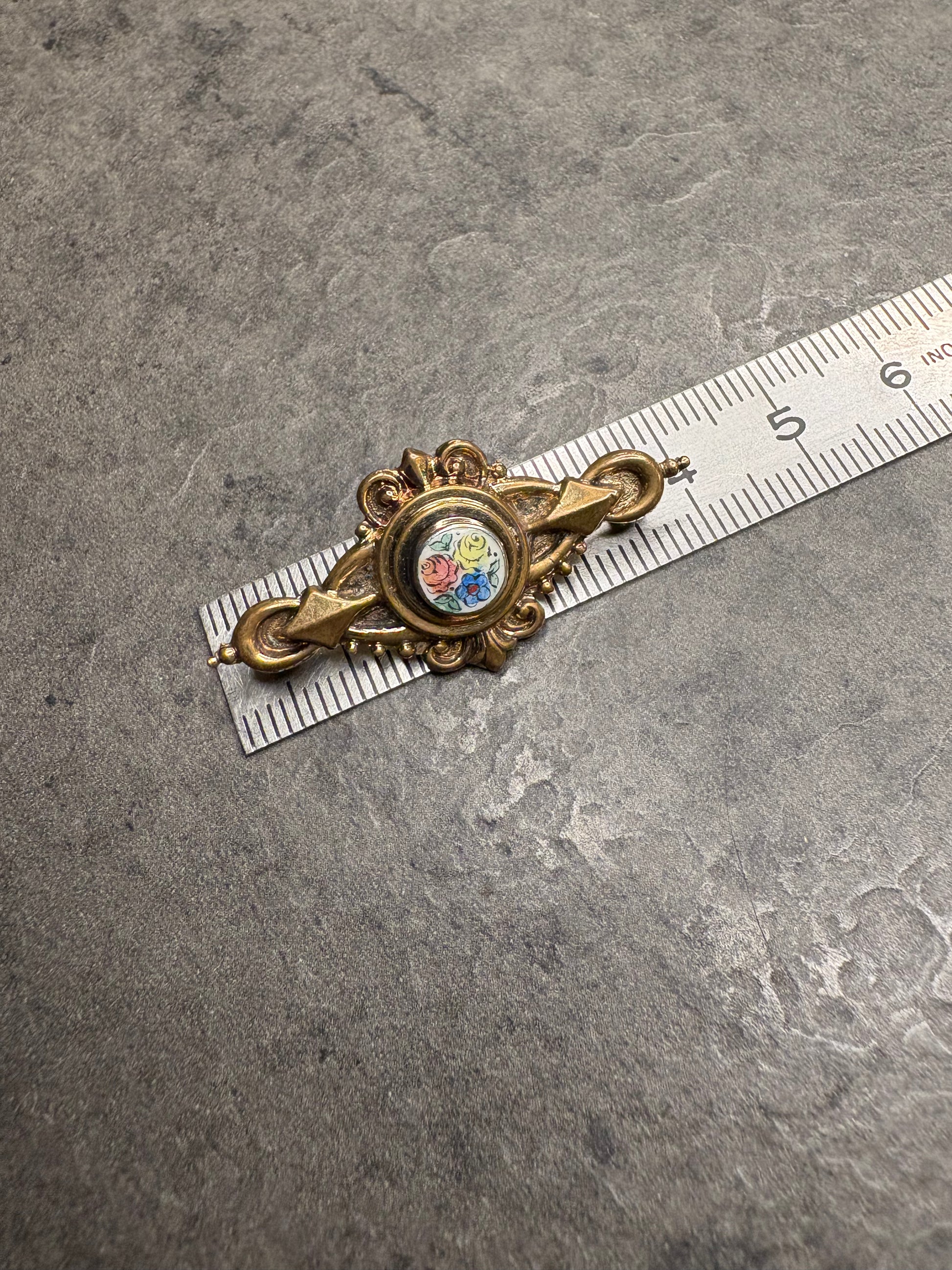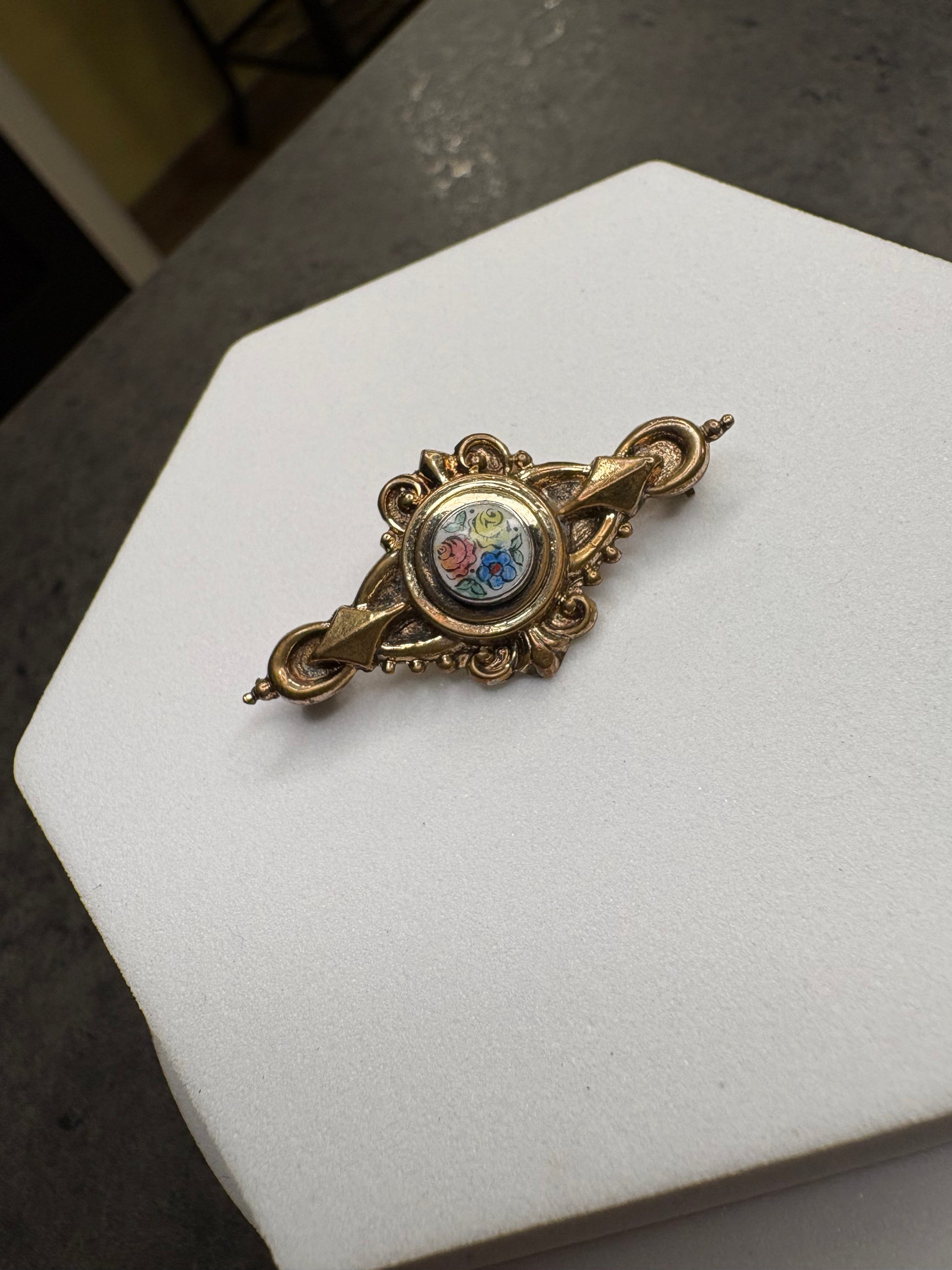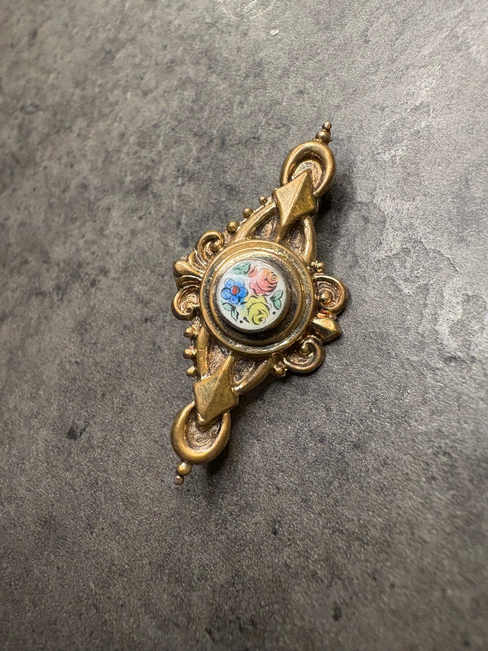 Questa spilla colpisce per il suo gusto ottocentesco e romantico. La struttura in metallo dorato è finemente lavorata con motivi ornamentali e volute, creando una cornice elaborata e preziosa. Al centro è inserita una miniatura dipinta a mano, raffigurante un delicato bouquet di fiori dai toni pastello, protetta da una cupola trasparente. È un gioiello dal forte sapore sentimentale, tipico delle spille antiche da dono o da ricordo, elegante e ricercato.
