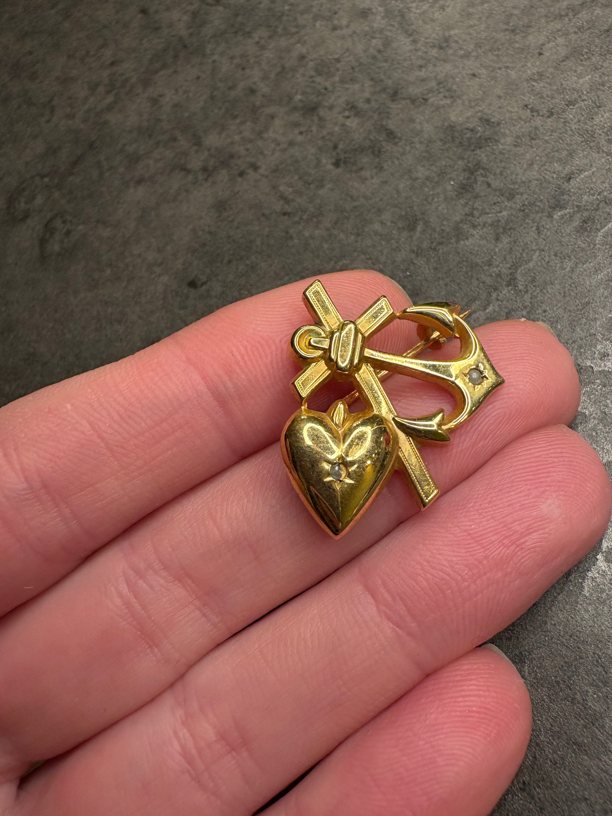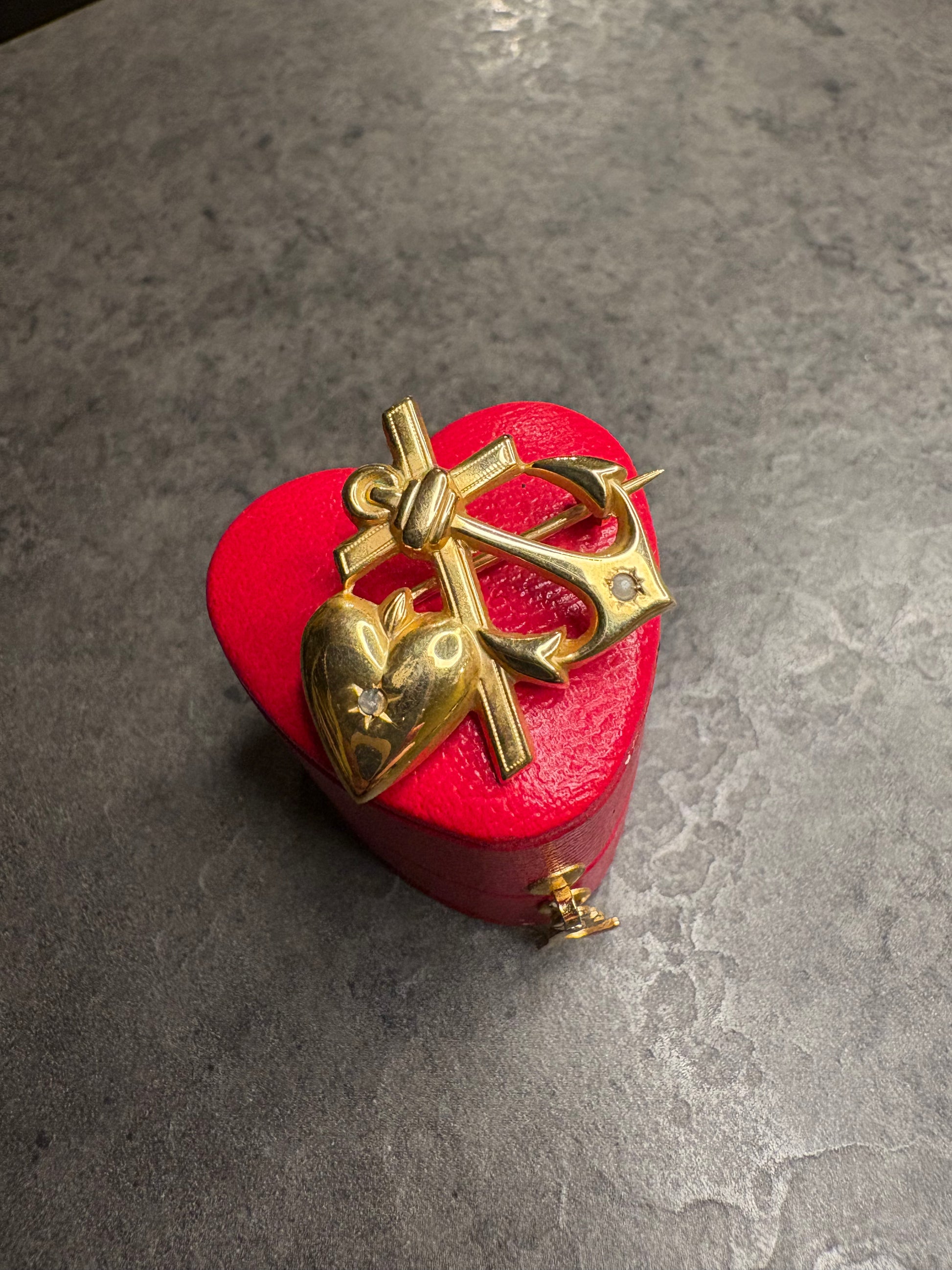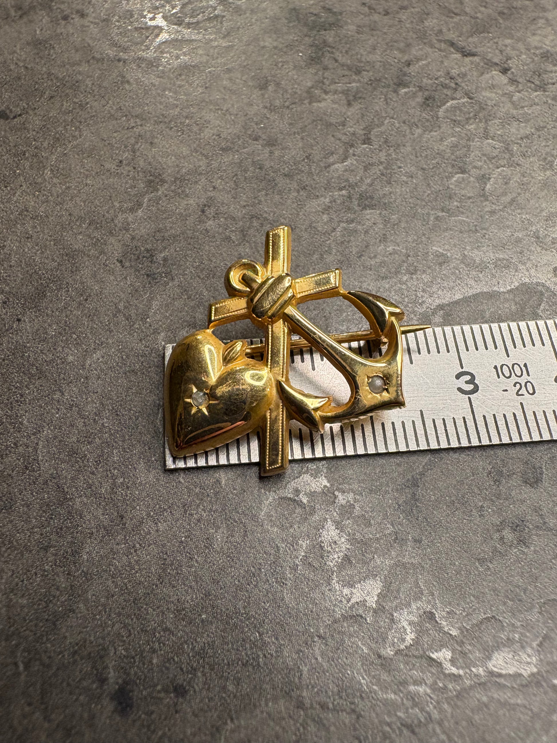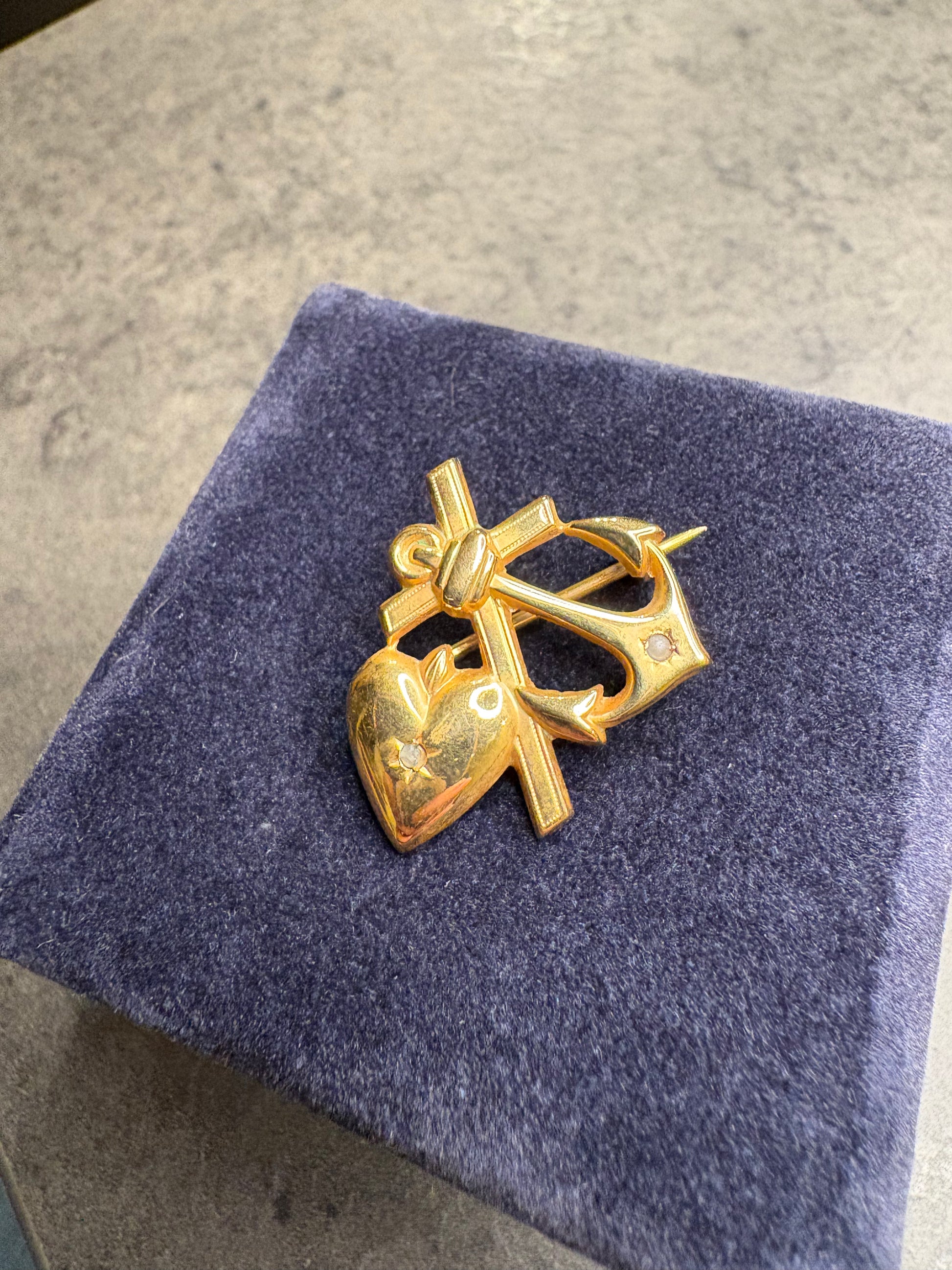 La croce, finemente modellata, rappresenta la Fede; l’ancora, sinuosa e armoniosa, raffigura la Speranza; e il cuore, bombato e lucente, incarna la Carità. L’insieme è compatto, equilibrato e sorprendentemente raffinato, nonostante le dimensioni ridotte. Il retro porta chiaramente il marchio AD – sigla storica dell’atelier Andreas Daub – garanzia di manifattura d’epoca eseguita con tecniche di alta oreficeria.