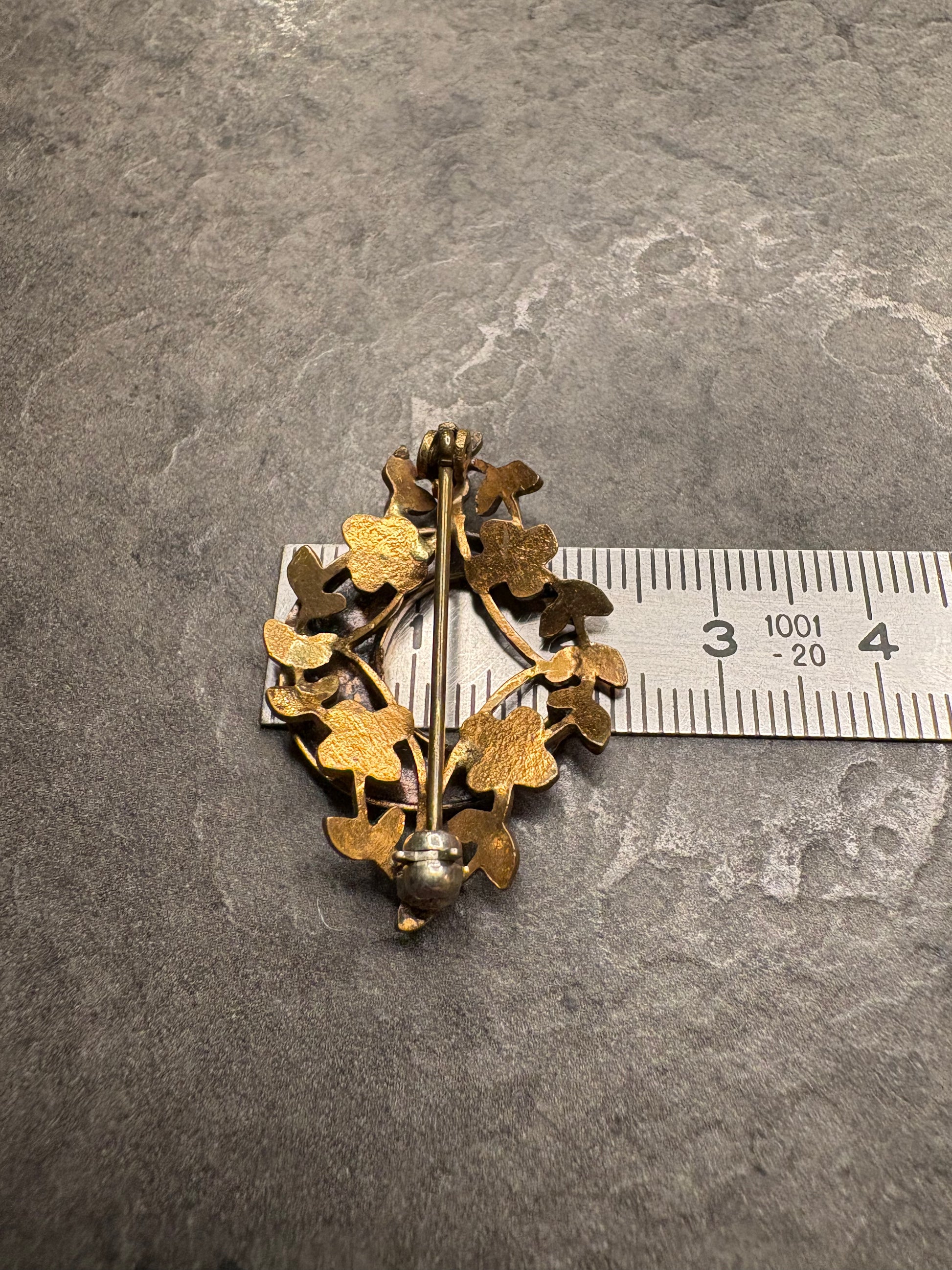 Il retro della spilla mostra un meccanismo di chiusura che e stata sostituita da”C” a chiusura più solida. La patina e i segni del tempo visibili sul metallo confermano il suo carattere d’epoca, rendendola una creazione affascinante per collezionisti e appassionati di gioielli antichi.