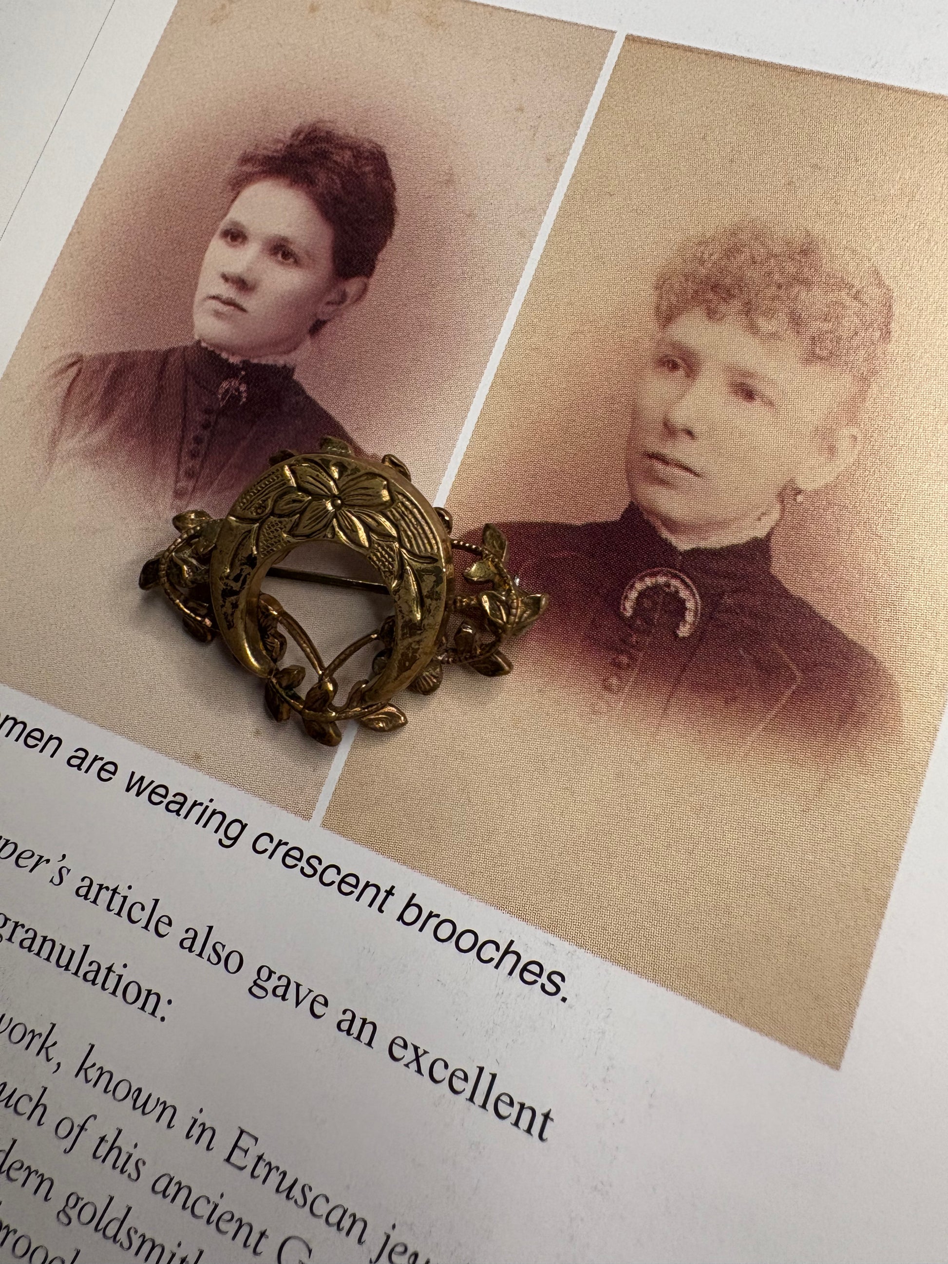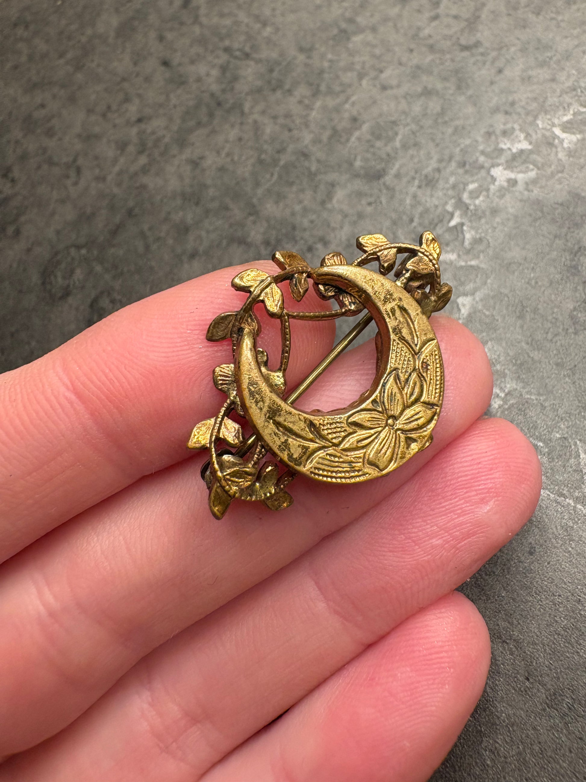 Questa affascinante spilla antica a forma di luna crescente è un pezzo distintivo dello stile vittoriano, risalente alla fine dell’Ottocento o ai primi del Novecento. Realizzata in metallo dorato o vermeil, la spilla presenta un design elegante tipico della gioielleria sentimentale di quel periodo. Il motivo della luna crescente era particolarmente popolare nell’epoca vittoriana e simboleggiava la crescita, la protezione e la femminilità.