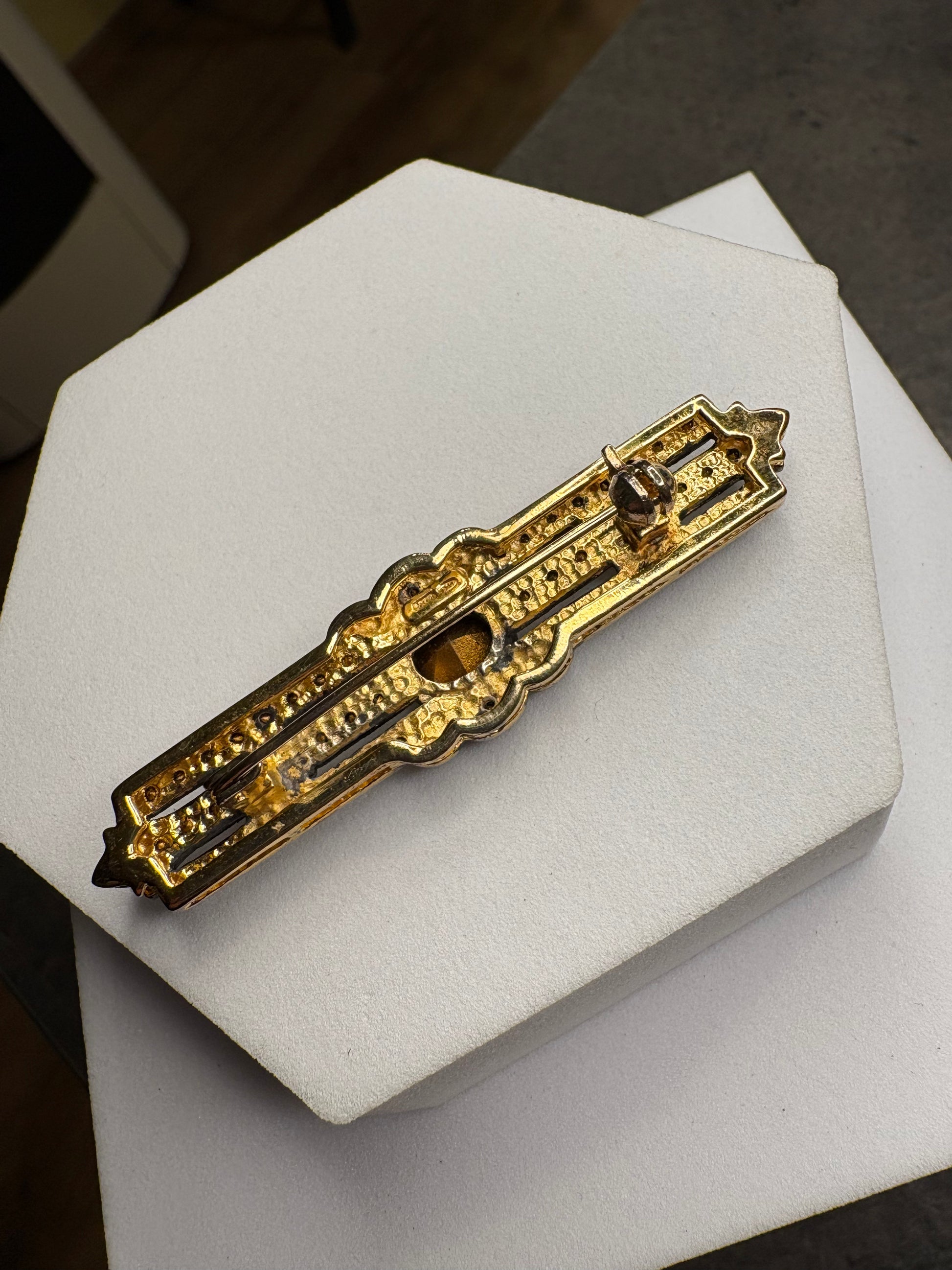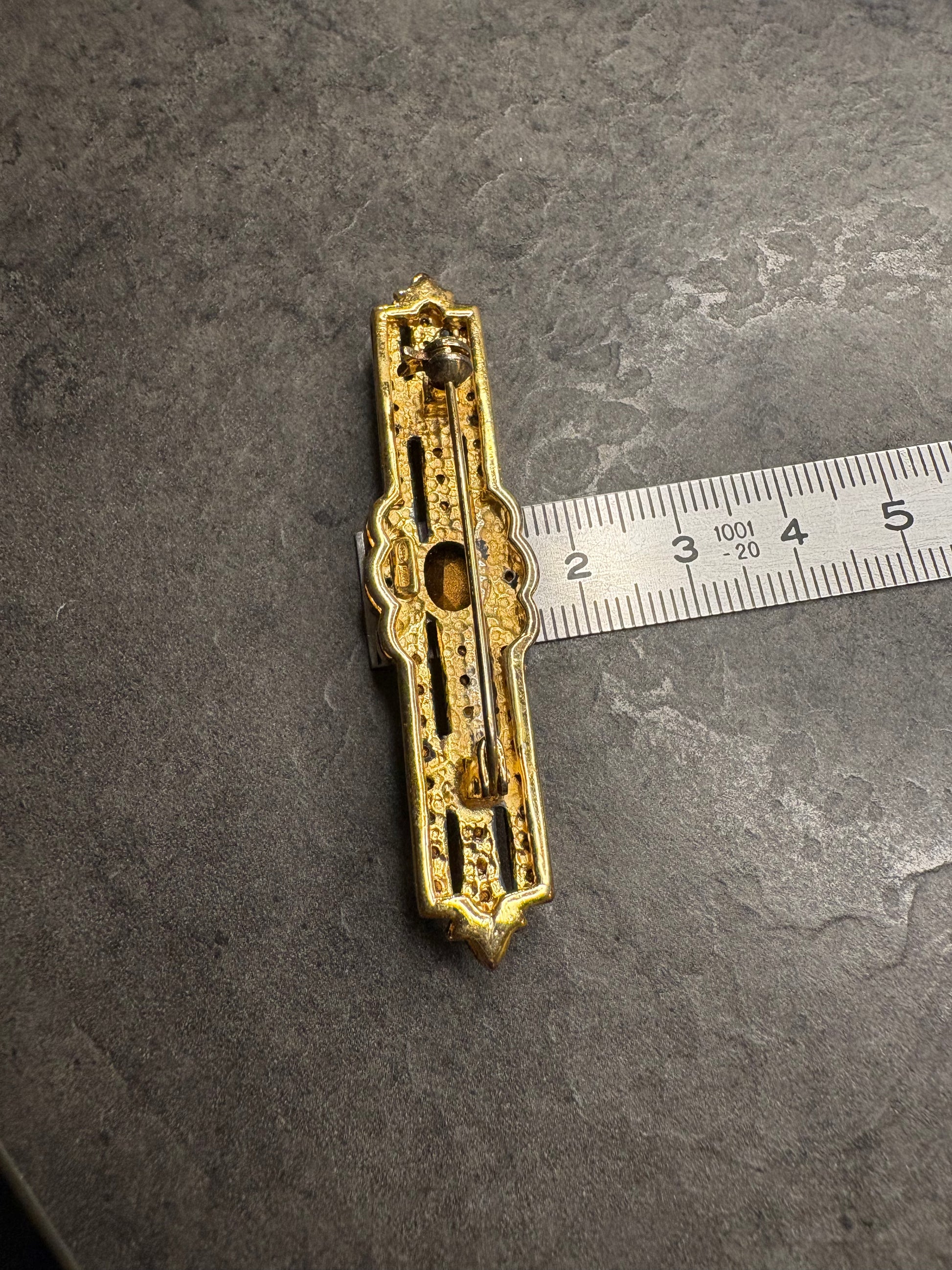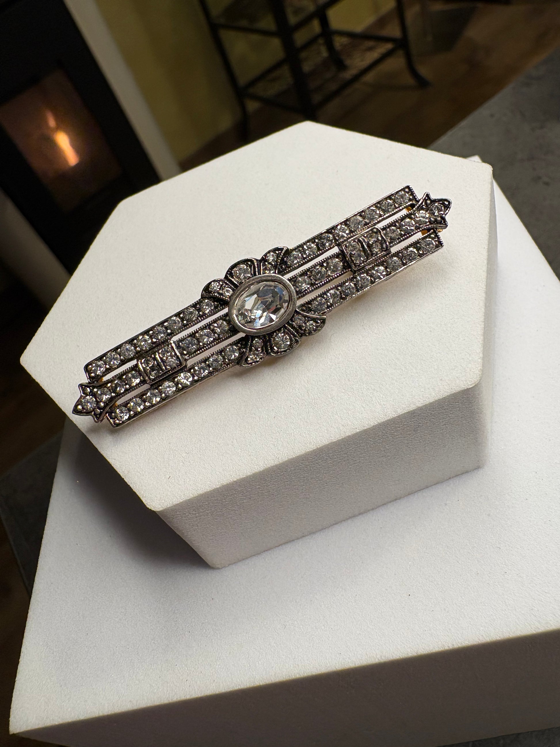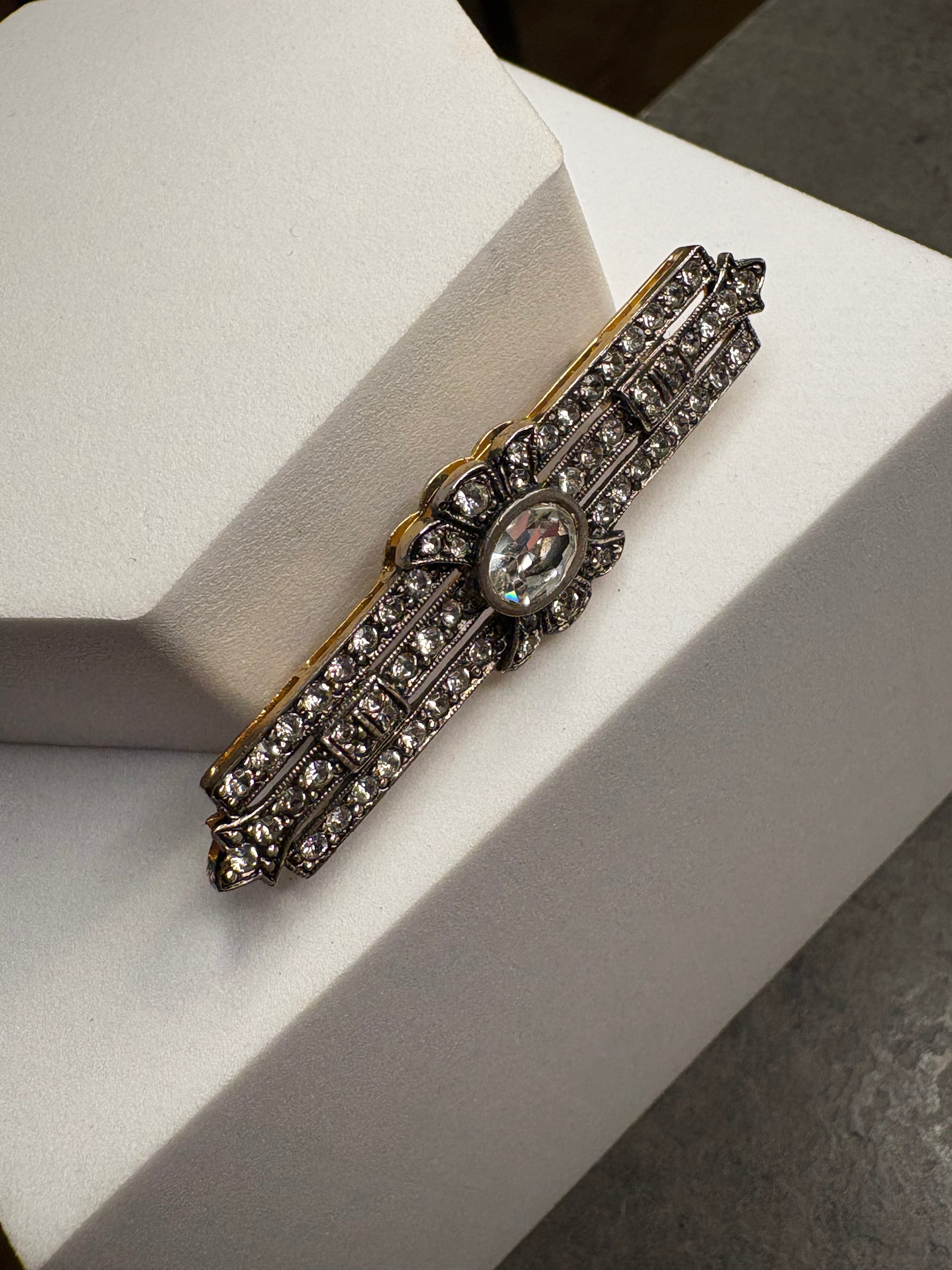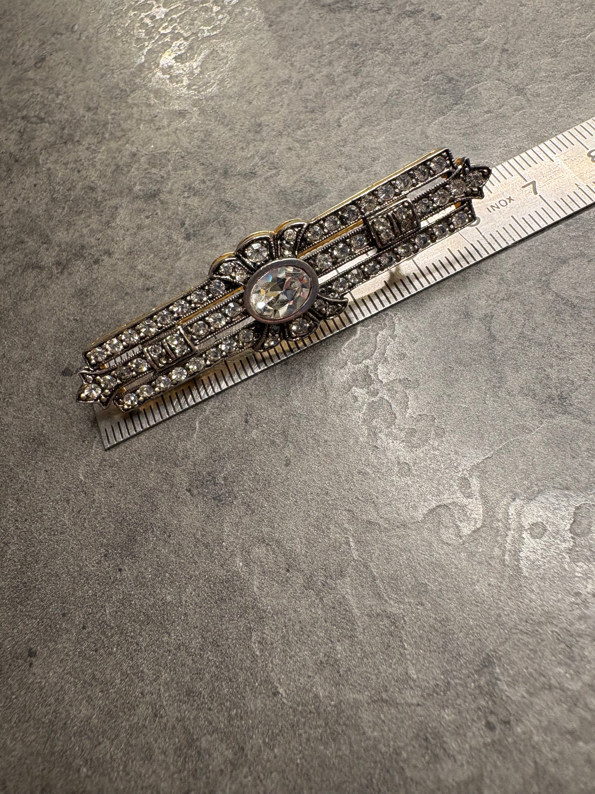 Raffinata spilla in argento 925 con doppia finitura dorata e argentata, interamente ricoperta di cristalli trasparenti. Il design geometrico ed equilibrato richiama lo stile Art Déco, con una composizione armoniosa e simmetrica. I cristalli, incastonati con precisione, creano un effetto luminoso e prezioso, rendendo questa spilla estremamente elegante e adatta anche a occasioni importanti.