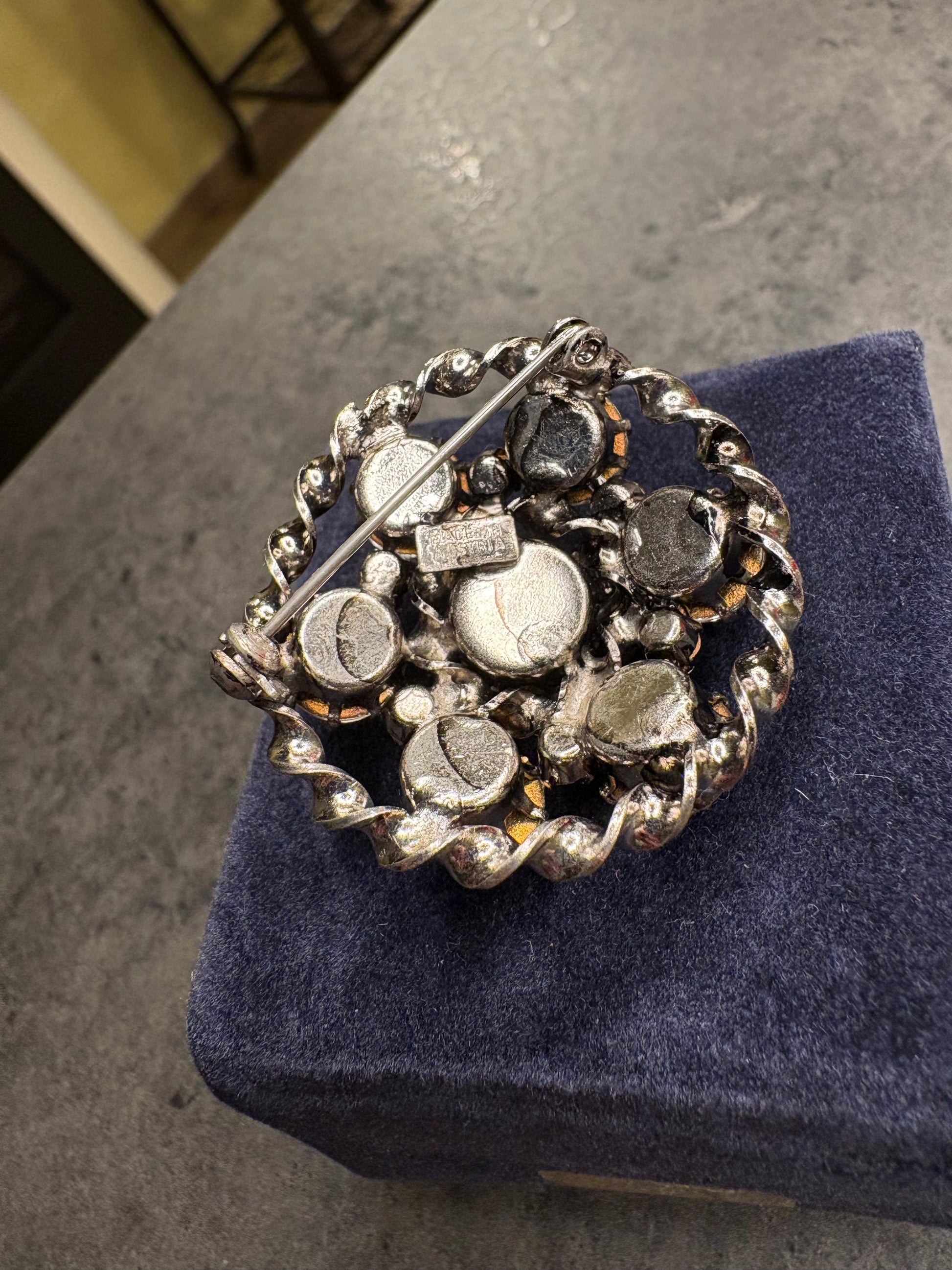 La spilla ha una forma rotonda, compatta e molto scenografica, tipica dei gioielli vintage austriaci della metà del Novecento. La struttura è realizzata in metallo argentato, modellato in un motivo circolare intrecciato che crea una cornice decorativa attorno al centro. L’effetto è quello di un piccolo ricamo metallico, leggermente ritorto, che aggiunge profondità e valore visivo al pezzo.