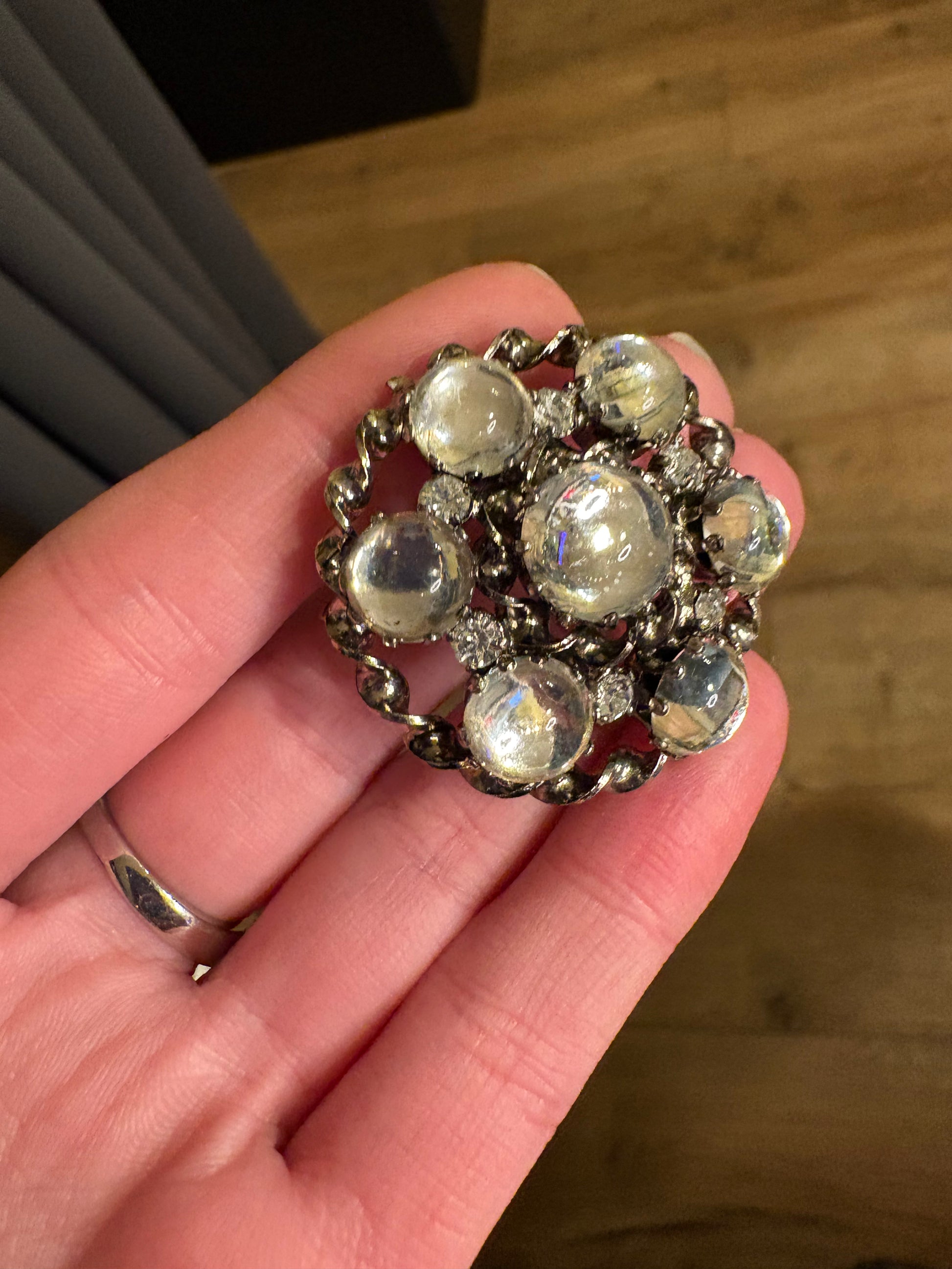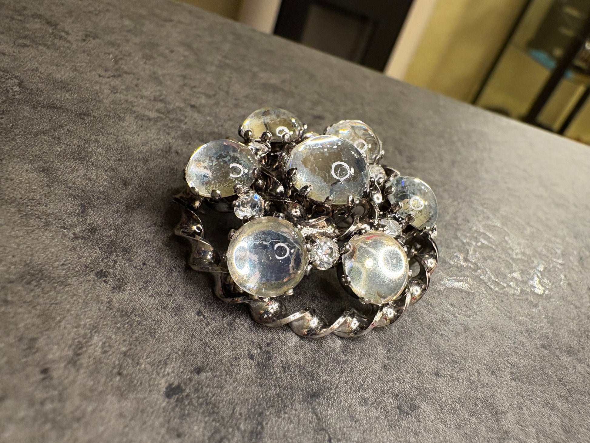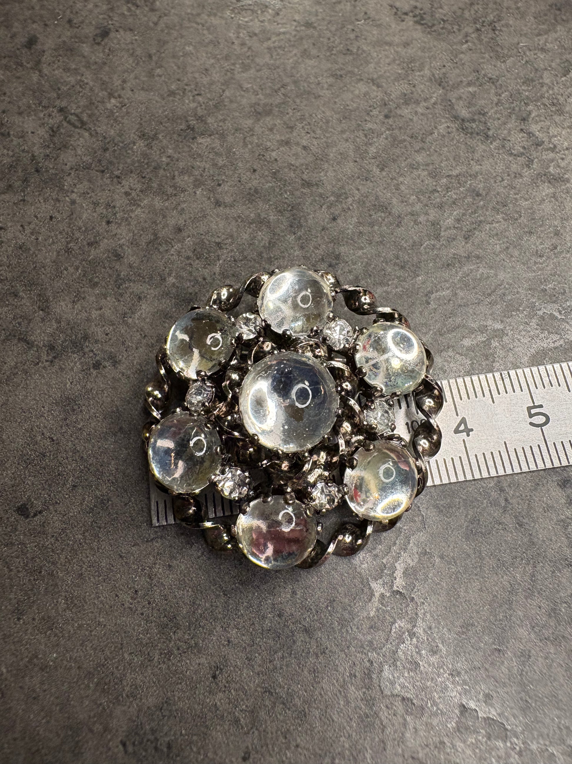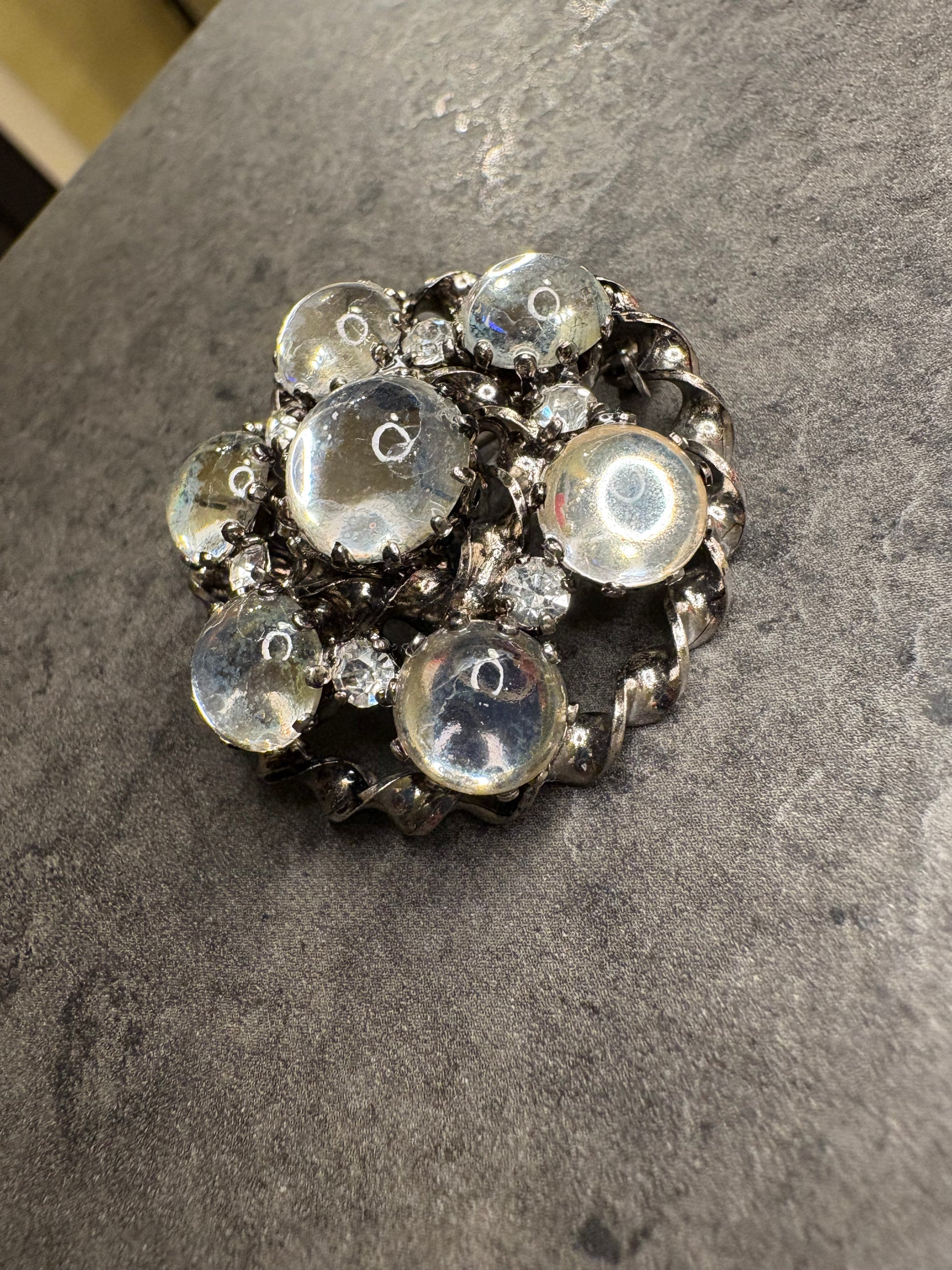 Il contrasto tra i cristalli lisci e bombati e le pietre sfaccettate crea un gioco di luci molto particolare: da un lato riflessi morbidi e lucidi, dall’altro scintillii vivi e più intensi. È proprio questa combinazione che rende riconoscibili molte spille austriache degli anni ’50–’60, spesso realizzate con i celebri cristalli prodotti nel Paese.