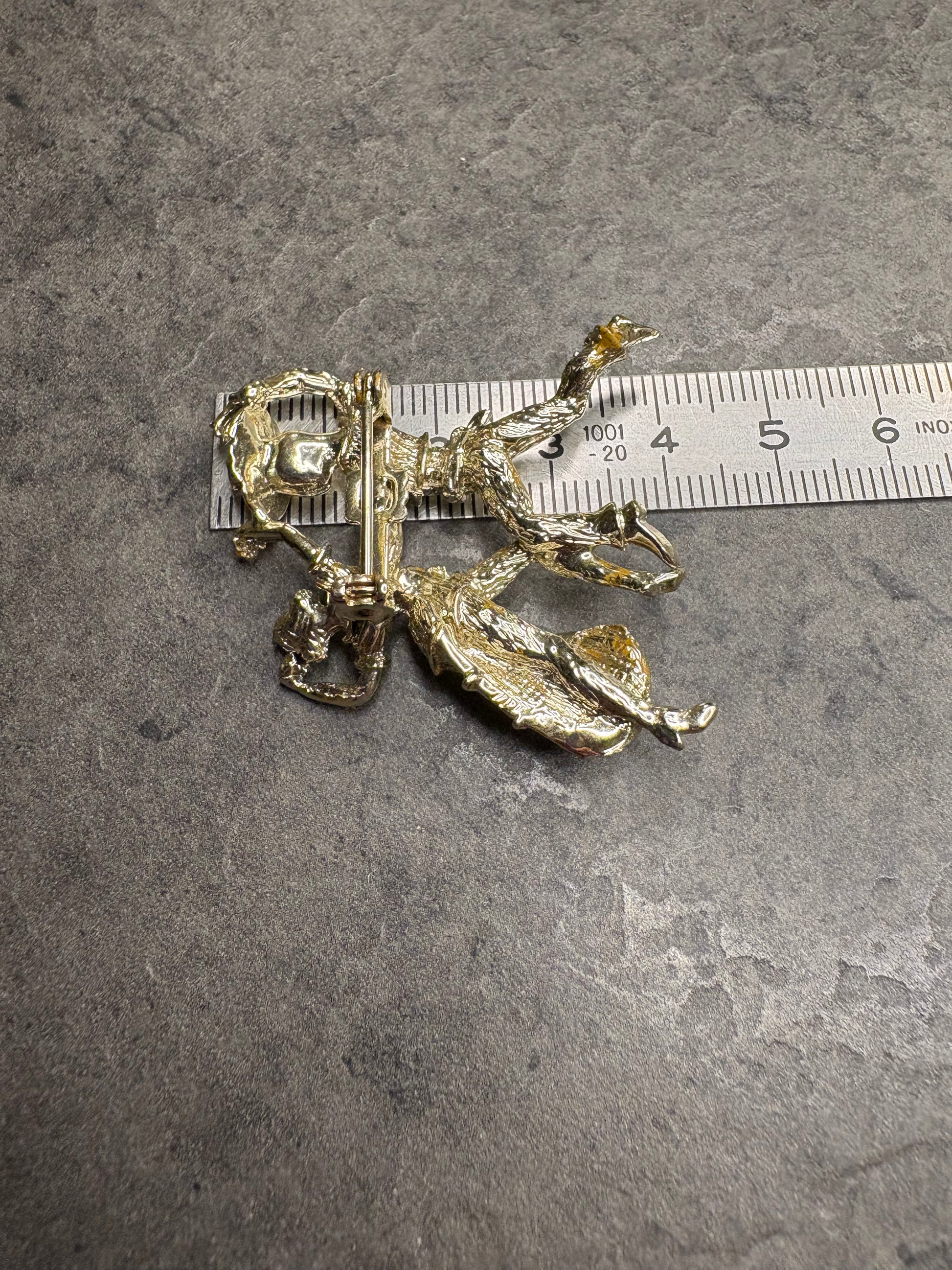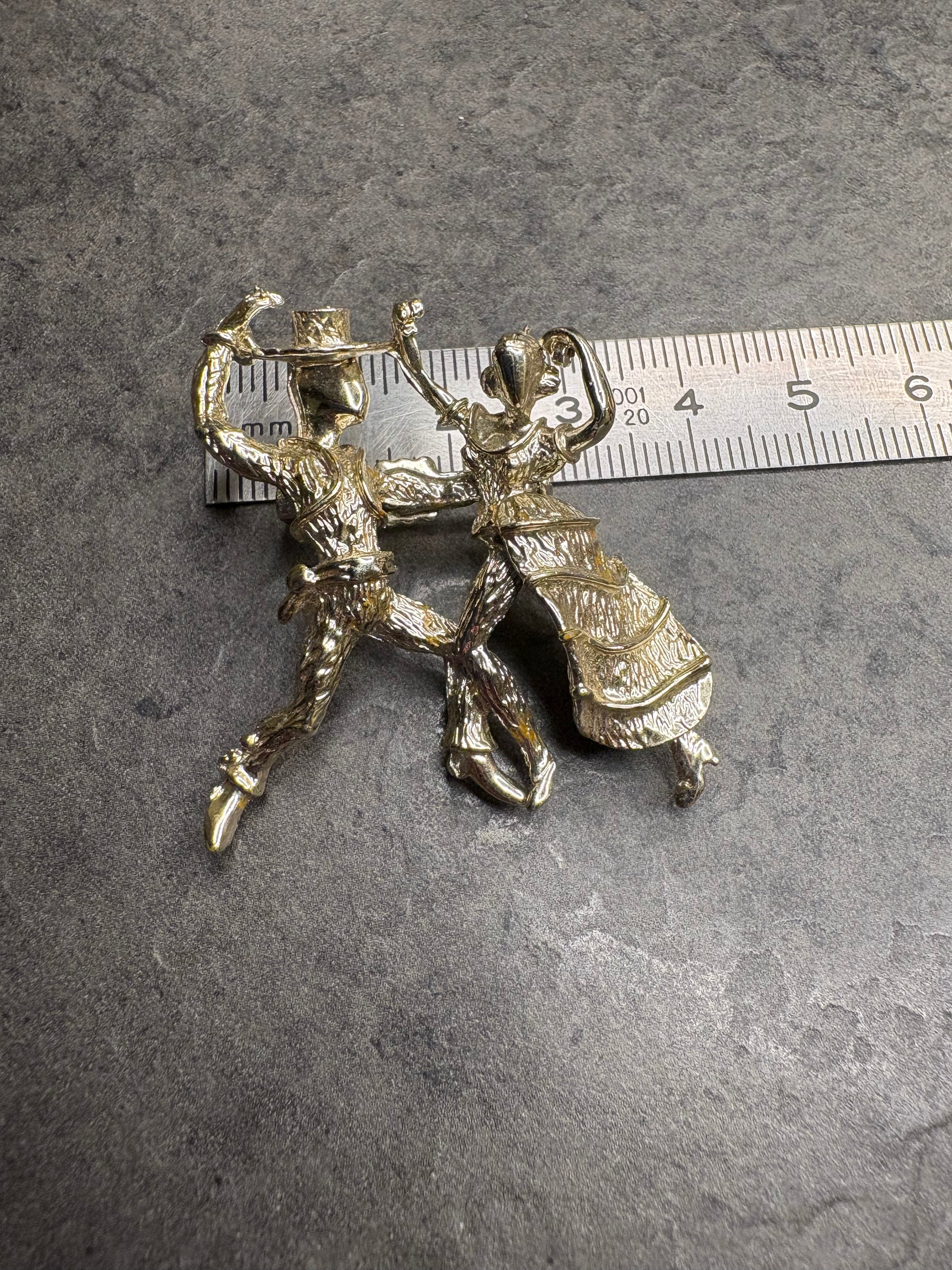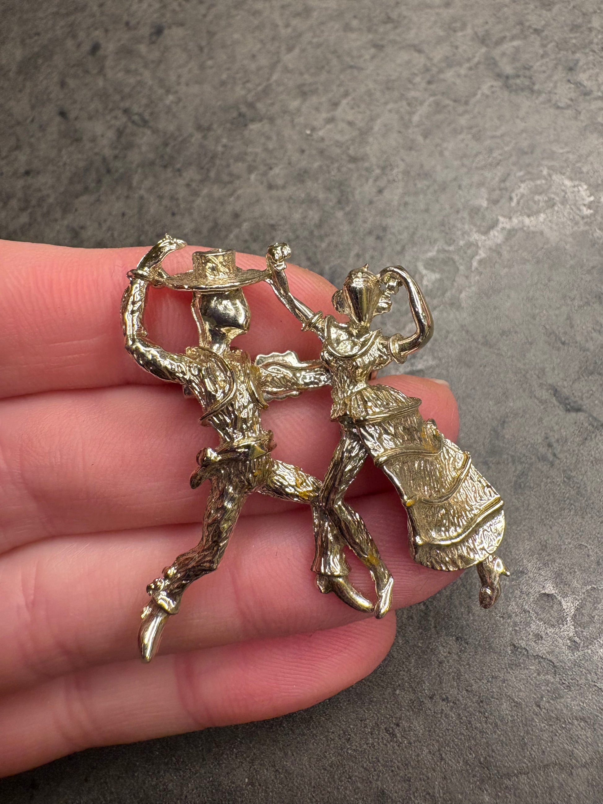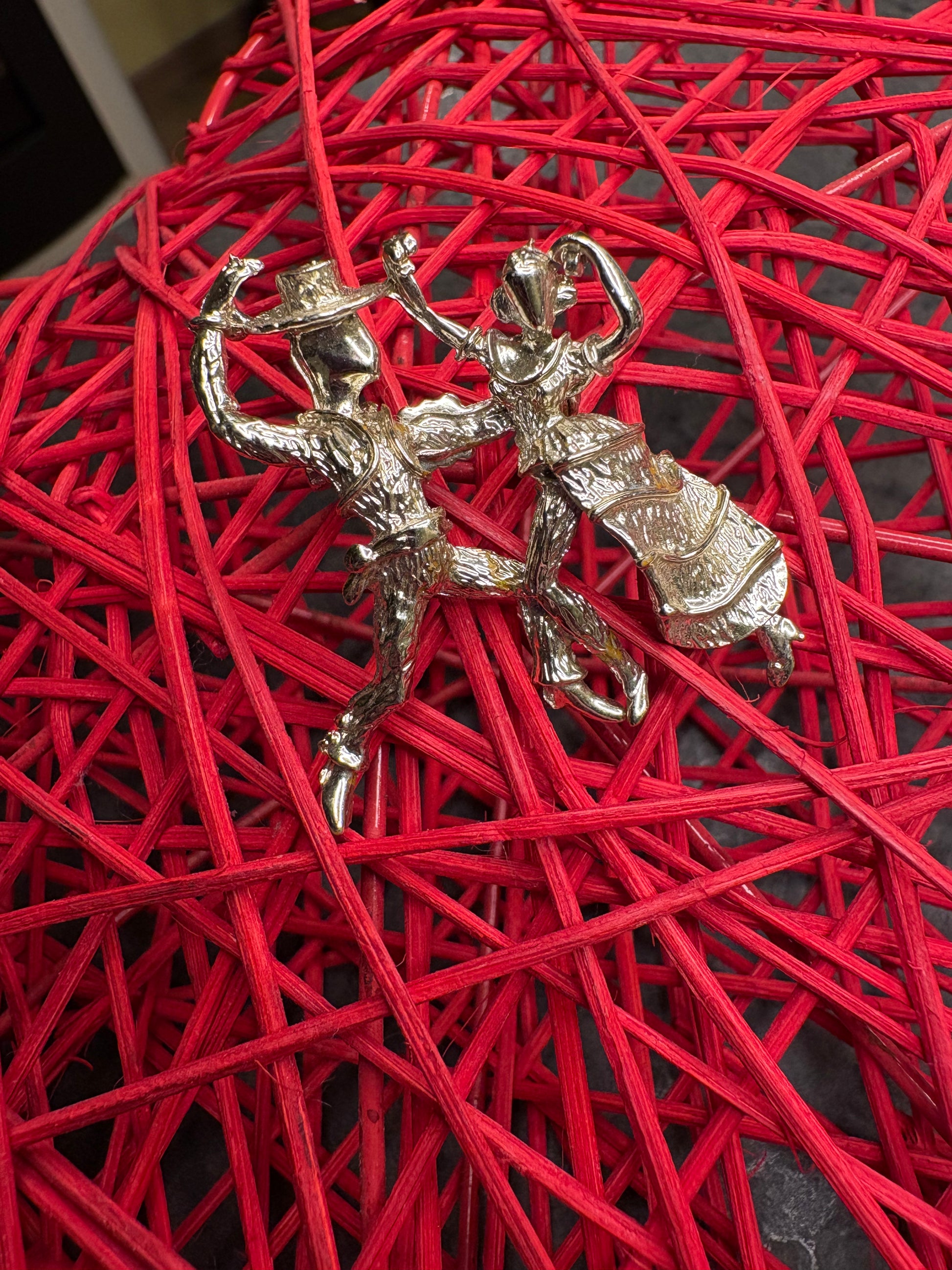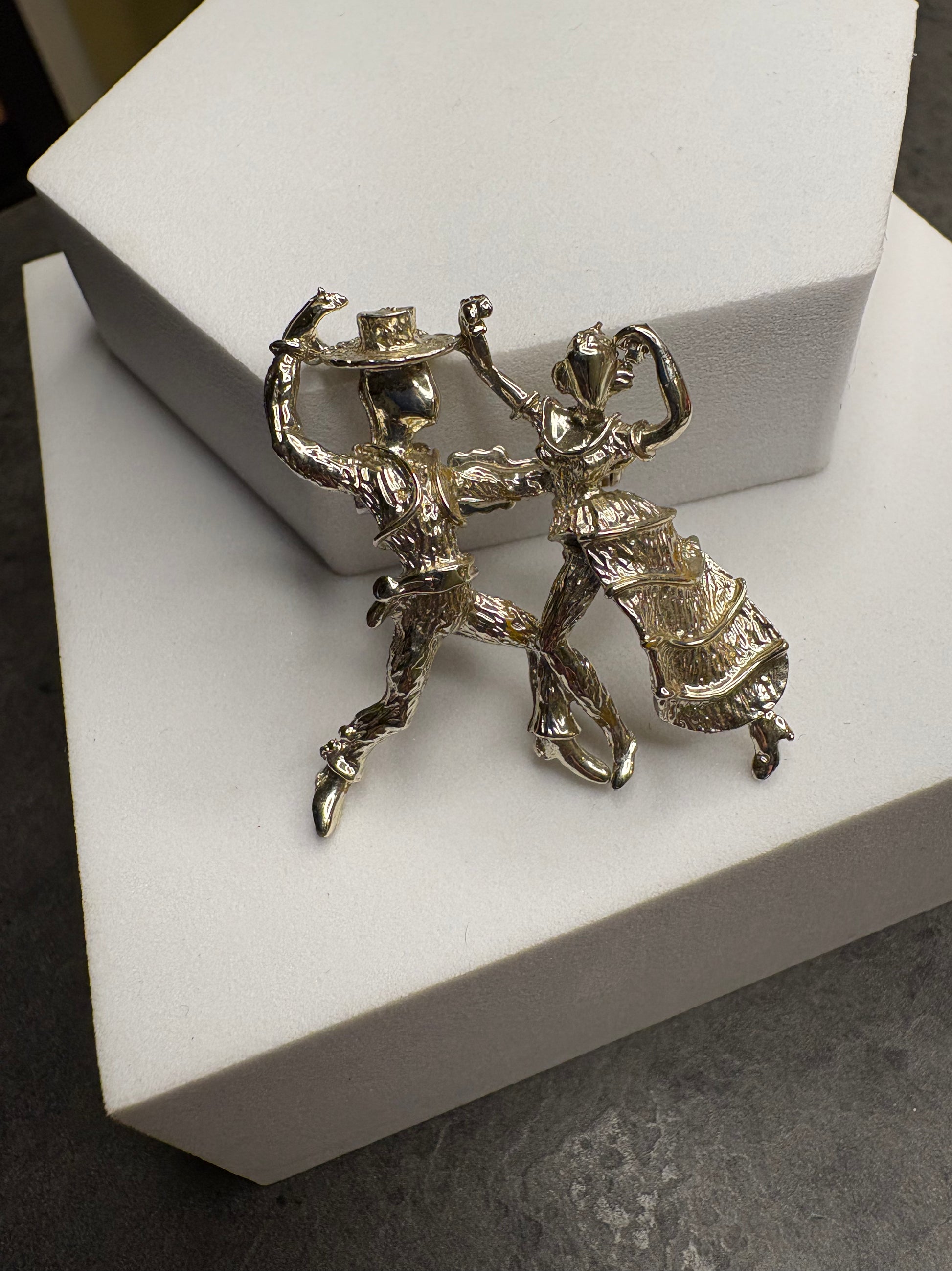 Questa magnifica spilla in metallo color oro chiaro, è un’affascinante rappresentazione figurativa di una coppia che balla, realizzata con grande cura nei dettagli e con un gusto spiccatamente narrativo. Le due figure sono colte in un momento di movimento, con i corpi slanciati e le pose dinamiche che suggeriscono eleganza, ritmo e complicità. La lavorazione del metallo presenta superfici mosse e finemente texturizzate, che riflettono la luce e danno profondità alla scena. L’insieme ha un sapore quasi scultoreo e ricorda molto lo stile decorativo degli anni ’50, quando le spille figurative erano molto apprezzate per il loro carattere originale e romantico. È un gioiello che non è solo un ornamento, ma anche un piccolo racconto da indossare.