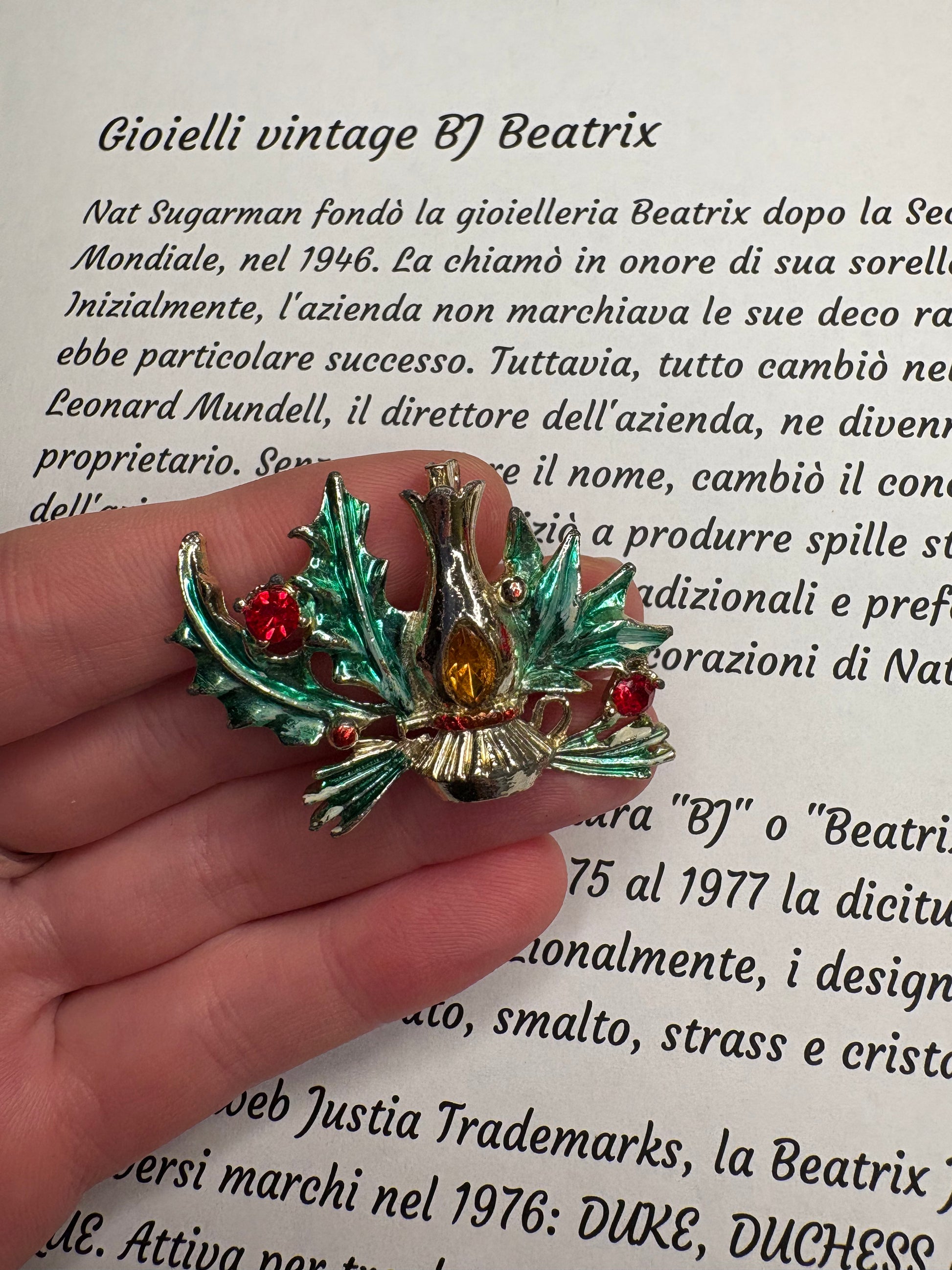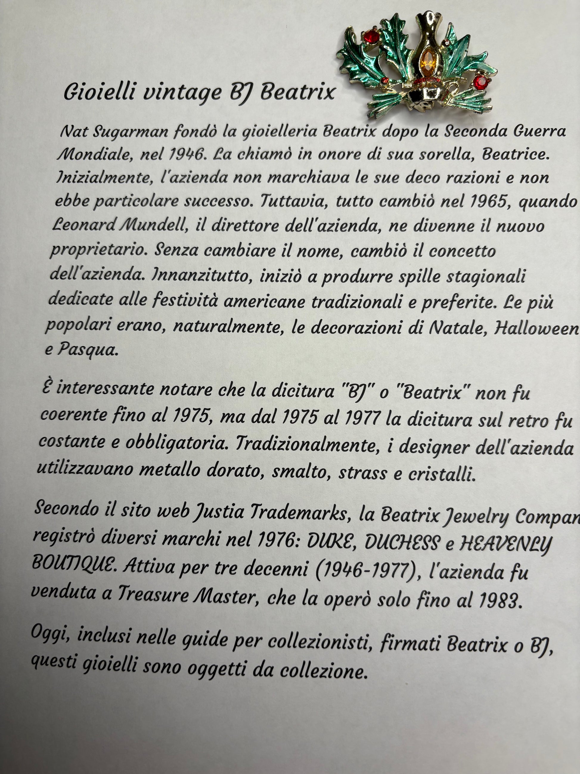 Come tipico delle creazioni Beatrix Jewelry degli anni ’60-’70, la spilla unisce eleganza e spirito festivo, con una lavorazione accurata e vivace resa cromatica. Firmata sul retro “BJ”, rappresenta uno dei raffinati bijoux prodotti durante il periodo di massimo splendore del marchio, quando l’azienda era celebre per le sue spille stagionali dedicate alle festività.Un gioiello da collezione che racchiude tutta la magia e la nostalgia del Natale vintage, perfetto per impreziosire un outfit o arricchire una collezione tematica d’epoca.
