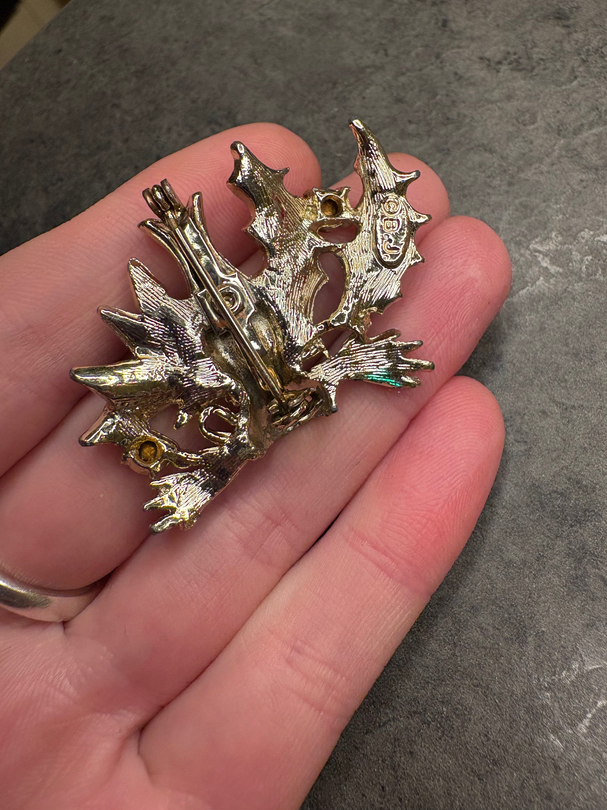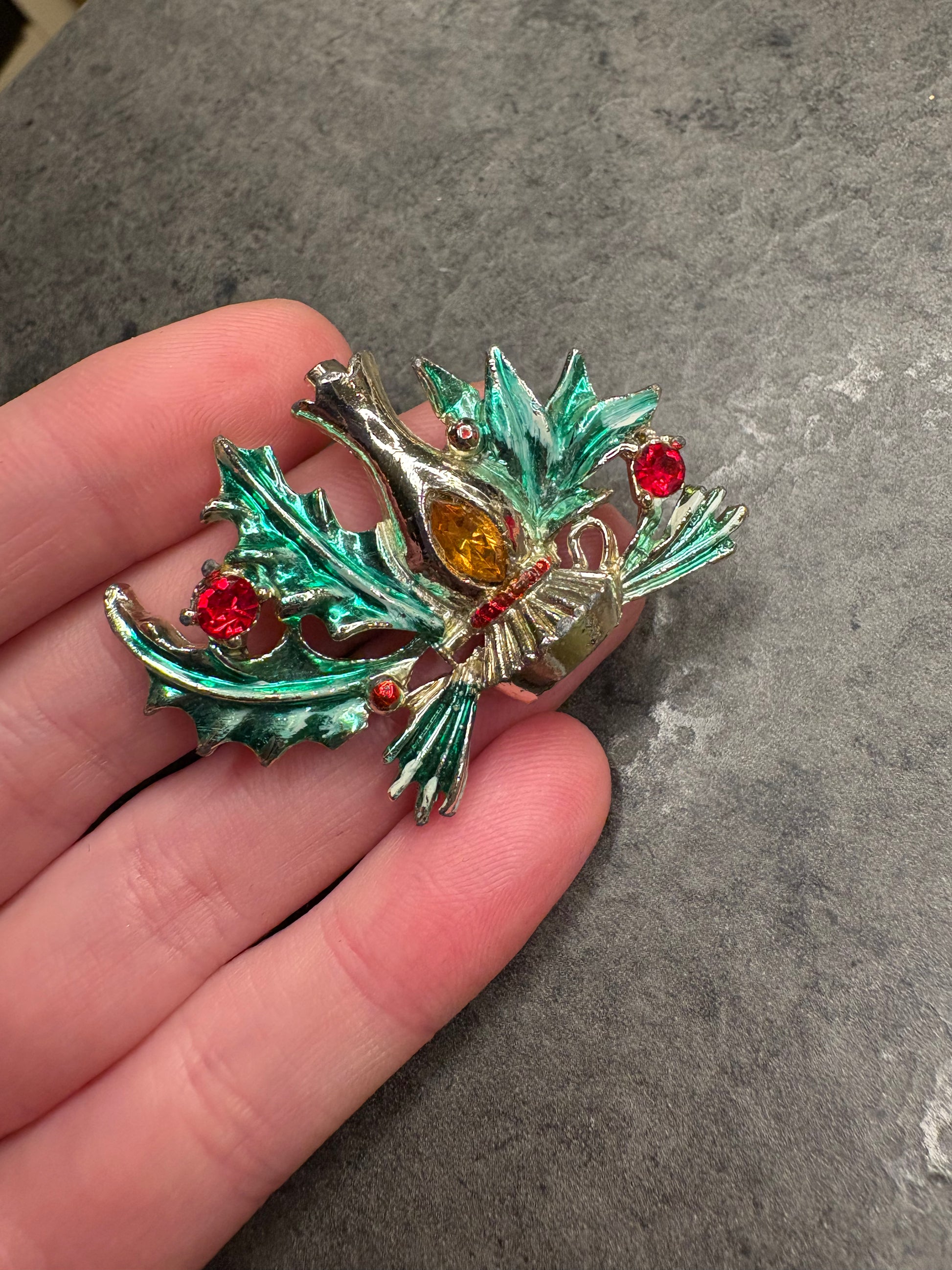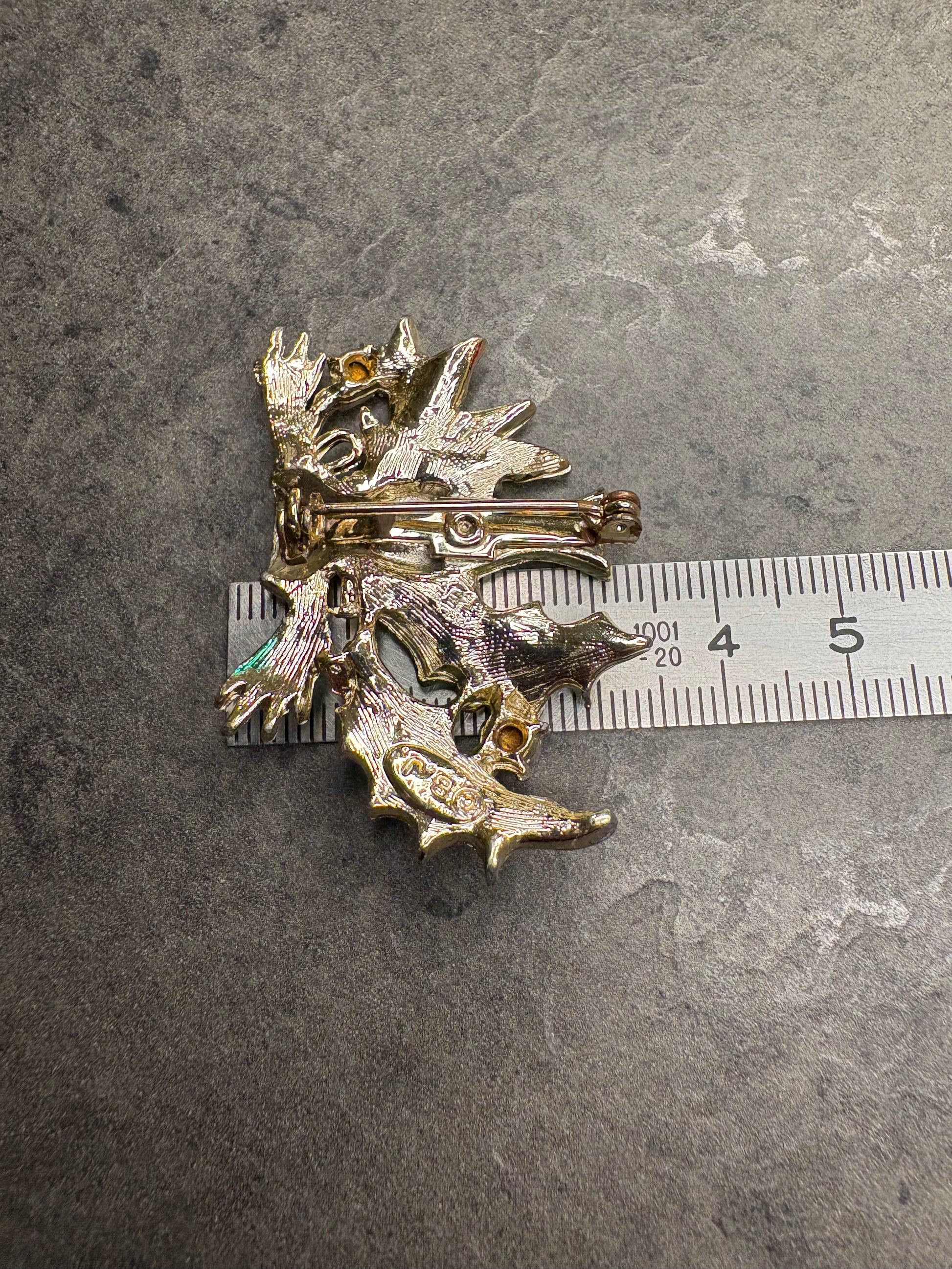 Meravigliosa spilla natalizia vintage firmata BJ Beatrix, un autentico piccolo capolavoro di gioielleria d’epoca americana. Realizzata in metallo dorato chiaro con smalti verdi brillanti e dettagli rossi e ambra, raffigura un ramo di agrifoglio con bacche e foglie lucenti, simbolo classico delle festività natalizie. Al centro spicca una pietra ovale color topazio che aggiunge calore e luminosità alla composizione.