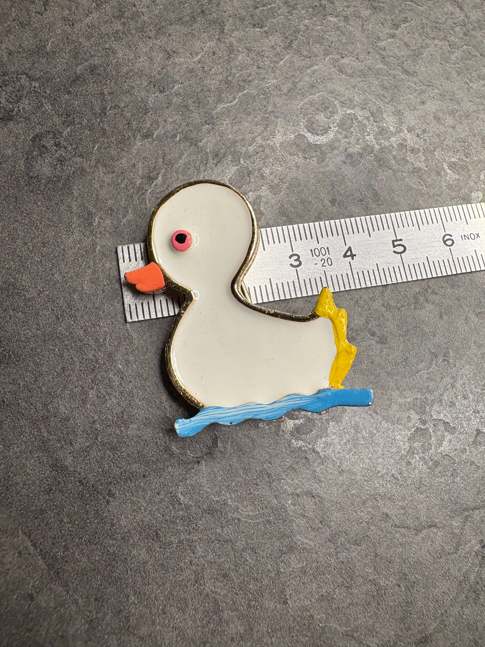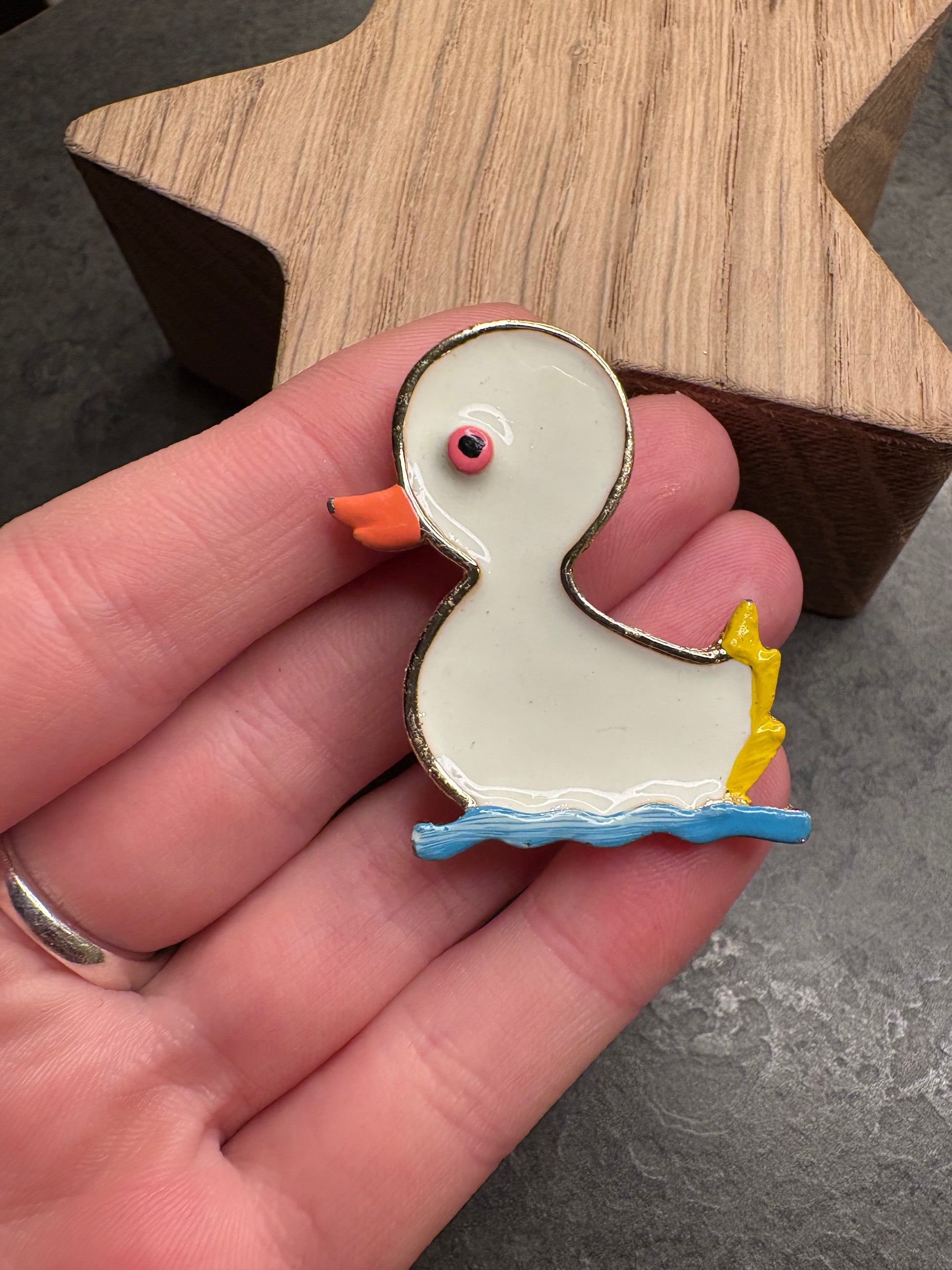 Si tratta di una rappresentazione stilizzata di un’anatra che nuota. Il corpo è bianco crema smaltato, con contorni e dettagli in metallo dorato,Il becco è arancione vivace. L’occhio è rosa con centro nero, che le dà un’espressione simpatica e un po’ cartoon. Alla base, una linea ondulata blu chiaro rappresenta l’acqua, con riflessi che simulano le onde.