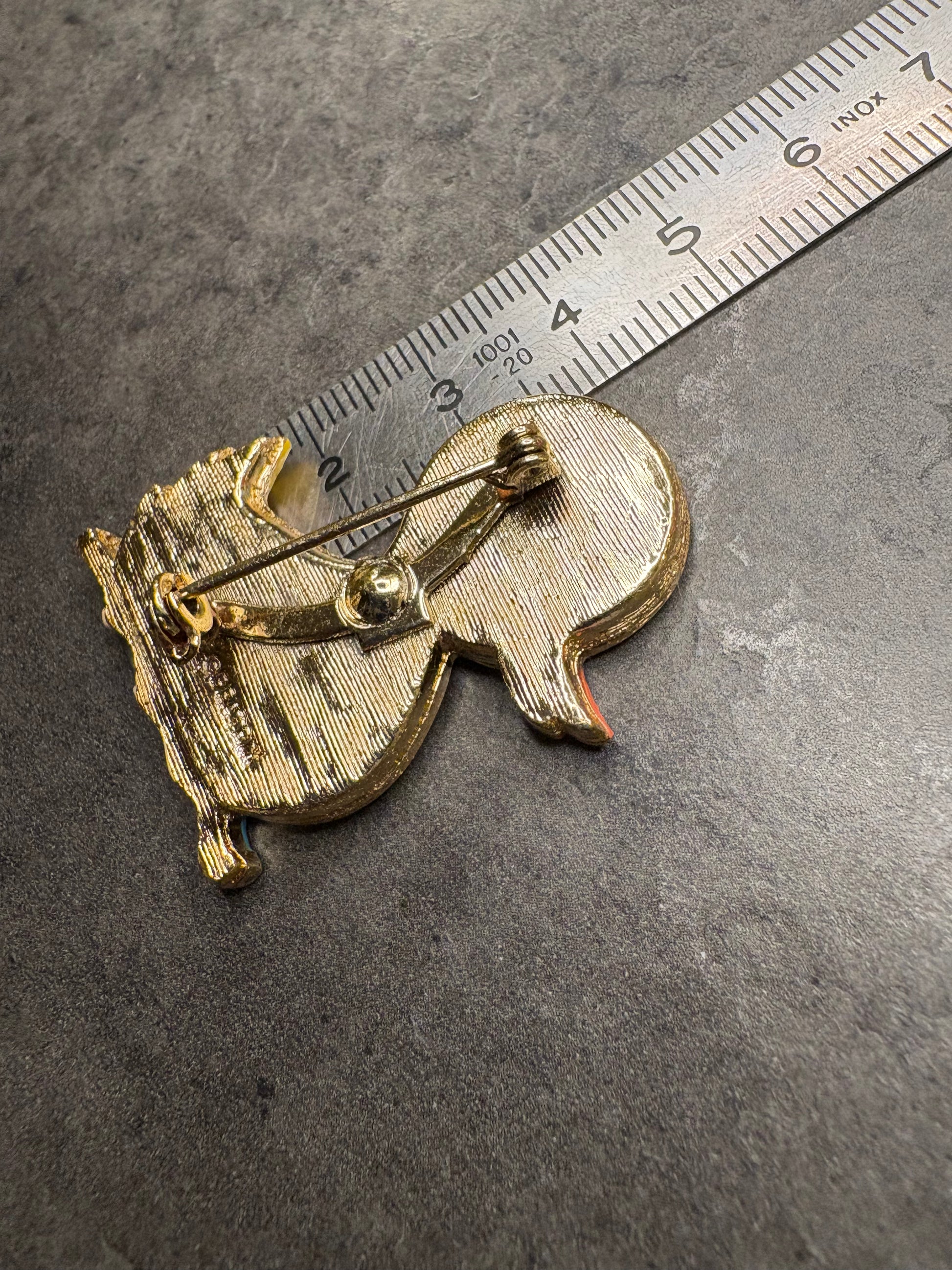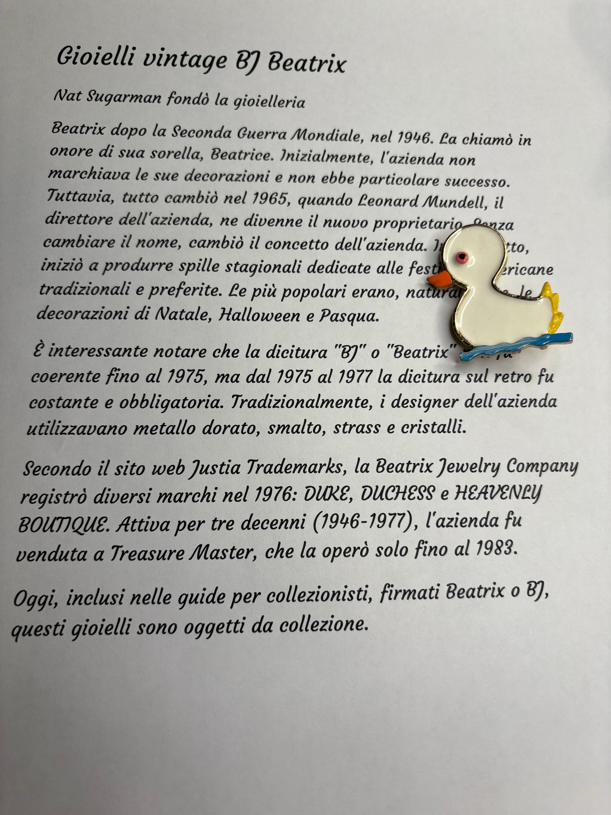 Questa è una deliziosa spilla vintage firmata Beatrix (o BJ Beatrix/Beau Jewels), un marchio americano di bigiotteria di alta qualità attiva principalmente tra gli anni ’60 e ’80, nota per i suoi pezzi smaltati a mano con motivi whimsy, animali e temi festivi.