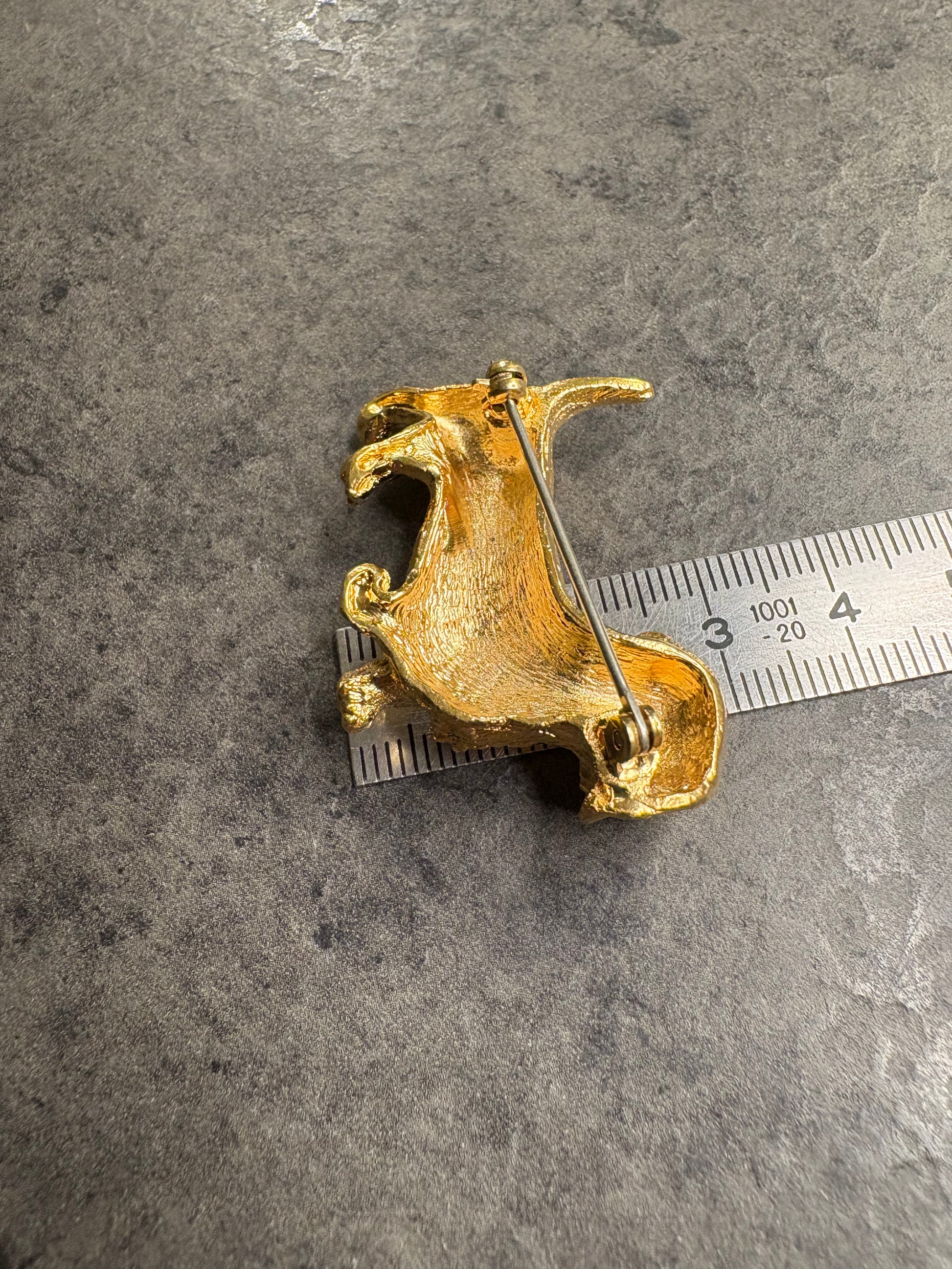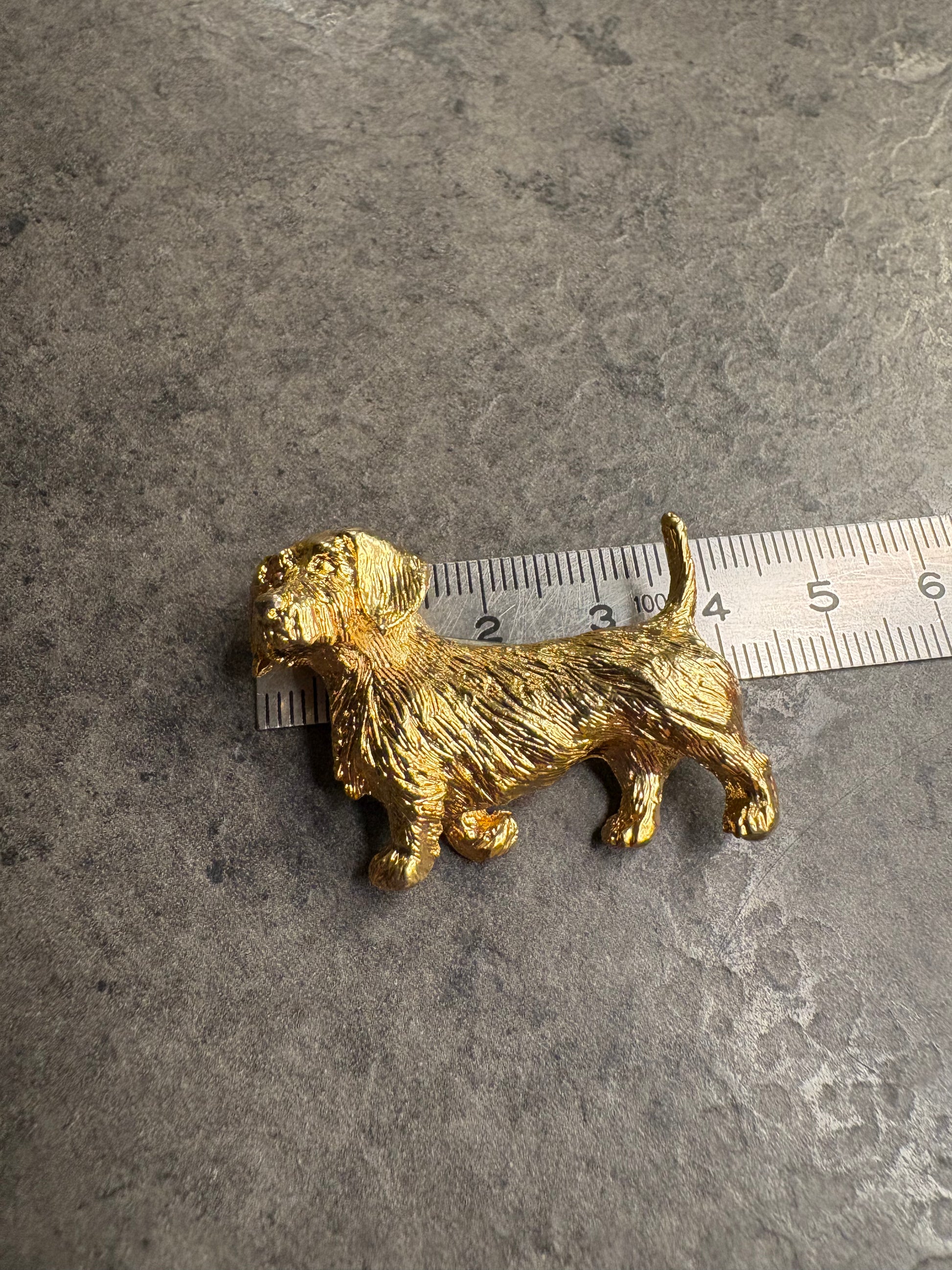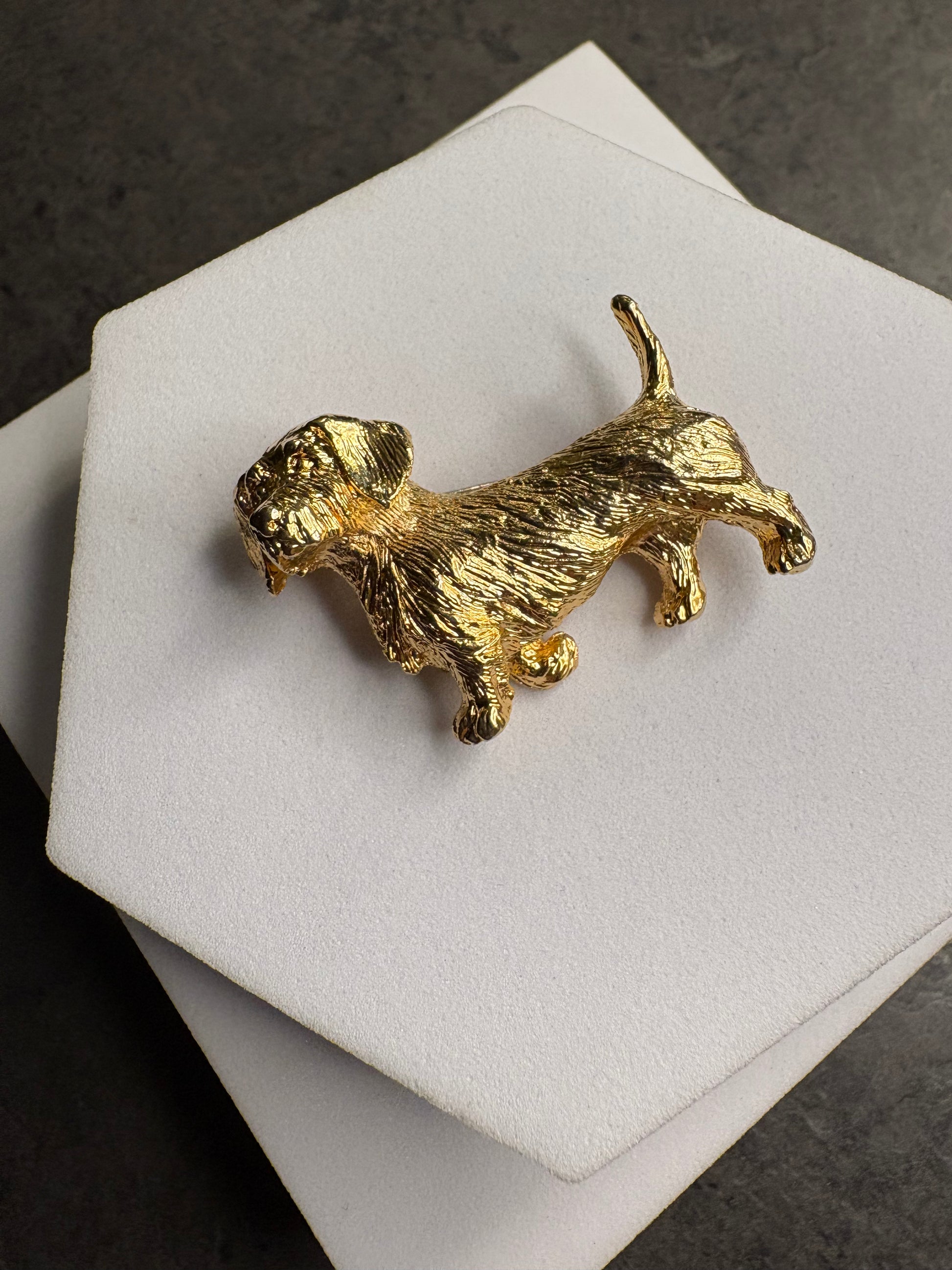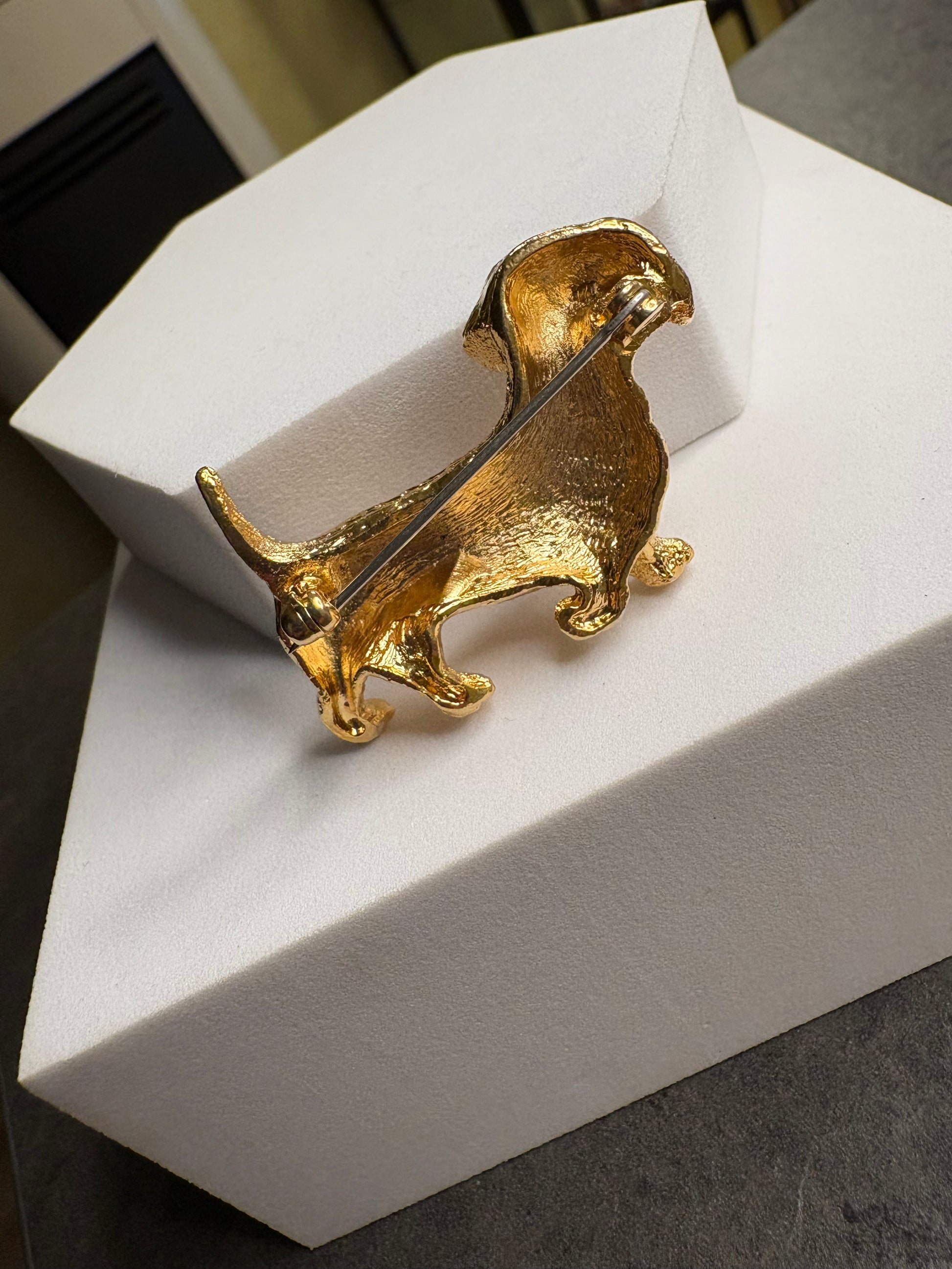 Bellissima spilla vintage a forma di cane in metallo dorato, modellata con grande attenzione ai dettagli del pelo e della postura, dall’aspetto molto realistico e brillante, ideale per dare un tocco originale e affettuoso a blazer, cappotti o borse.