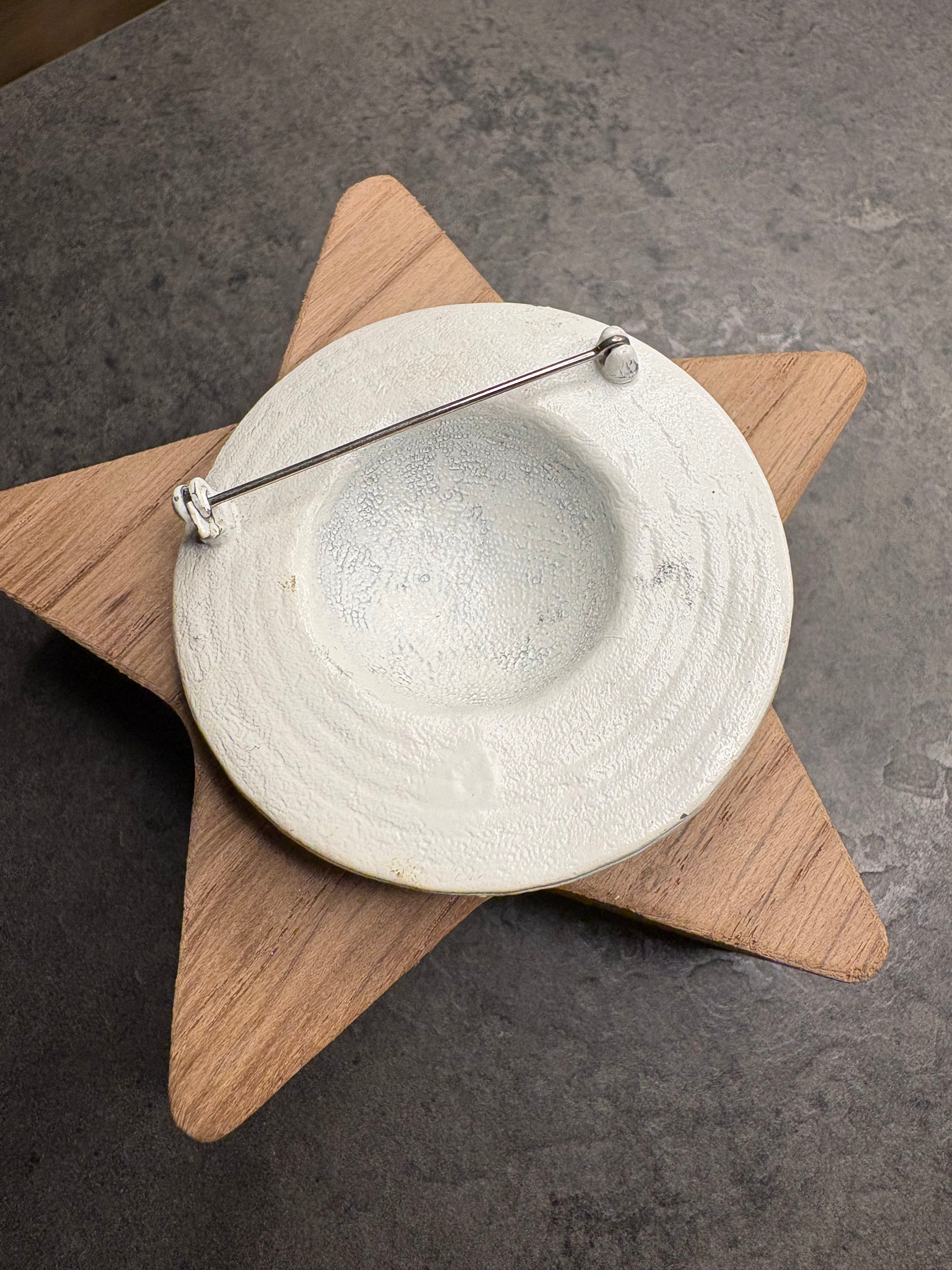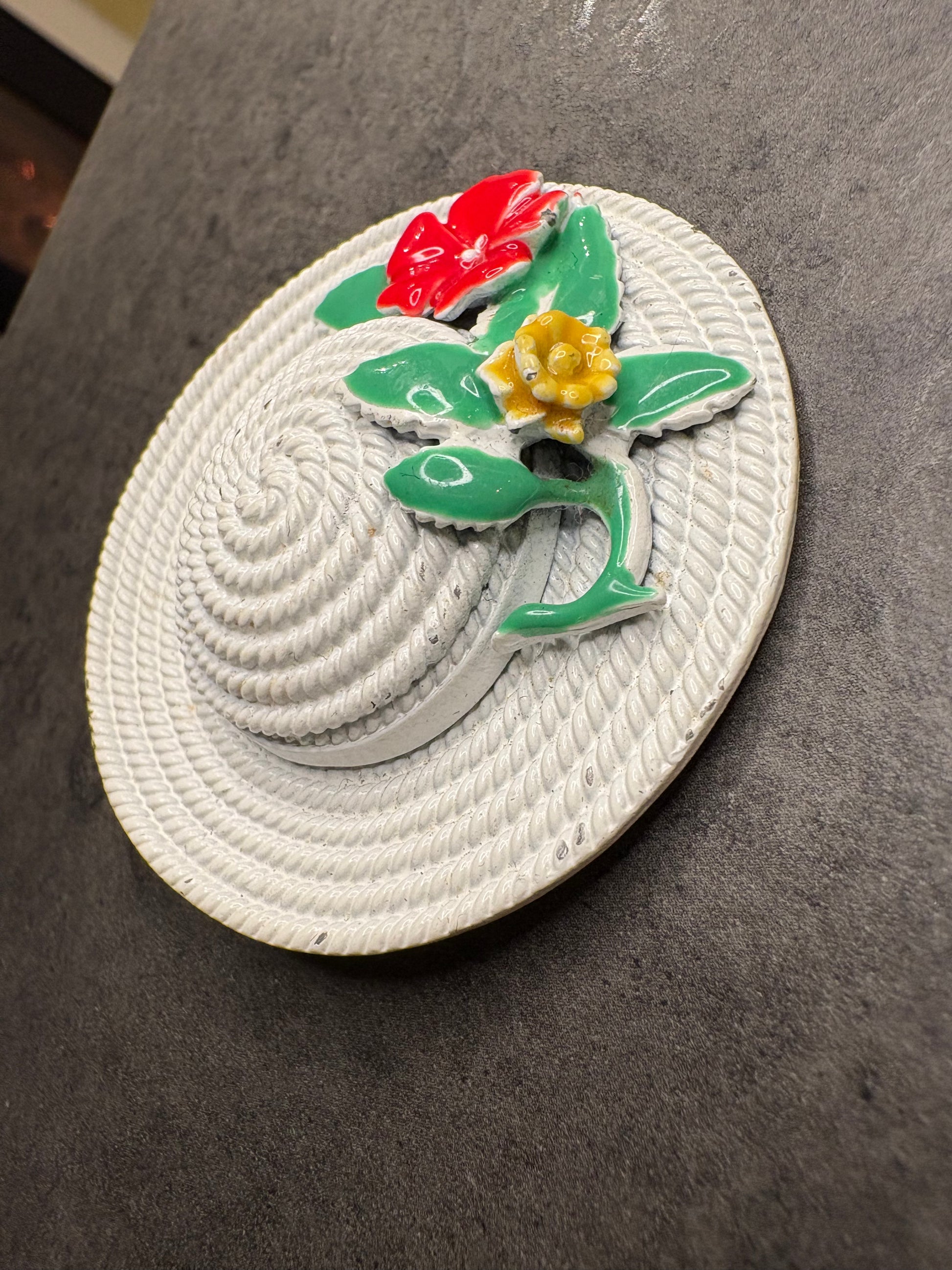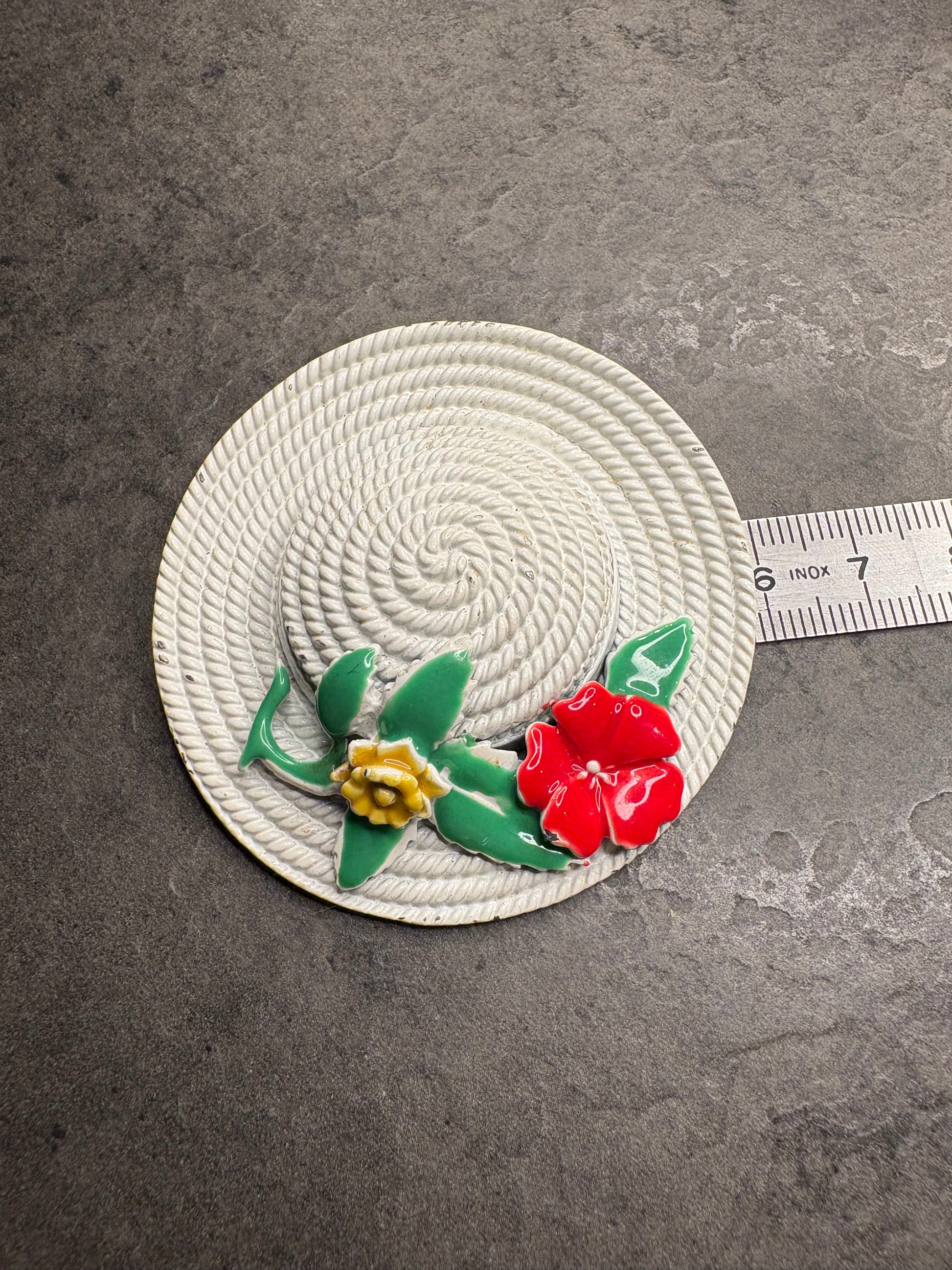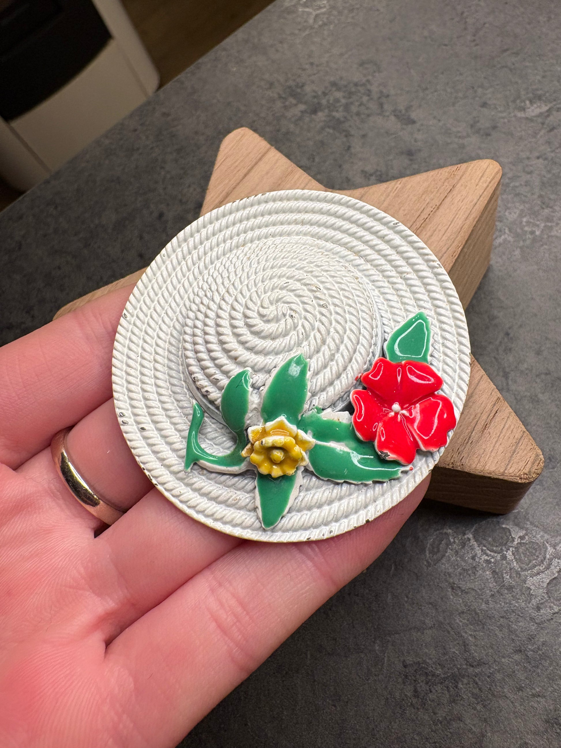 Bellissima spilla a forma di cappello, realizzata in metallo ricoperto di bianco con una lavorazione in rilievo che richiama l’intreccio della paglia. È impreziosita da elementi smaltati dai colori vivaci – verde, rosso e giallo – che raffigurano dettagli floreali, donando un tocco allegro e femminile al gioiello. La spilla ha una struttura solida ed è piuttosto pesante, caratteristica che la rende ideale per essere indossata su cappotti, blazer o giacche strutturate. Un accessorio scenografico e ricercato, dal gusto spiccatamente vintage.
