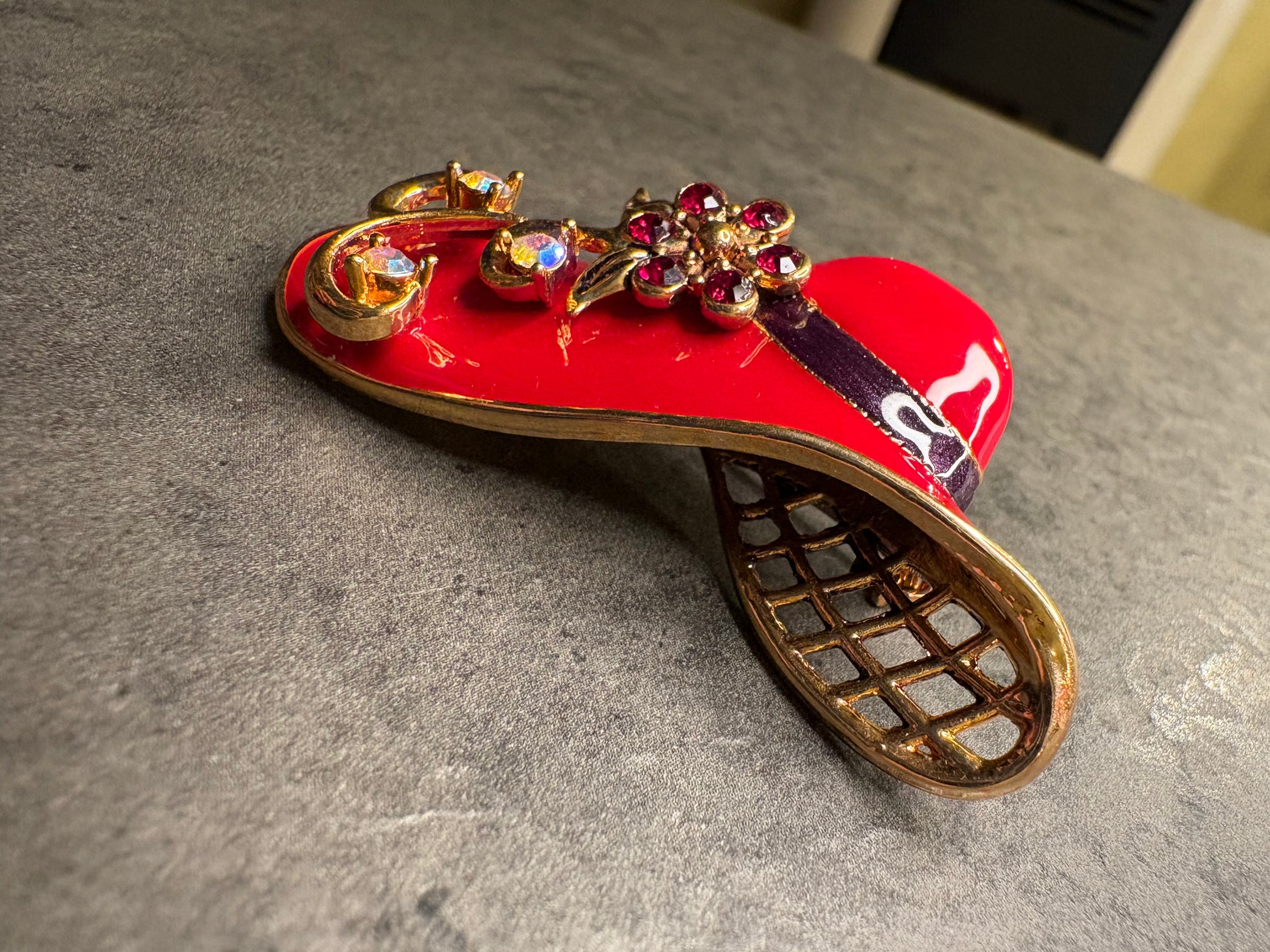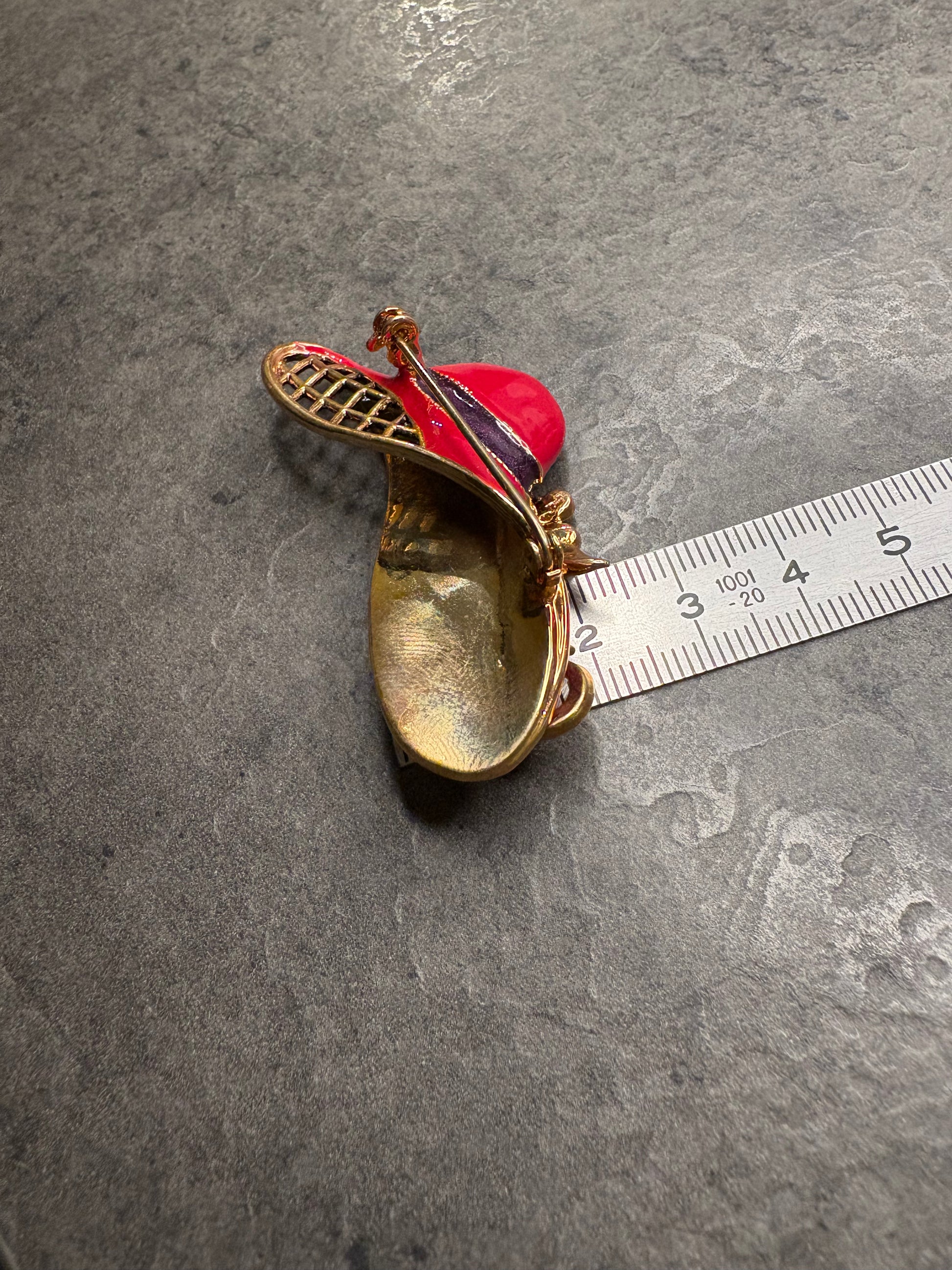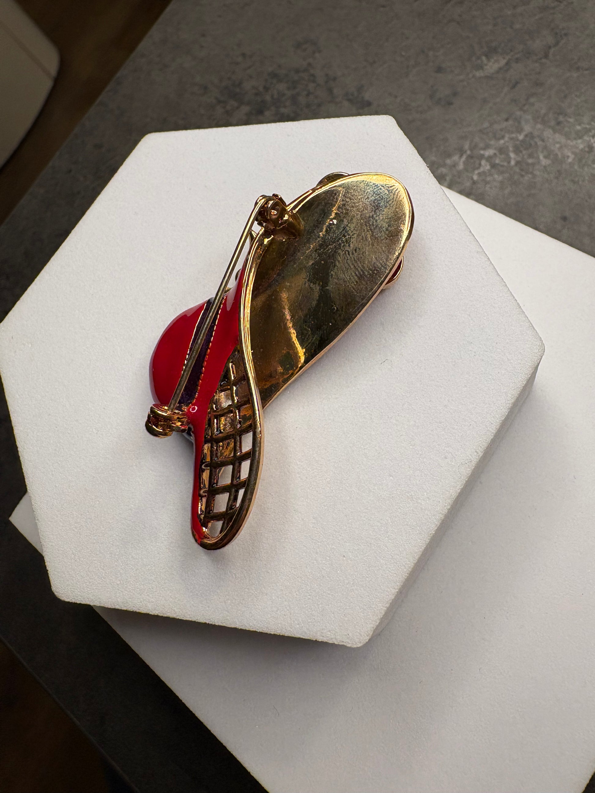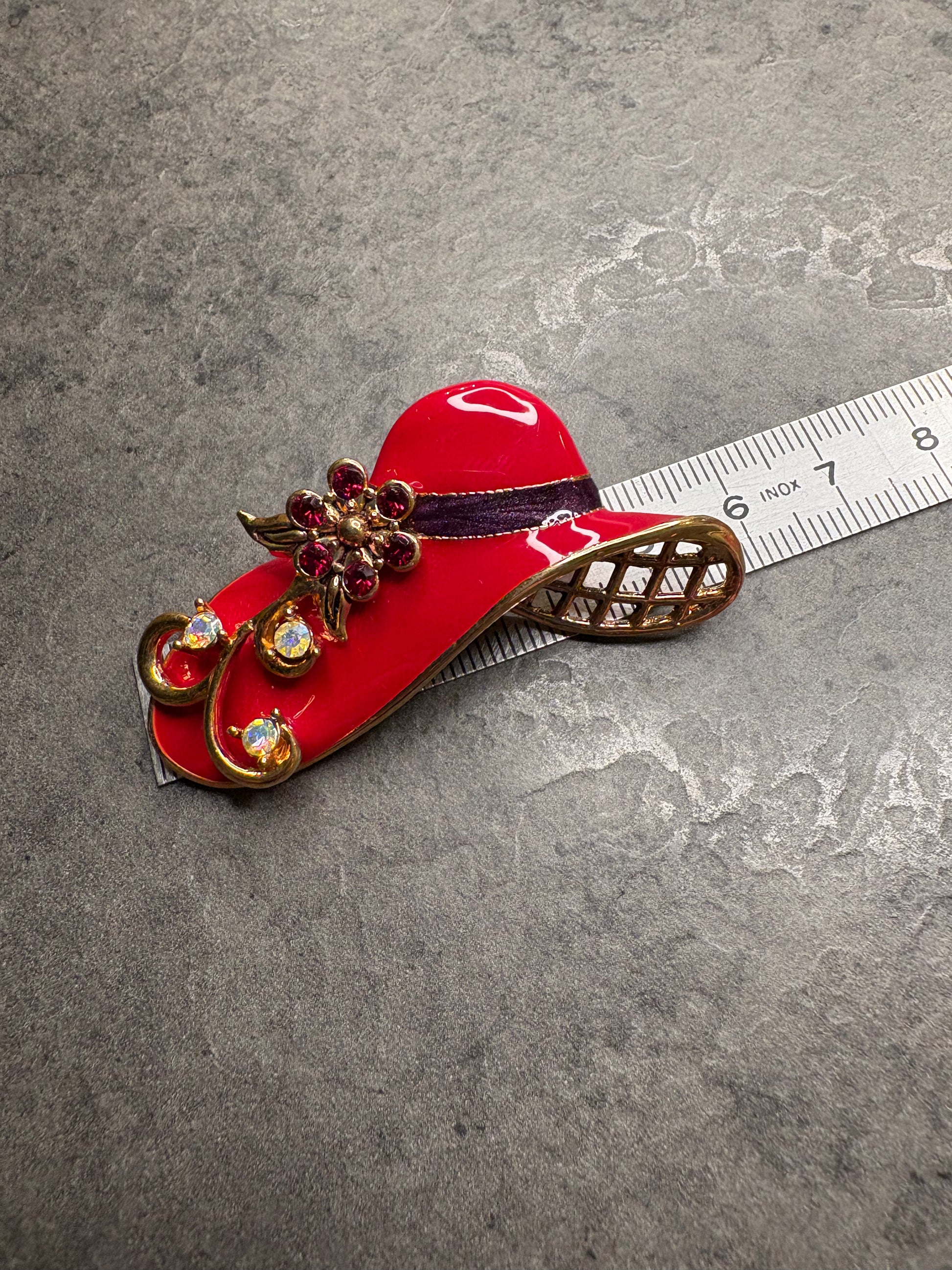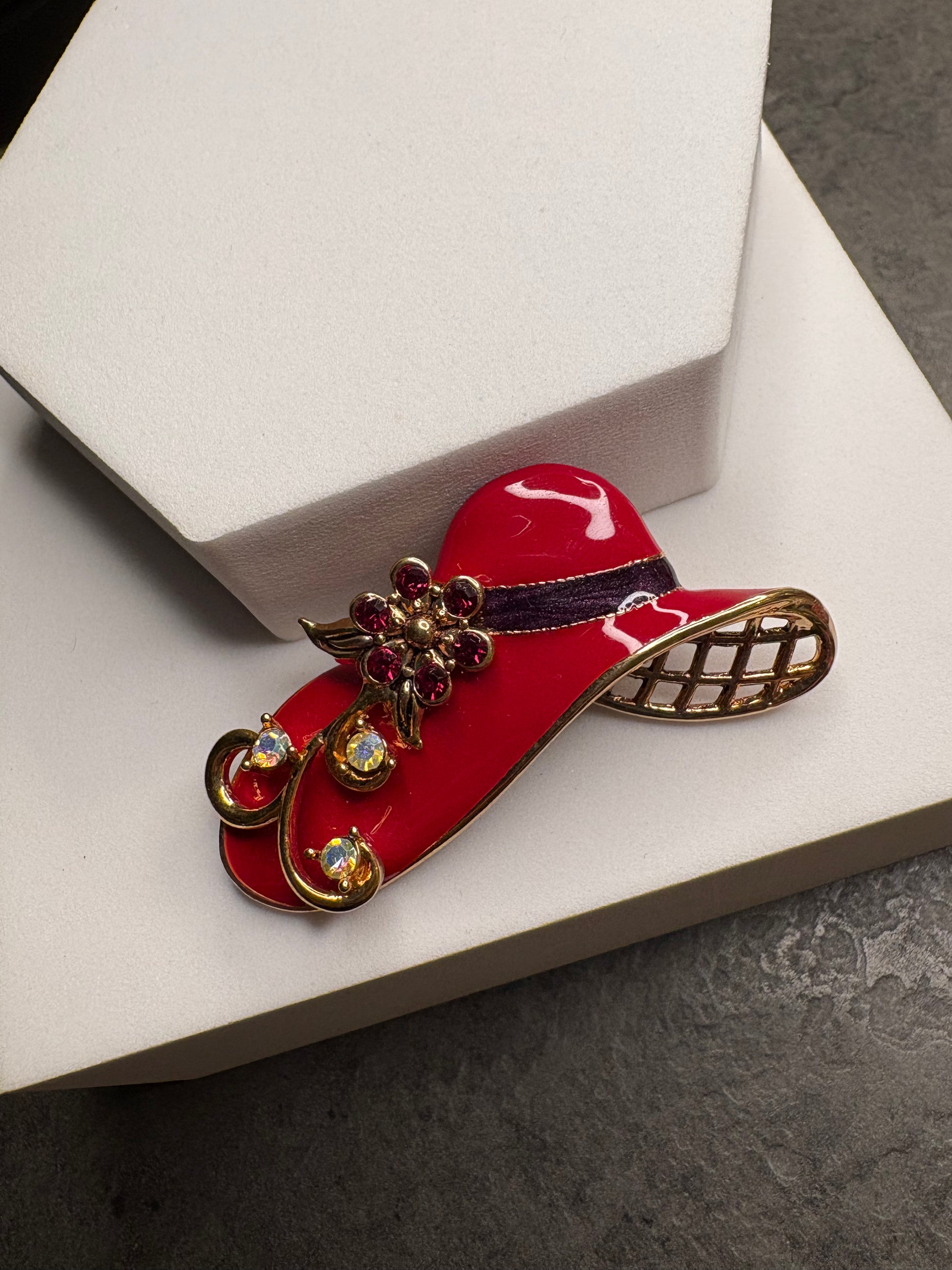 Questa deliziosa spilla a forma di cappello da donna è un gioiello raffinato e femminile creato da Avon nel 2004 “Fancy Hat”(non firmata ) realizzato in metallo dorato con smalto rosso brillante. Il cappello è impreziosito da cristalli Aurora Boreale, che riflettono la luce con delicati riflessi iridescenti, mentre il fiore decorativo è arricchito da cristalli rossi che aggiungono profondità e carattere al design. Una spilla scenografica, perfetta per dare personalità a giacche e cappotti.