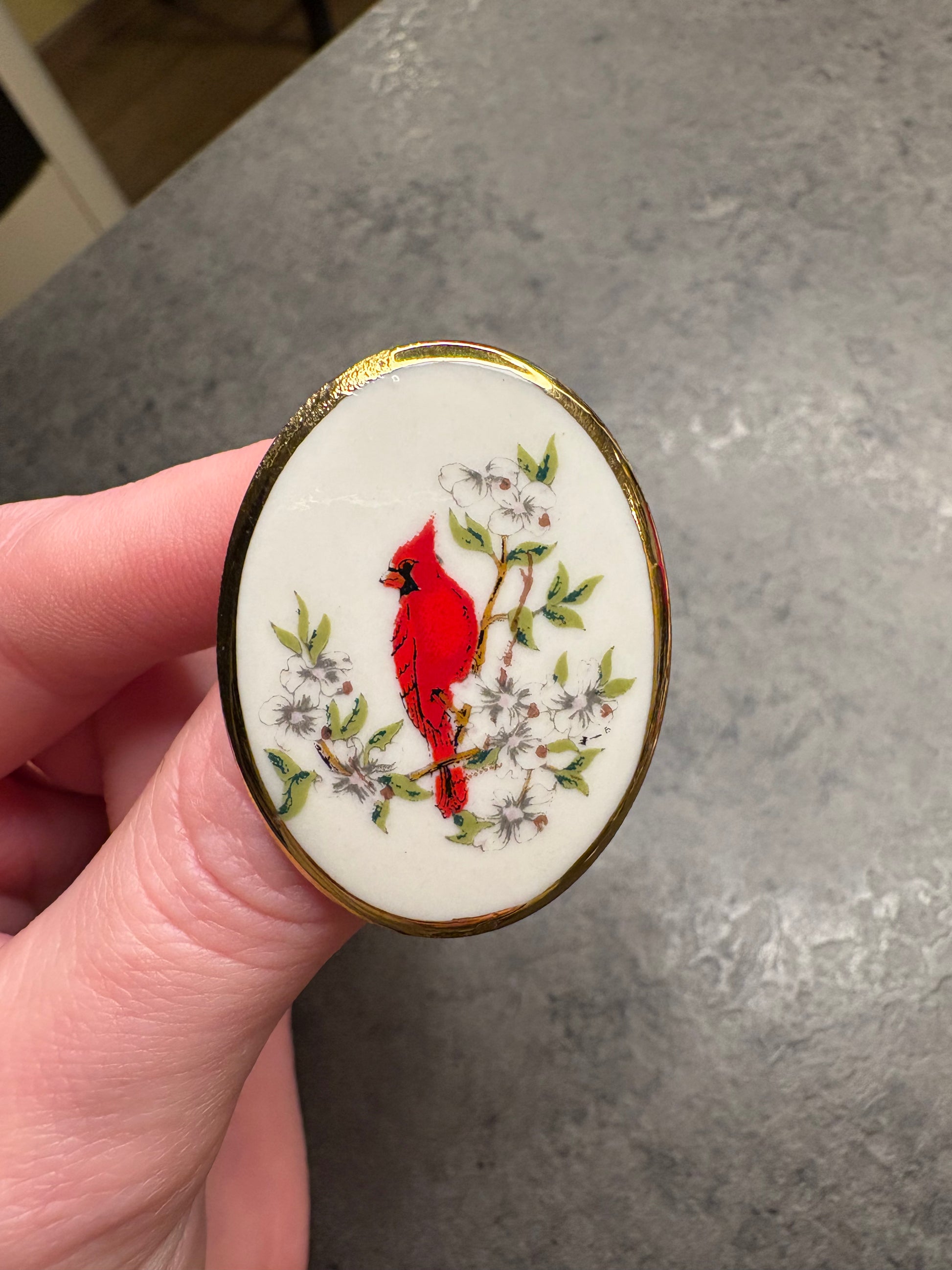 Di forma ovale, presenta una delicata decorazione dipinta a mano raffigurante un cardinale rosso posato su un ramo fiorito. Il contrasto tra il vivido rosso del piumaggio e il candore dei fiori bianchi dona equilibrio e armonia alla composizione, evocando un’eleganza naturale e poetica.