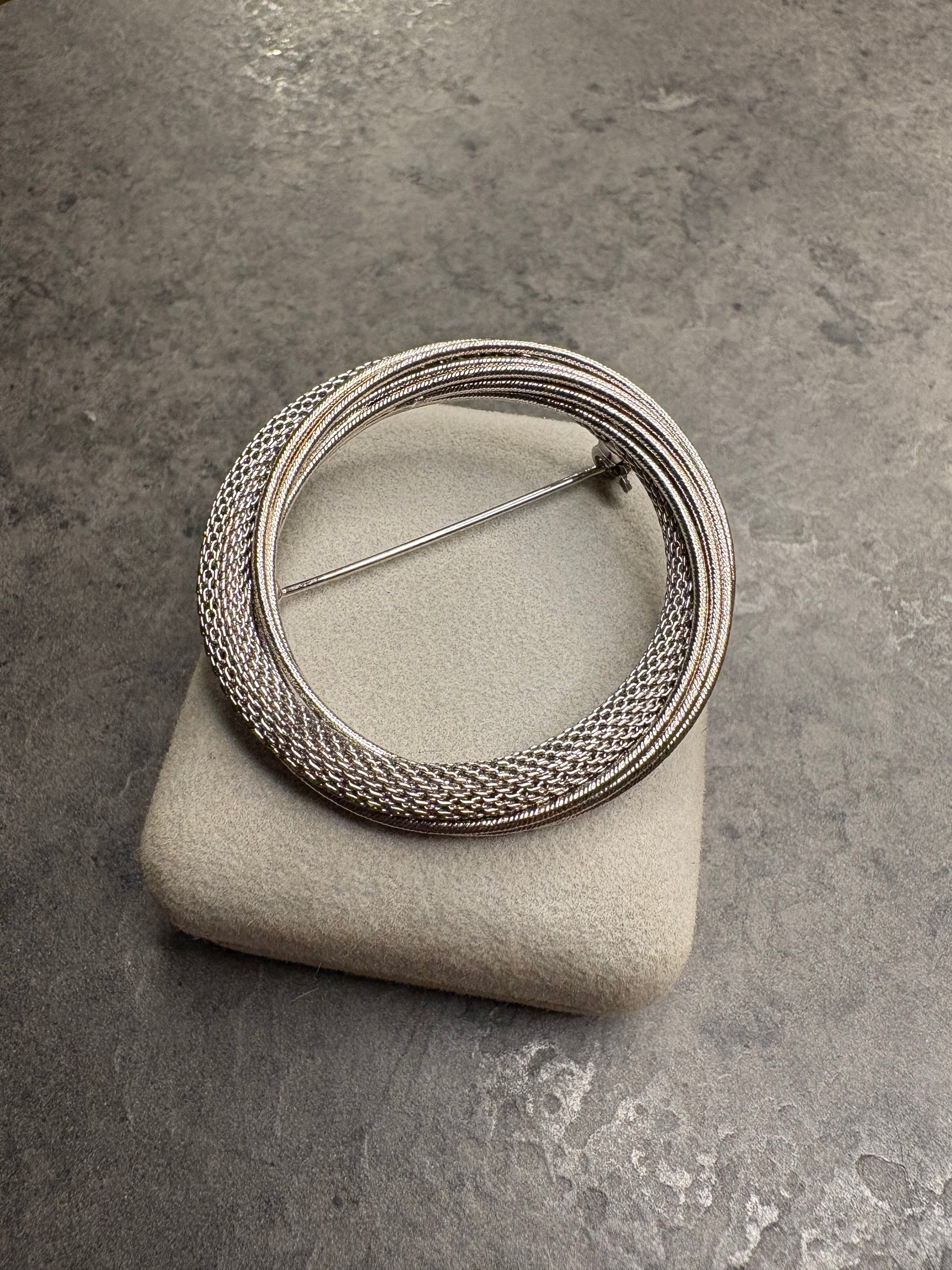 Questa spilla vintage in metallo color argento è un raffinato esempio di gioielleria di design essenziale e senza tempo.