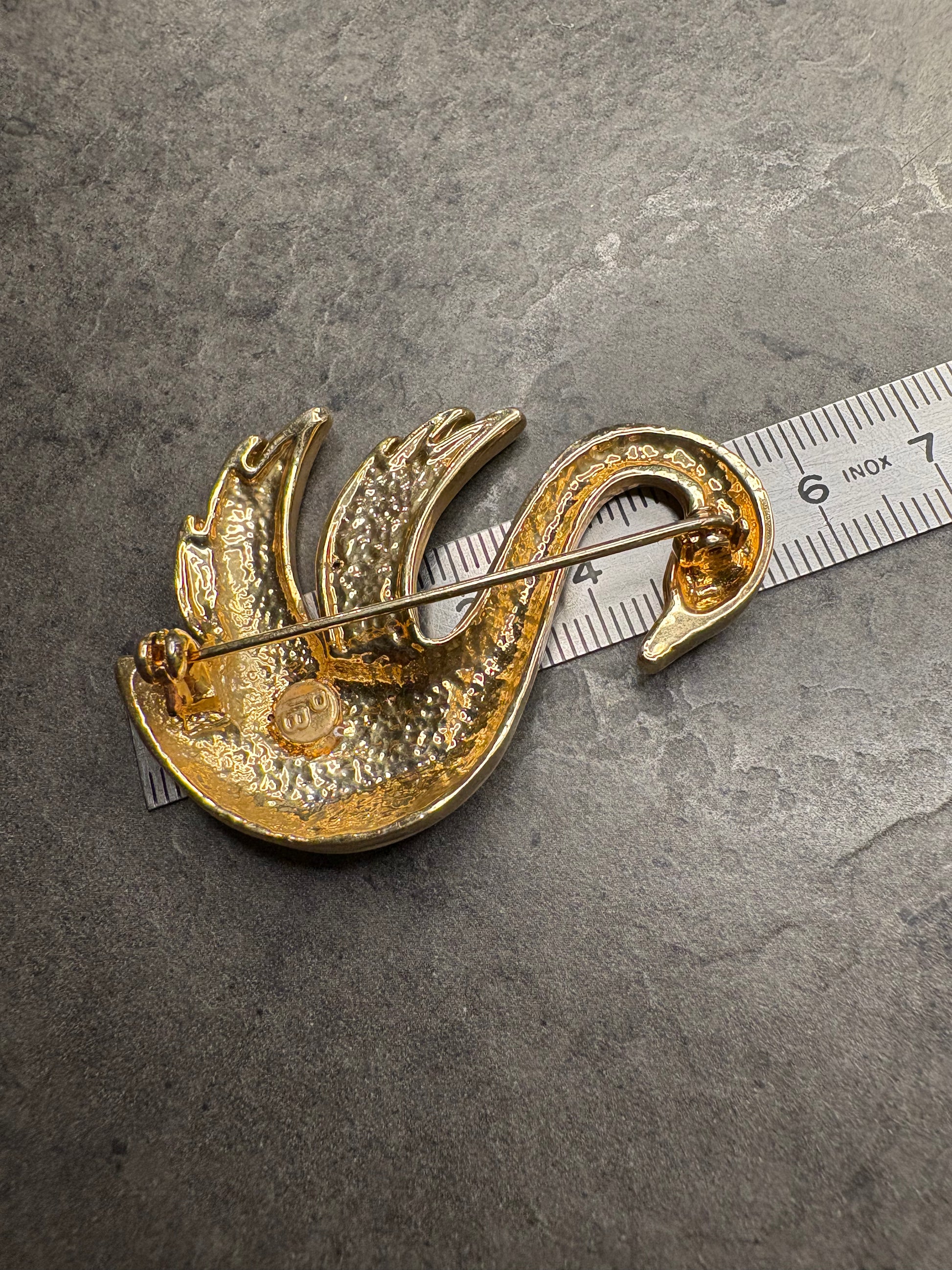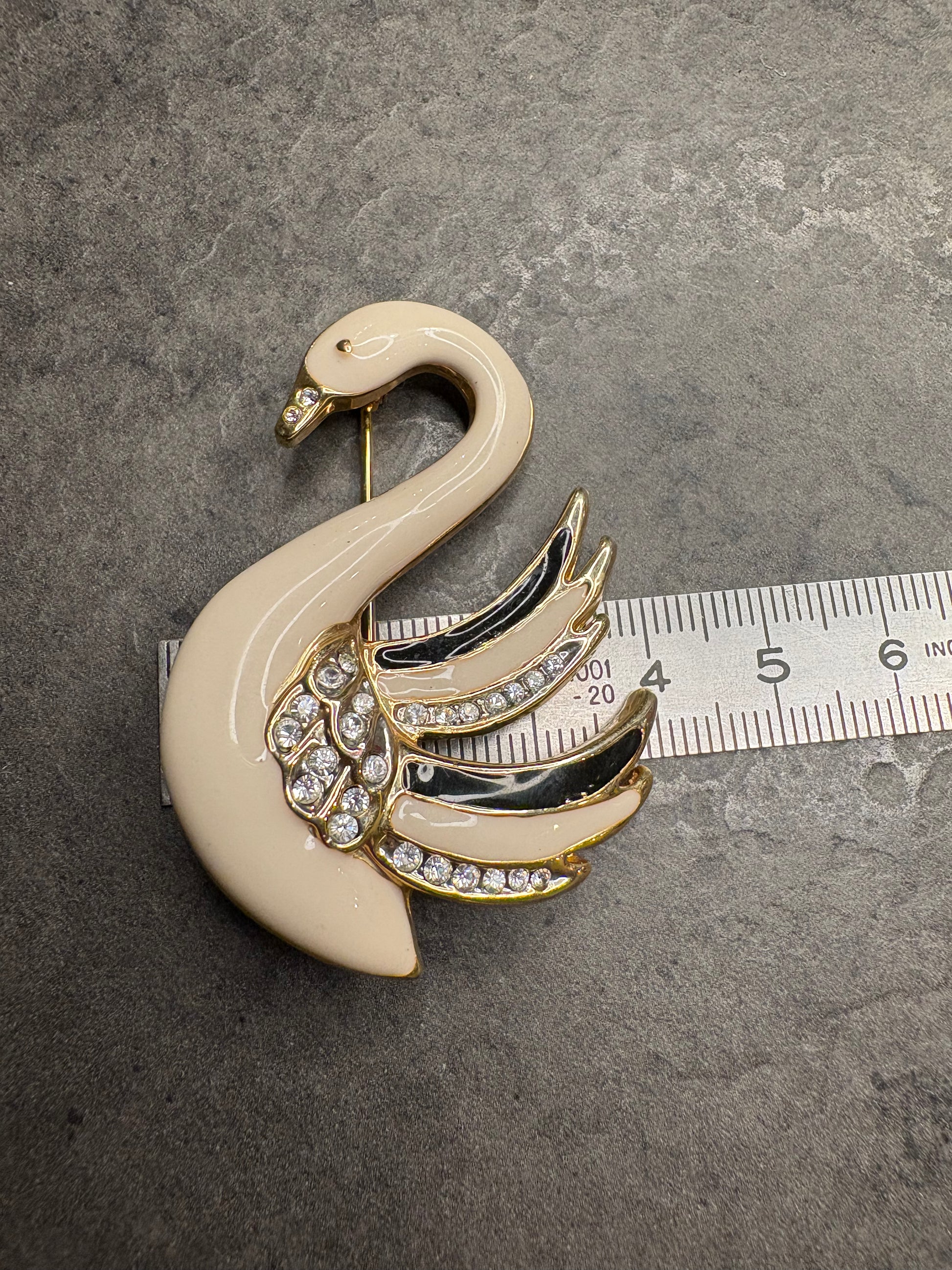 Elegante spilla a forma di cigno firmata PB, realizzata con grande attenzione ai dettagli. Il corpo è rivestito da smalto color avorio e nero, liscio e luminoso, mentre le ali sono impreziosite da cristalli bianchi incastonati in montatura dorata, che donano brillantezza e contrasto. Le linee morbide e sinuose del cigno evocano grazia e raffinatezza, rendendo questa spilla un classico intramontabile della gioielleria vintage da collezione.