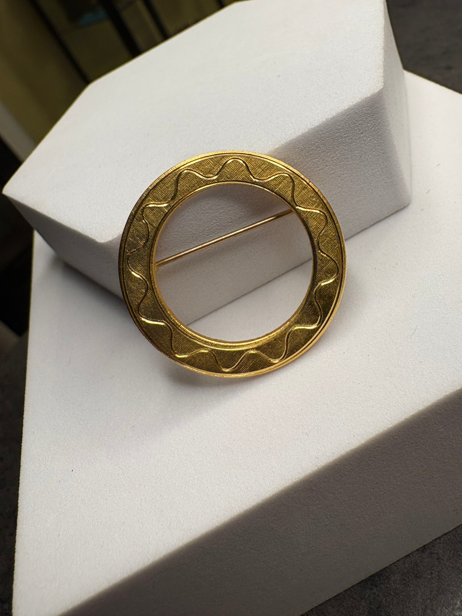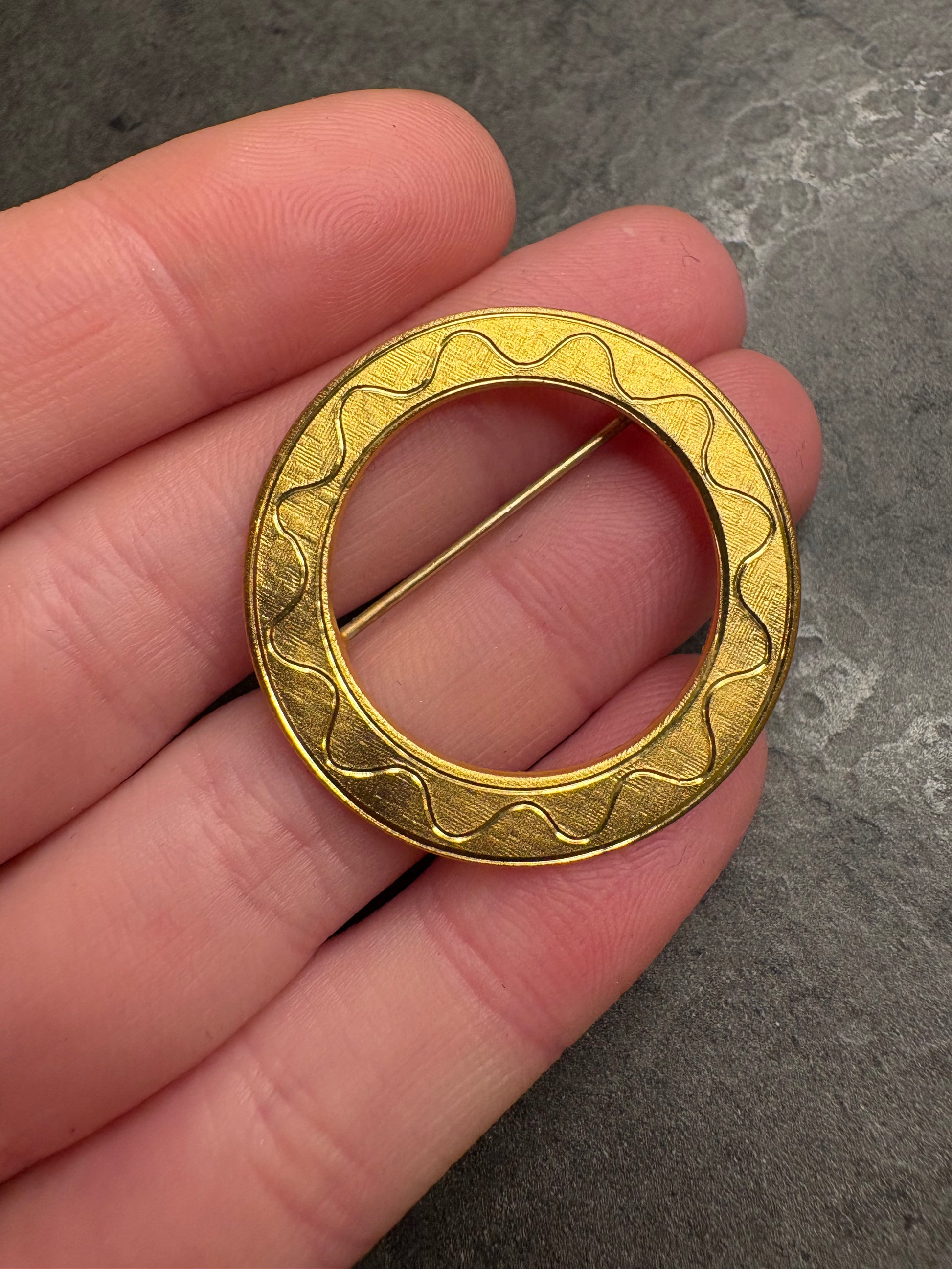 Questa spilla vintage tonda in metallo color oro è un modello classico ed essenziale, caratterizzato da una forma circolare pulita e senza tempo. La superficie dorata, impreziosita da una delicata lavorazione decorativa, le conferisce un’eleganza sobria e versatile. È una spilla facile da abbinare, adatta sia a look quotidiani sia a contesti più formali, un vero passe-partout del bijoux vintage.