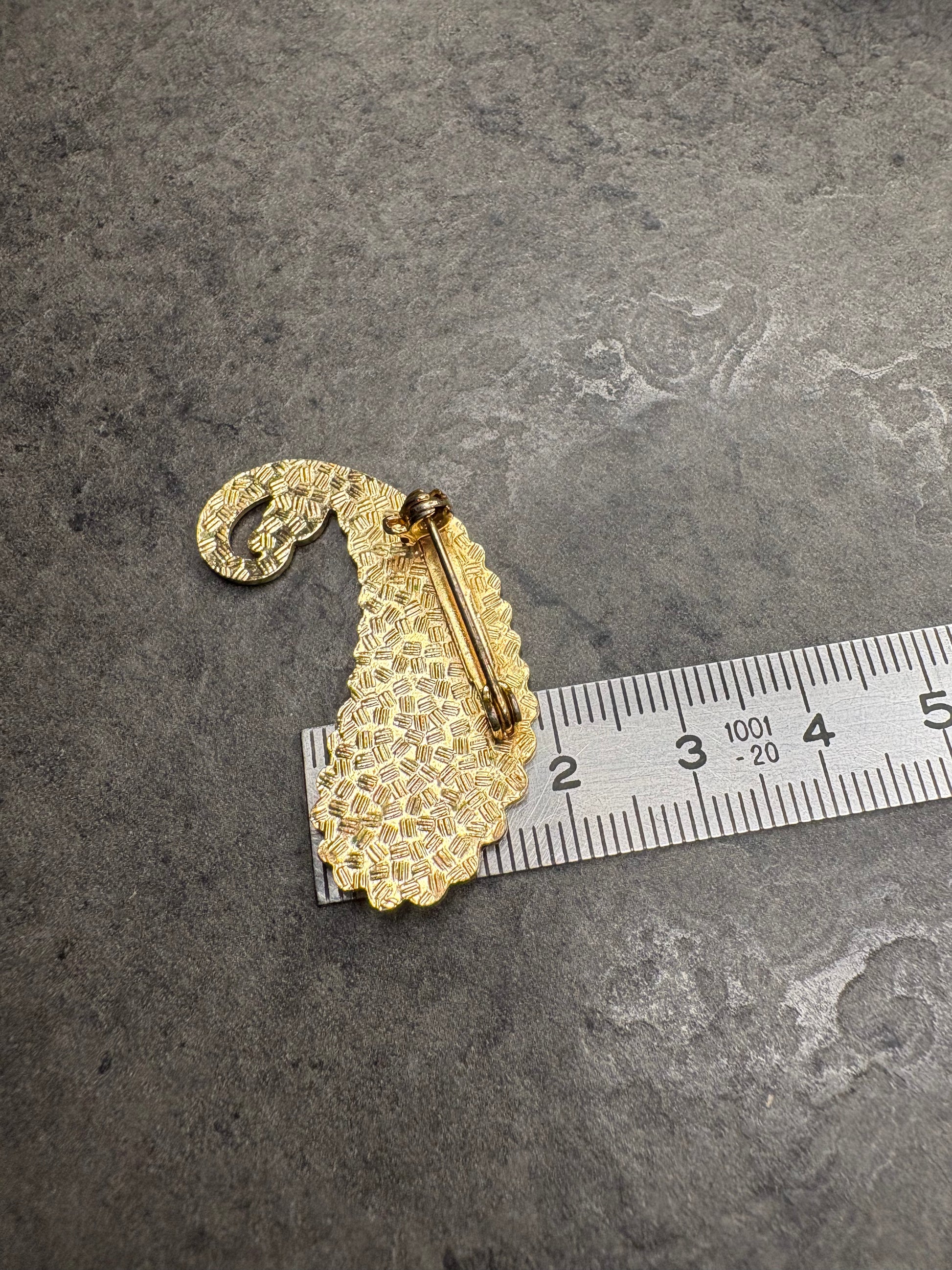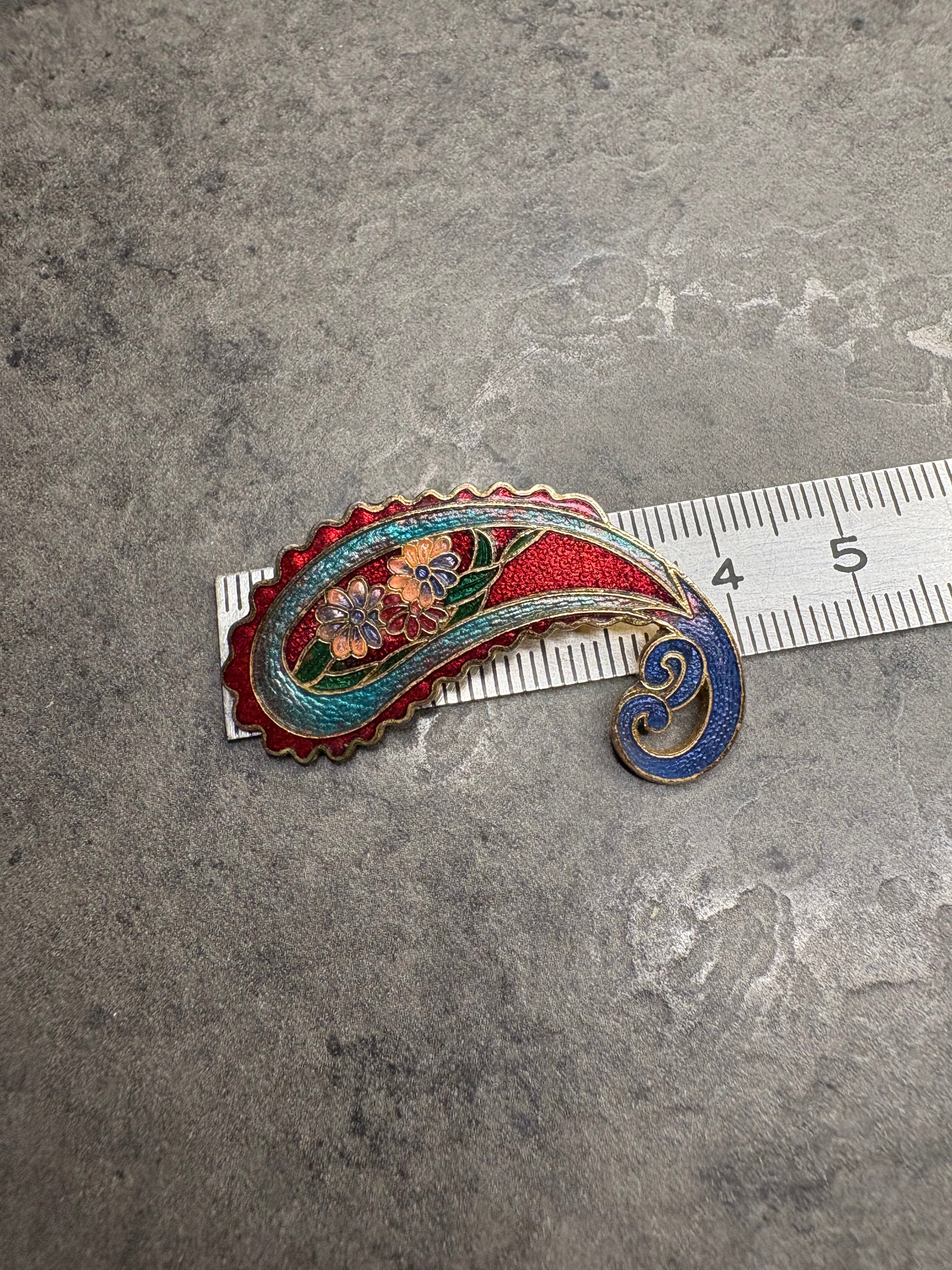 Questa spilla vintage è un piccolo capolavoro di smalti e colori, ispirato al celebre motivo paisley, simbolo di eleganza e raffinatezza fin dall’Ottocento.