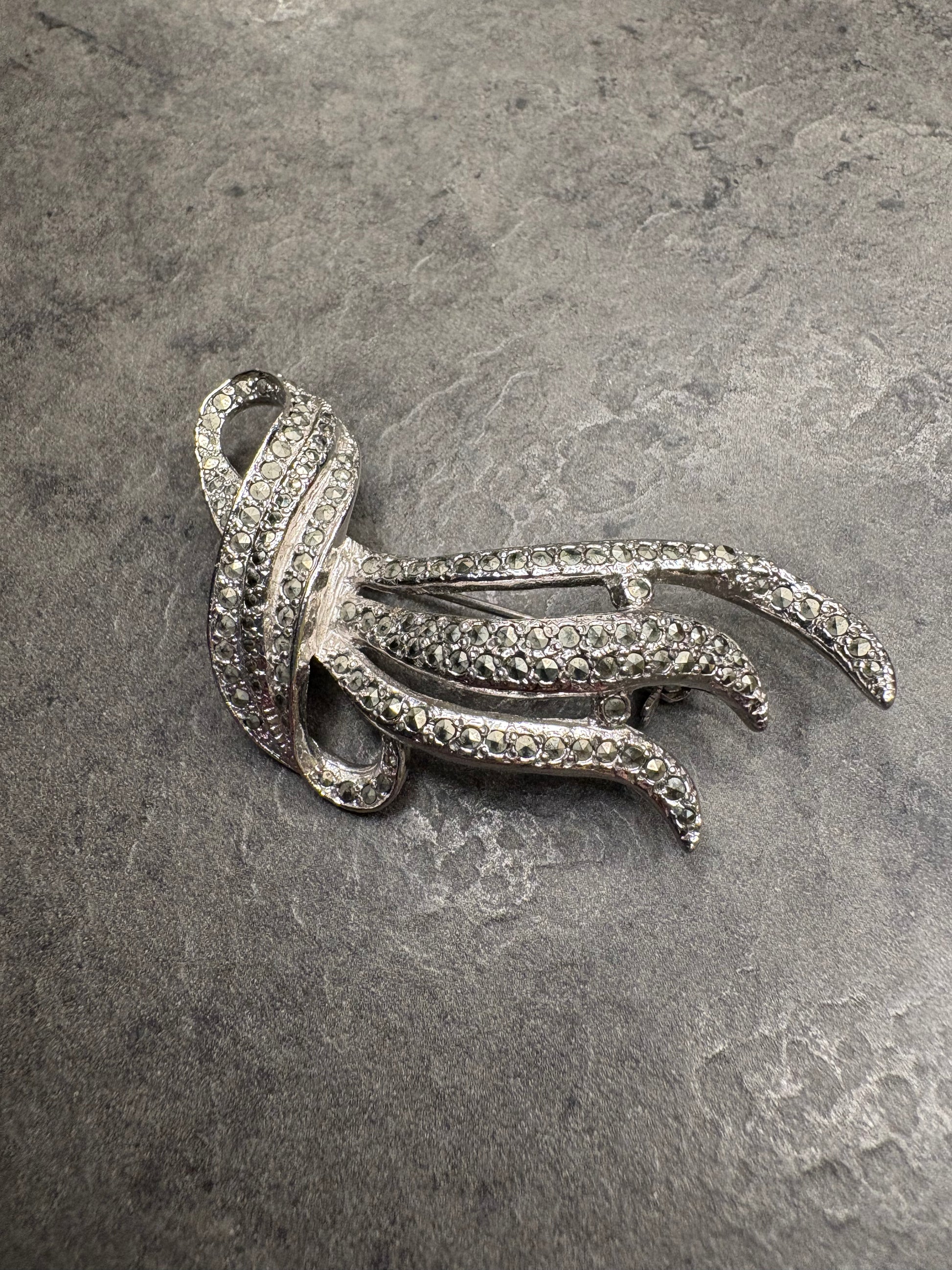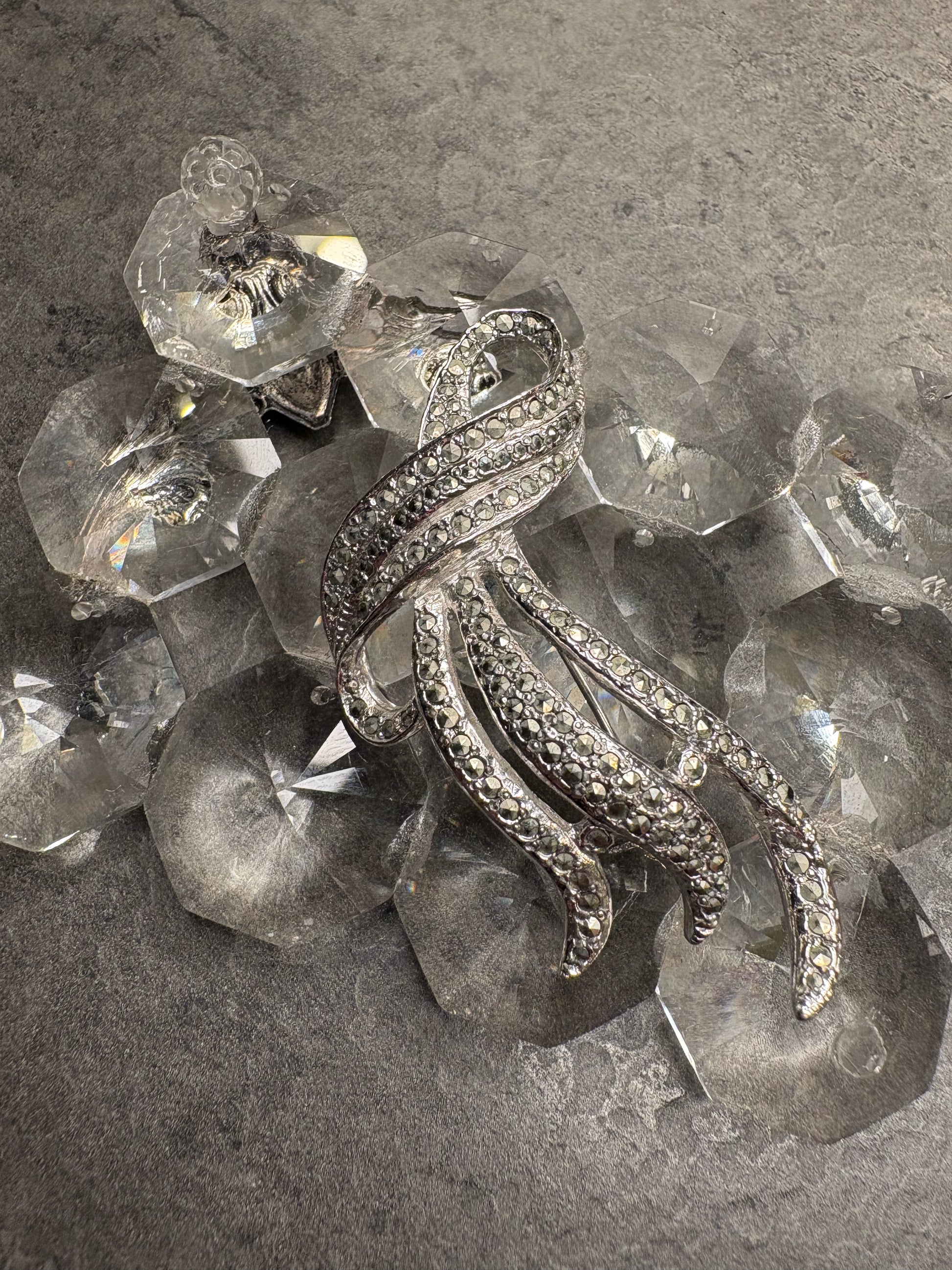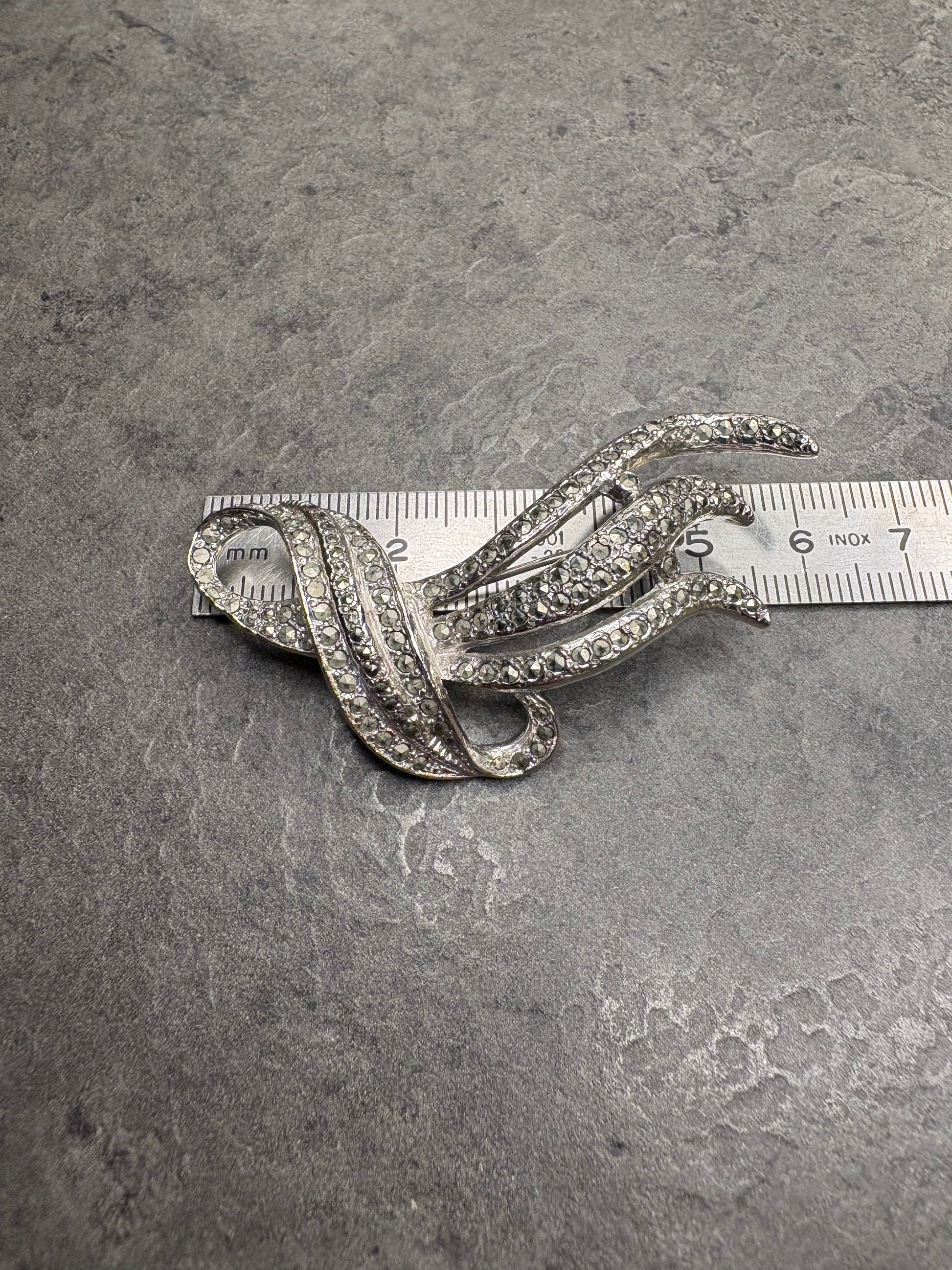 Questa splendida spilla vintage in metallo argentato è interamente decorata da scintillanti marcasiti, che regalano un effetto luminoso ed elegante. Il design sinuoso e raffinato, con linee morbide che si intrecciano in un movimento armonioso, la rende un accessorio ricco di fascino rétro. Un gioiello prezioso e senza tempo, perfetto per aggiungere un tocco di classe a giacche, scialli o abiti da sera.