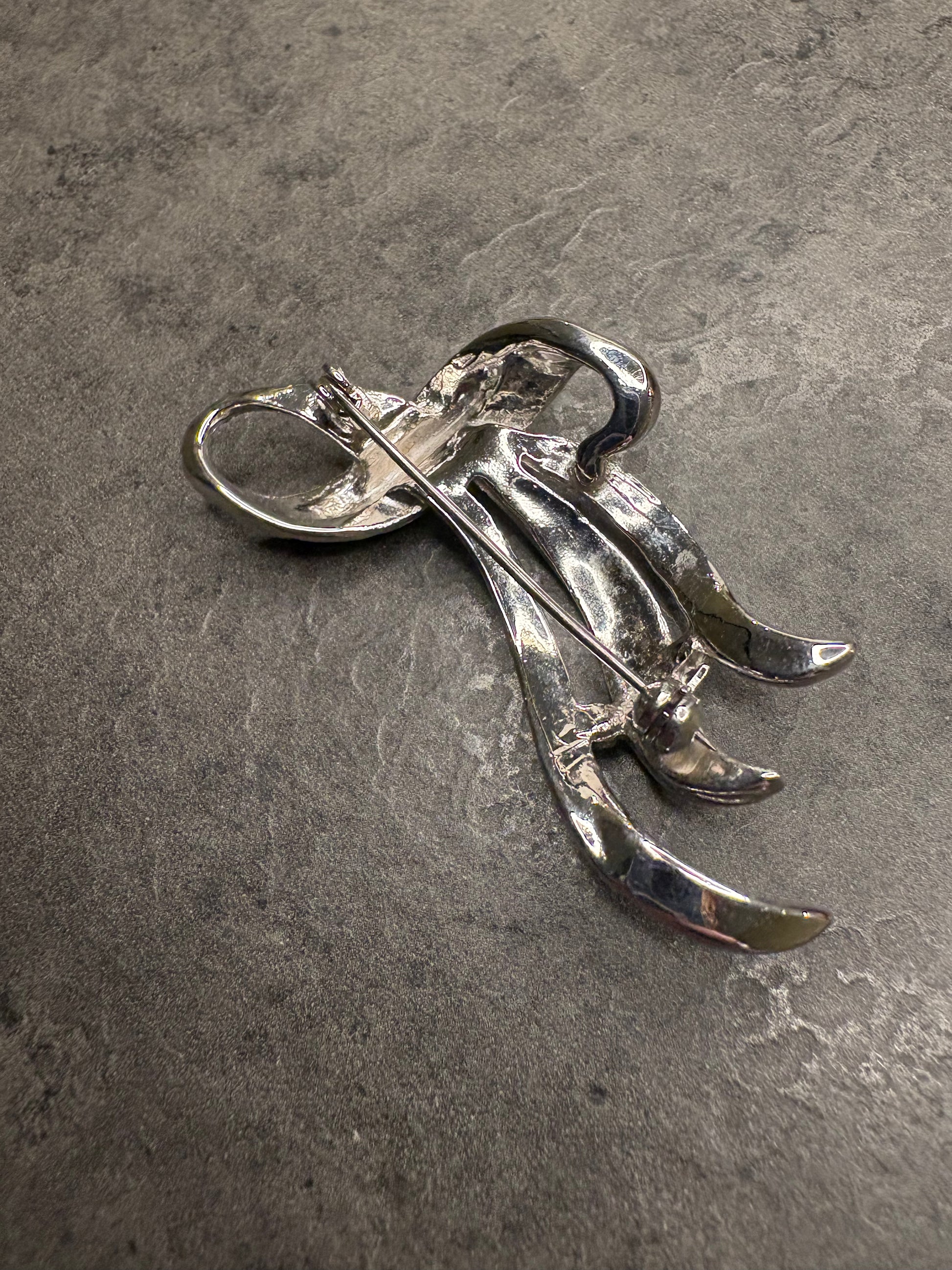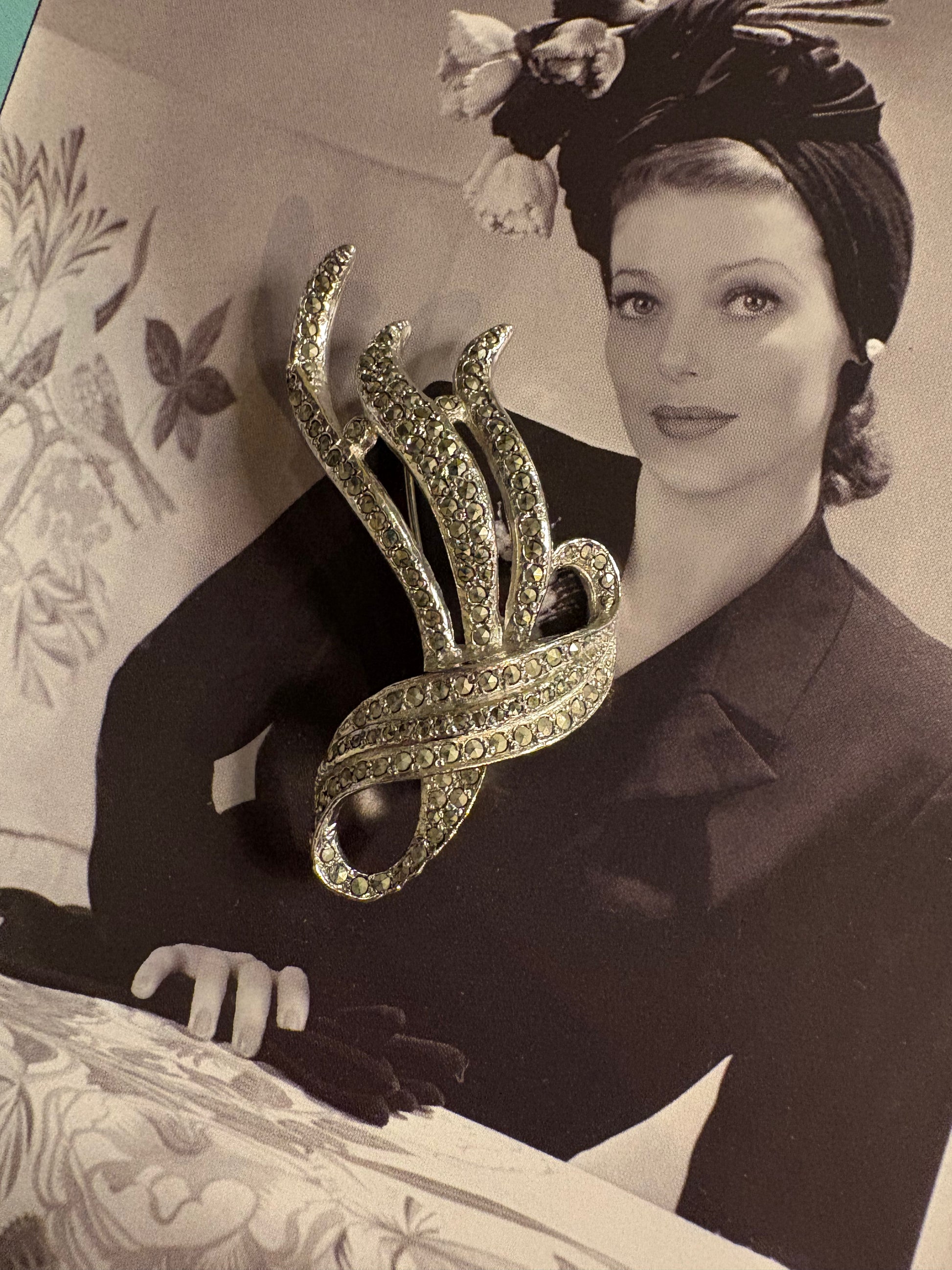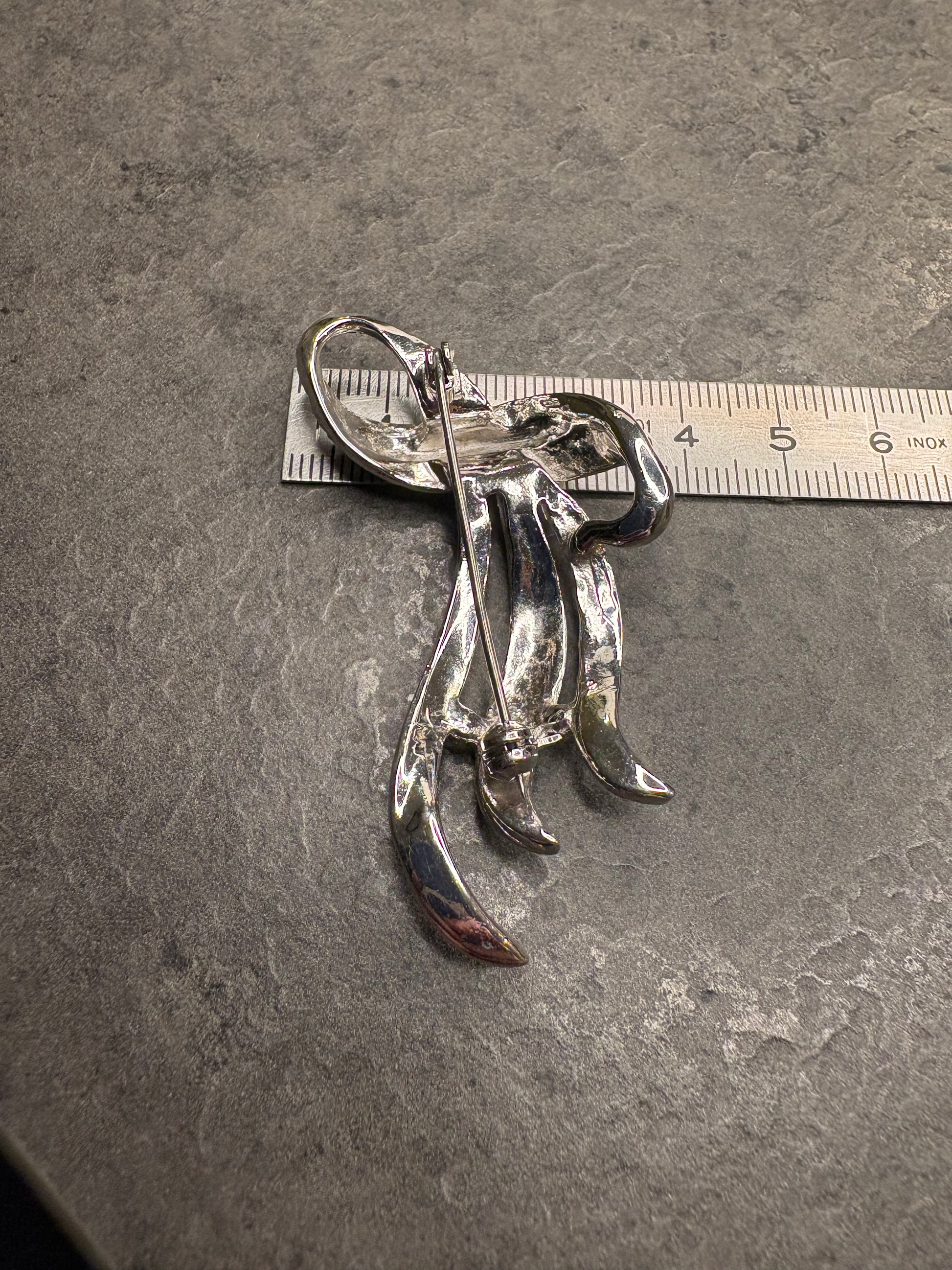 Questa splendida spilla vintage in metallo argentato è interamente decorata da scintillanti marcasiti, che regalano un effetto luminoso ed elegante. Il design sinuoso e raffinato, con linee morbide che si intrecciano in un movimento armonioso, la rende un accessorio ricco di fascino rétro. Un gioiello prezioso e senza tempo, perfetto per aggiungere un tocco di classe a giacche, scialli o abiti da sera.