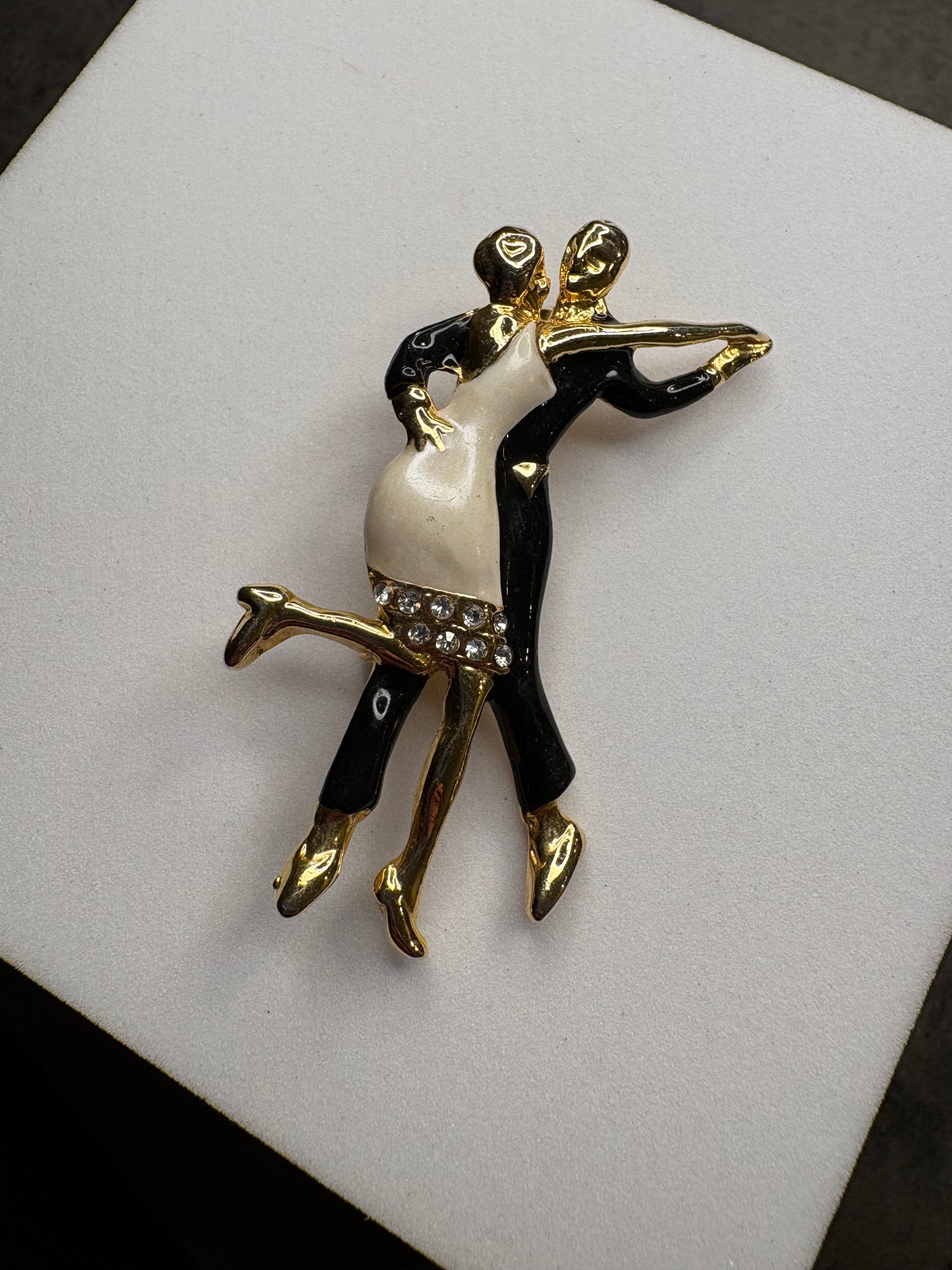 Bellissima spilla vintage raffigurante una coppia che balla, realizzata in metallo color oro con dettagli in smalto nero e chiaro. La figura è dinamica e stilizzata, con la donna in abito chiaro impreziosito, nella parte inferiore, da due file di cristalli trasparenti che simulano movimento e brillantezza. Un pezzo romantico e scenografico, capace di raccontare eleganza e fascino senza tempo.