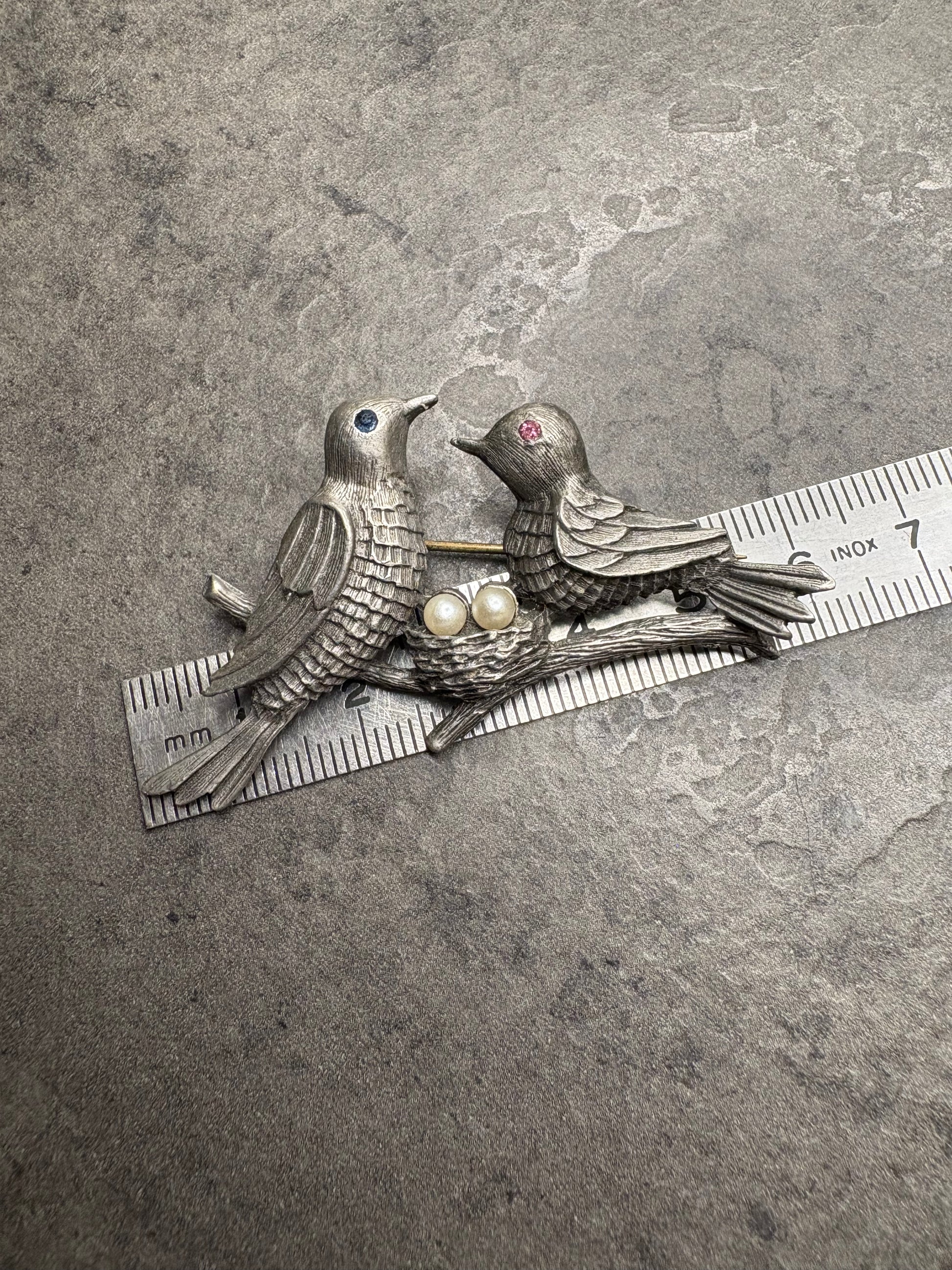 Questa meravigliosa spilla vintage “Coppia di uccelli con nido”, realizzata in metallo color argento con una raffinata lavorazione a rilievo che mette in evidenza il piumaggio e la corteccia del ramo. La composizione raffigura due uccellini posati attorno a un piccolo nido centrale, al cui interno due perle rappresentano simbolicamente le uova. Il maschio è impreziosito da un cristallo blu come occhio, mentre la femmina presenta un cristallo rosa, delicato dettaglio cromatico che dona vivacità e tenerezza alla scena. Una spilla dal forte valore simbolico, romantica e molto decorativa.